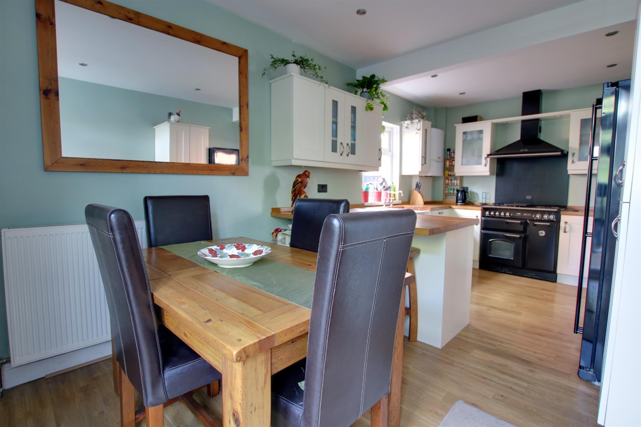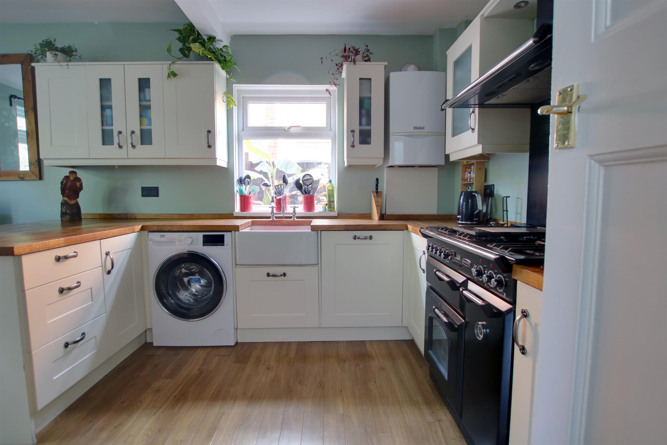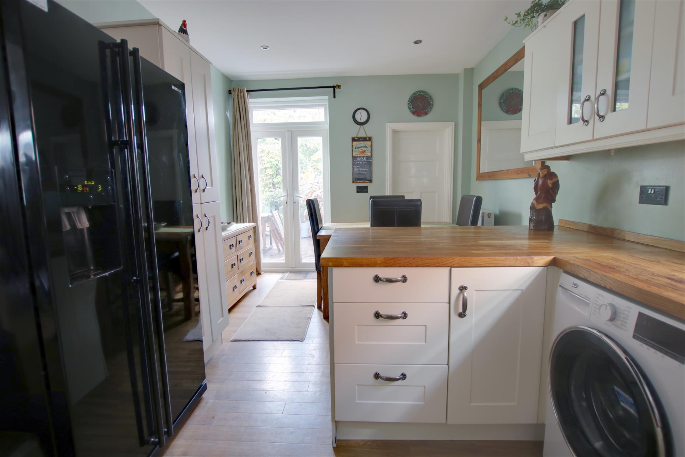 Double glazed window to side aspect. Double glazed French doors opening onto rear garden. Smooth ceiling with recessed lighting. Belfast sink with mixer tap and cupboard under. A range of matching eye level and base mounted units with wood block work surface over. Integrated dishwasher. Space for range style oven with extractor over. Space and plumbing for washing machine. Space for American style fridge/freezer. Radiator. Amtico flooring. Door to:-