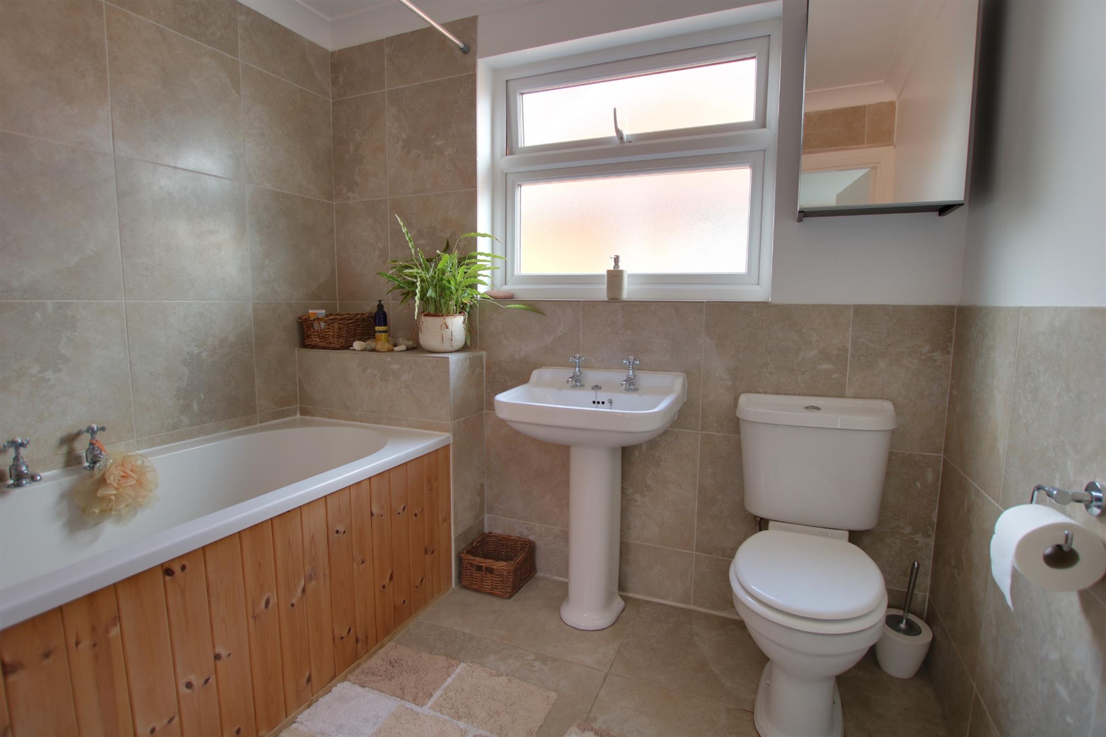 Double glazed obscure glass window to side aspect. Coving to smooth ceiling with recessed lighting. Extractor. Bath with central taps and shower over, pedestal wash basin and low level flush w.c. Heated towel rail. Part tiled walls. Tiled flooring.