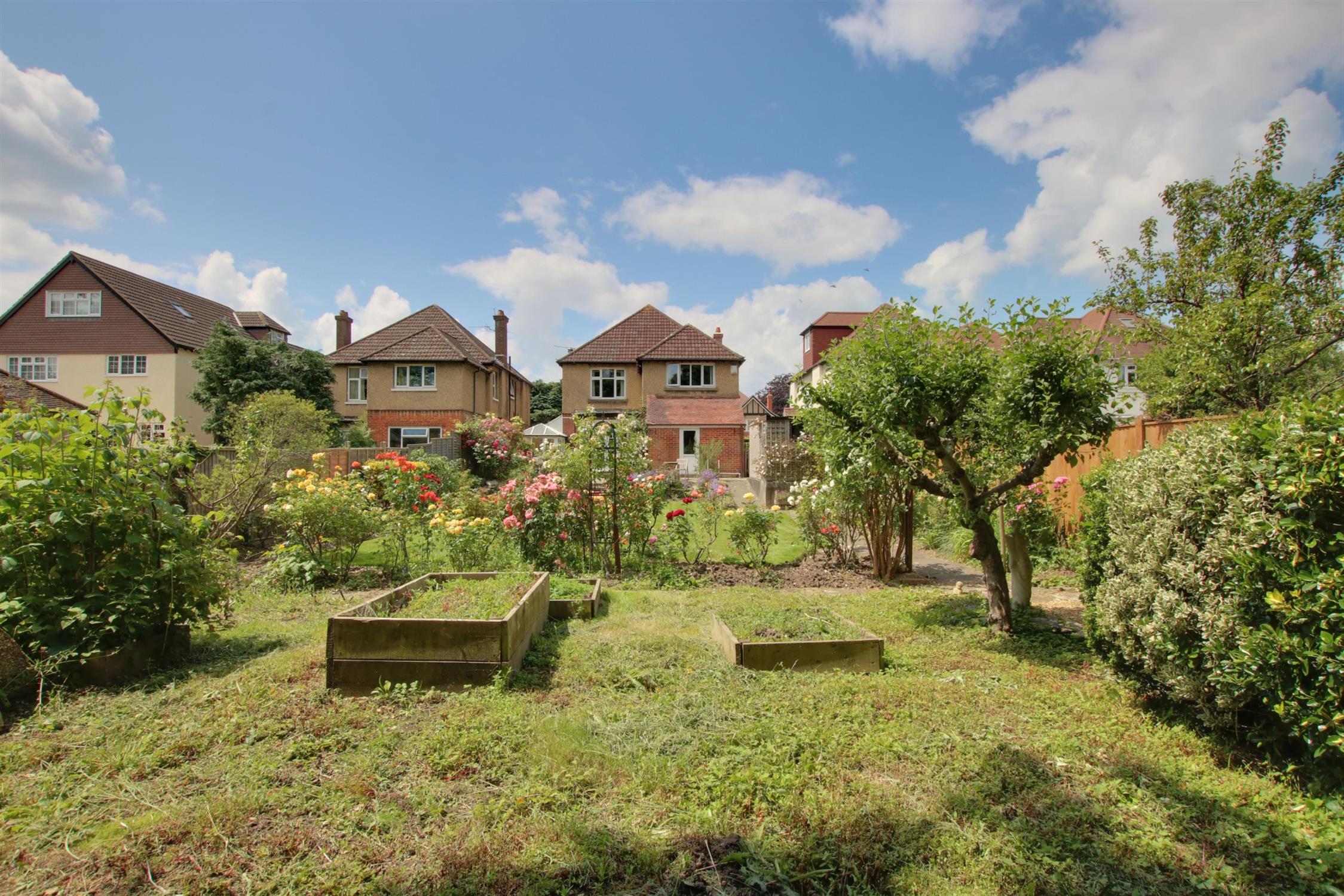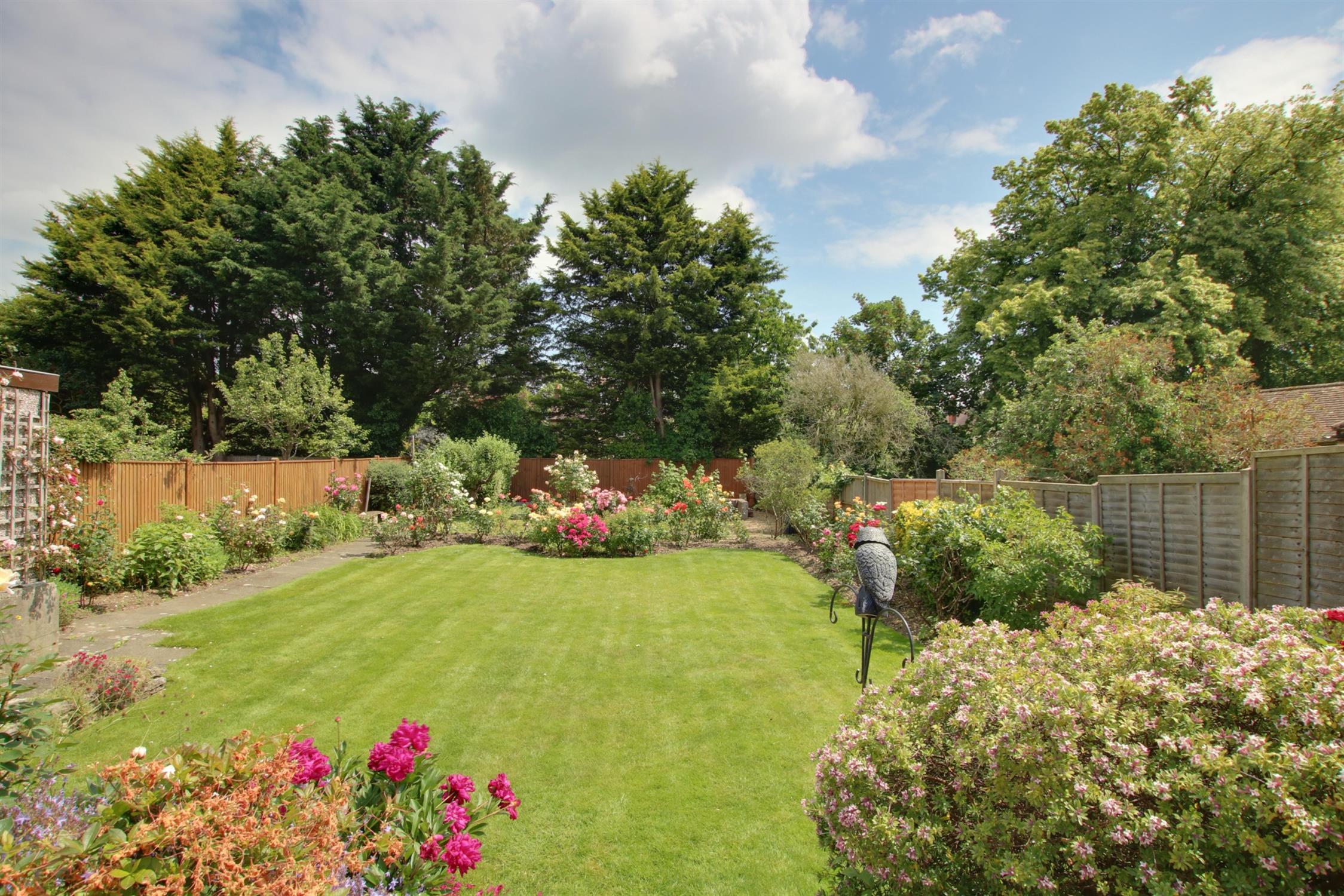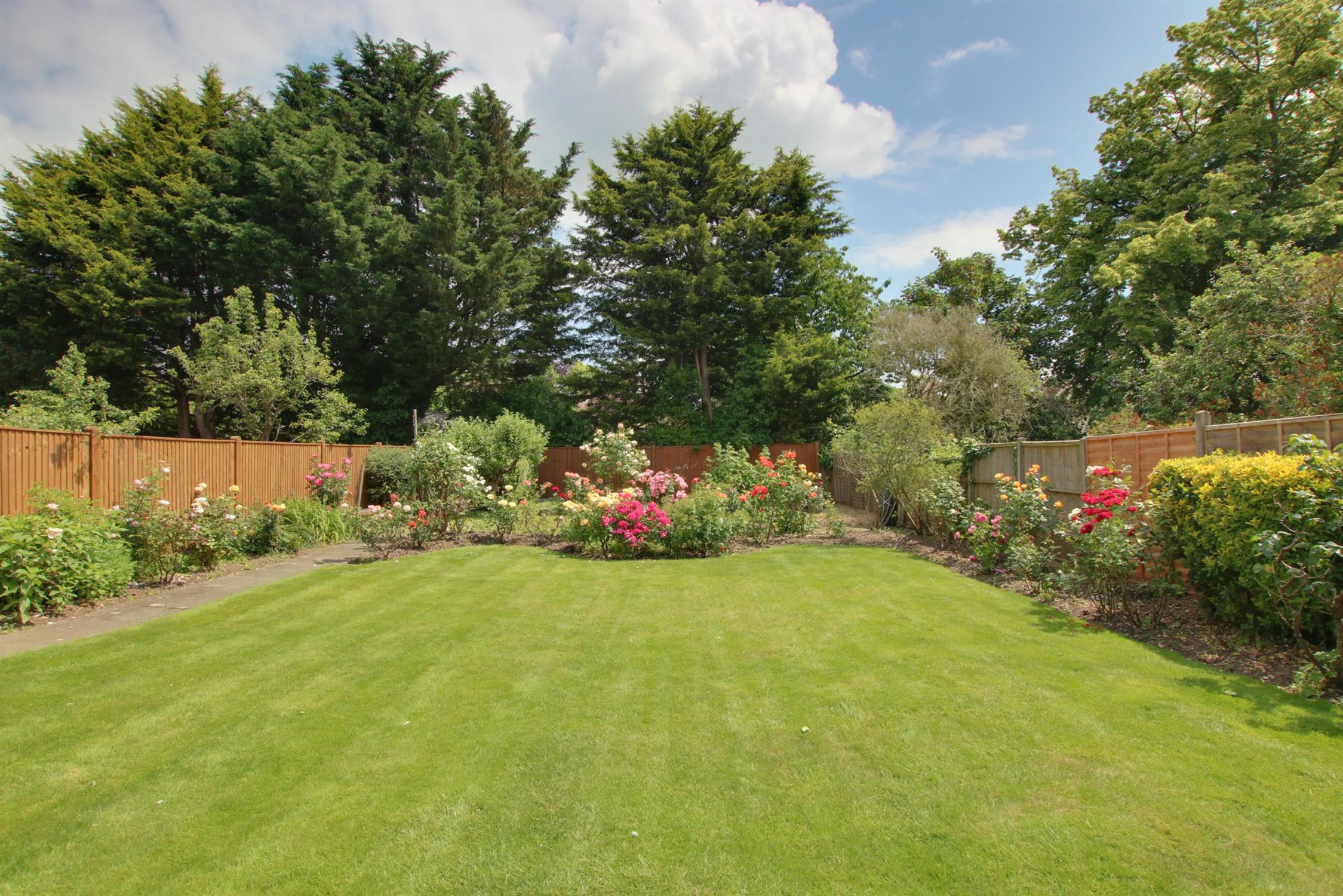 The large rear garden is well stocked with raised patio area. Well established rose garden. Steps to lawn and well stocked flower and shrub borders. Enclosed by fencing. DETACHED GARAGE.