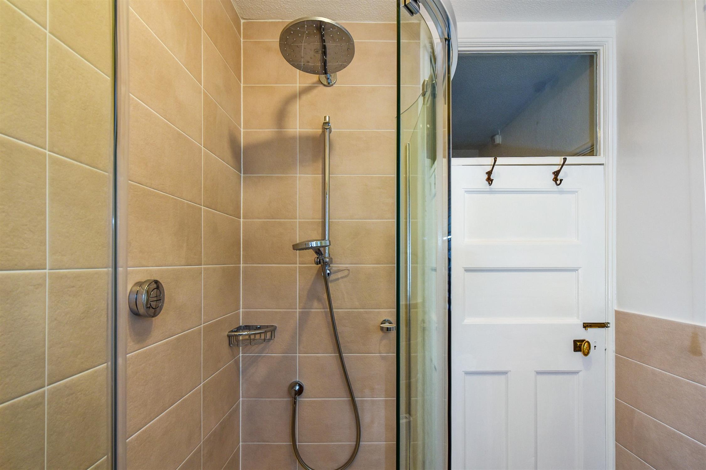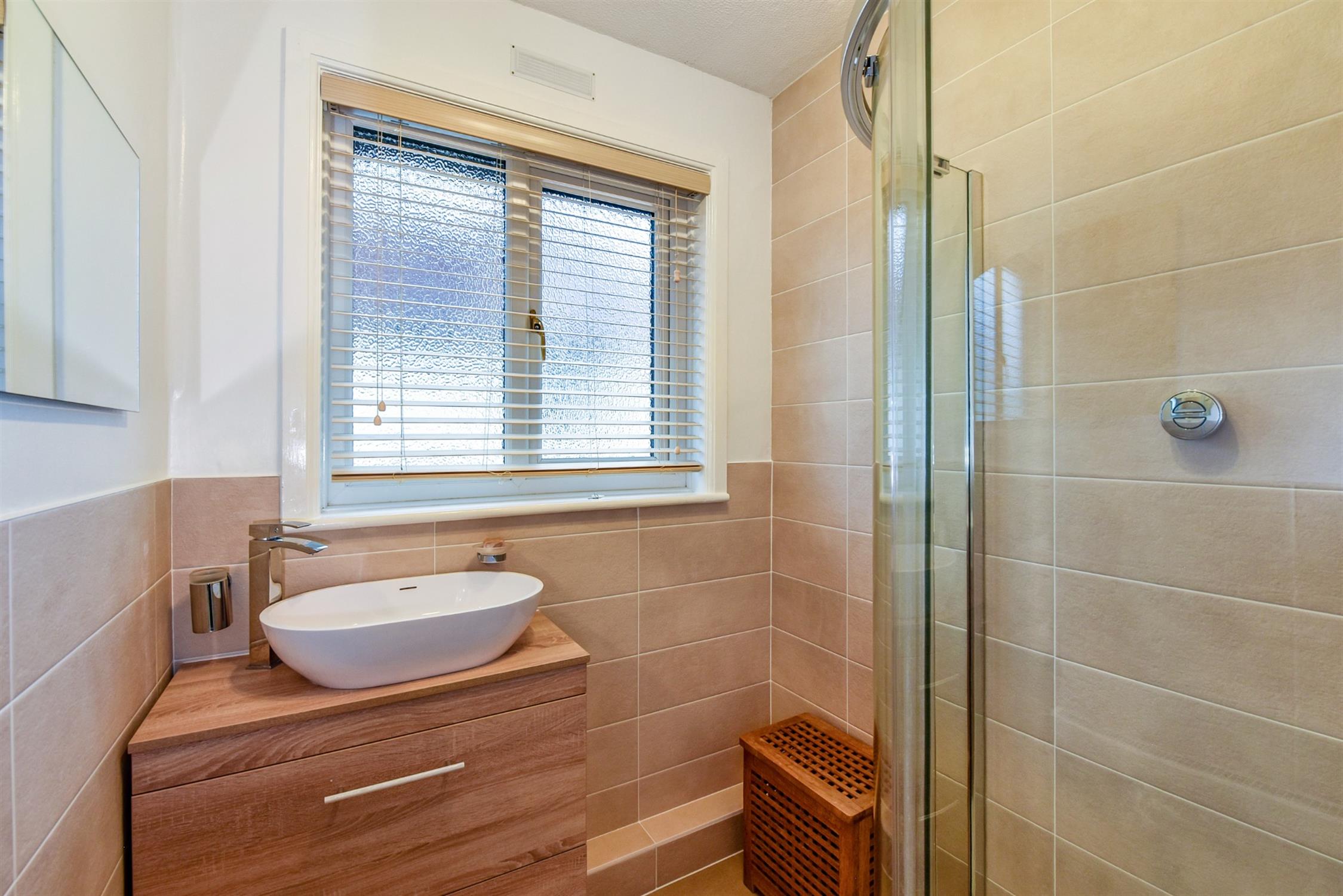 Recently re-fitted with tiled and enclosed shower cubicle, countertop hand basin with drawers under. Radiator. Modern tiled splash backs. Double glazed window to side elevation.