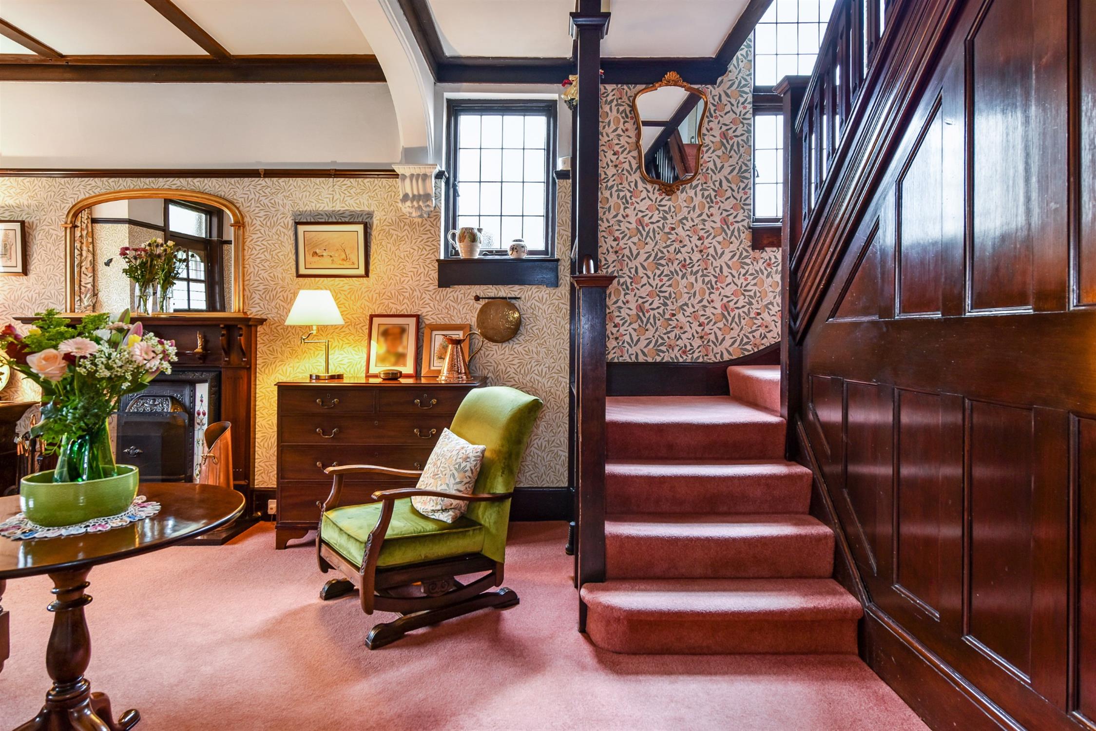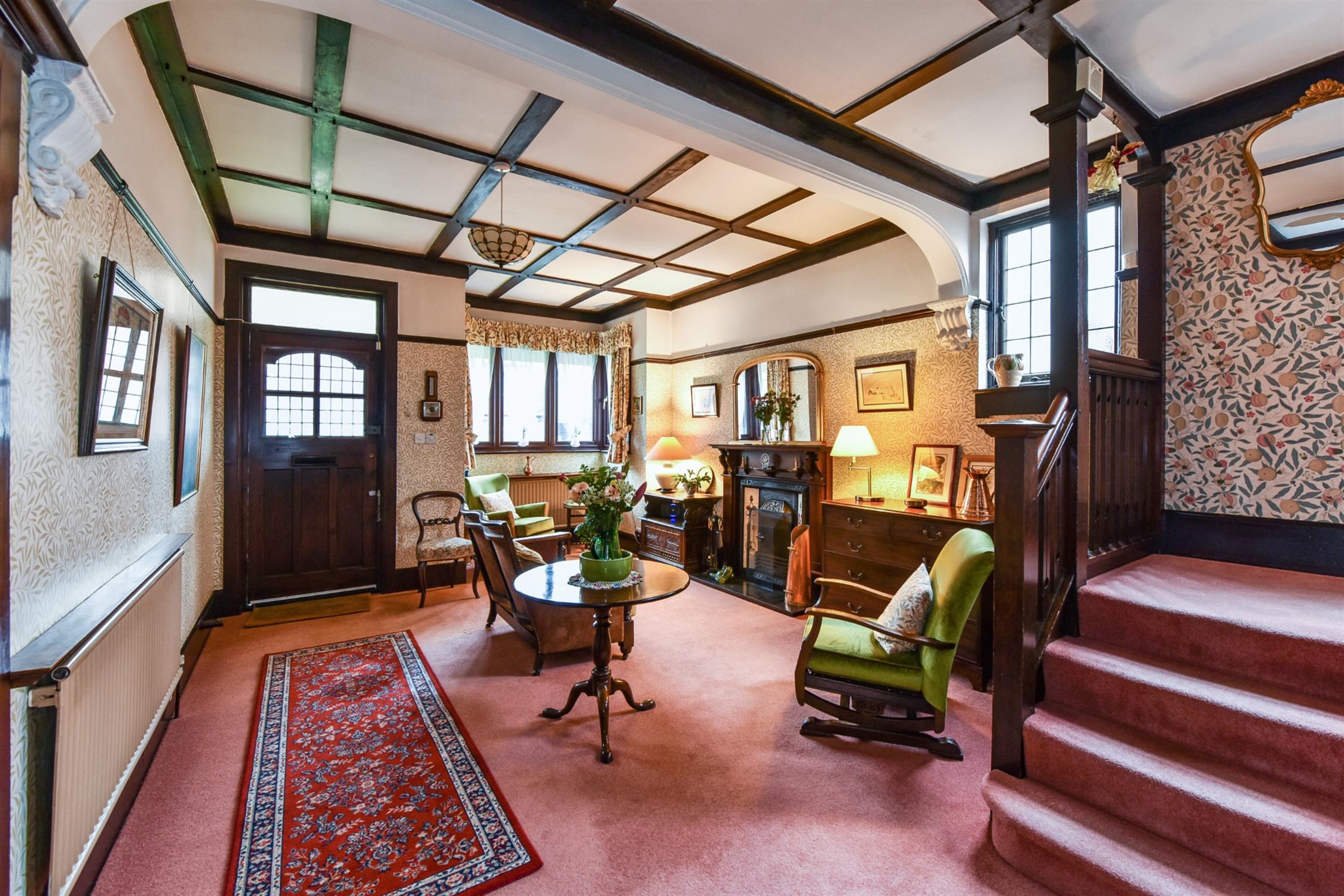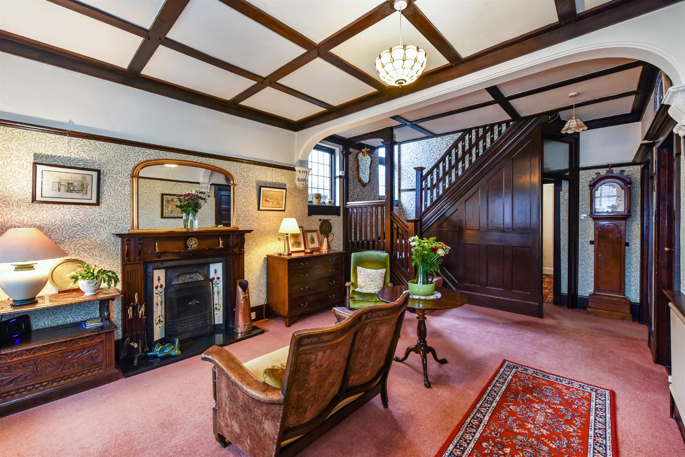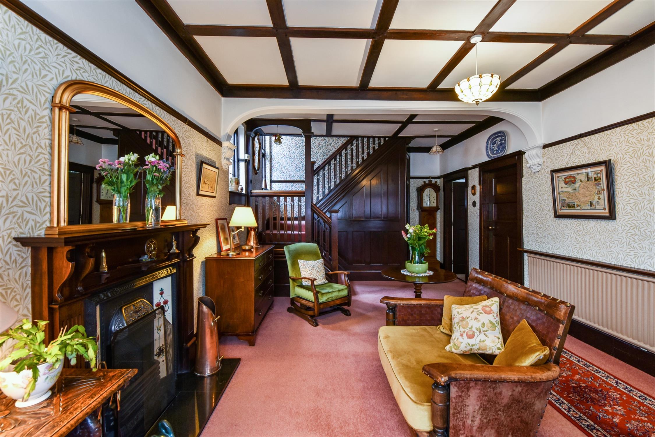 Feature fireplace. Picture rail. Radiator. Under stairs cupboard. Attractive panelling. Double glazed window to side elevation. Feature stair case and original doors to:-