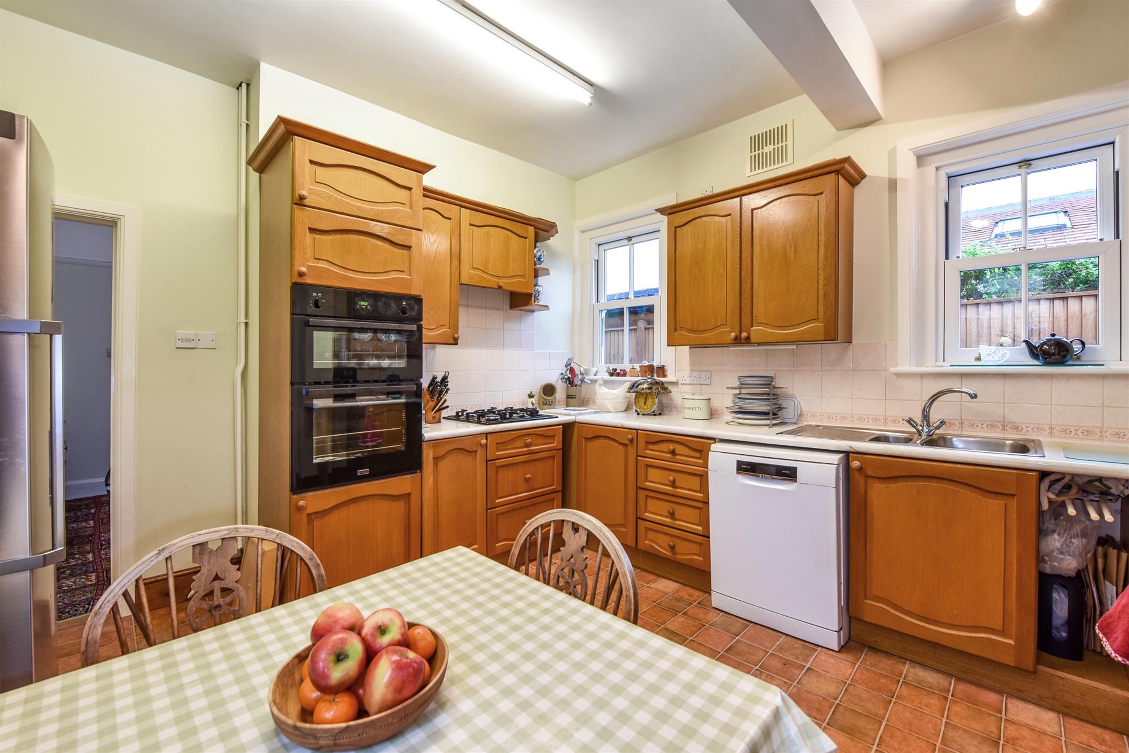 A range of fitted eye and base level units with roll edge work surface over with inset sink unit. Tiled splash backs. Fitted double oven and gas hob. Space for dishwasher and fridge/freezer. Double glazed window to side elevation. Door to:-