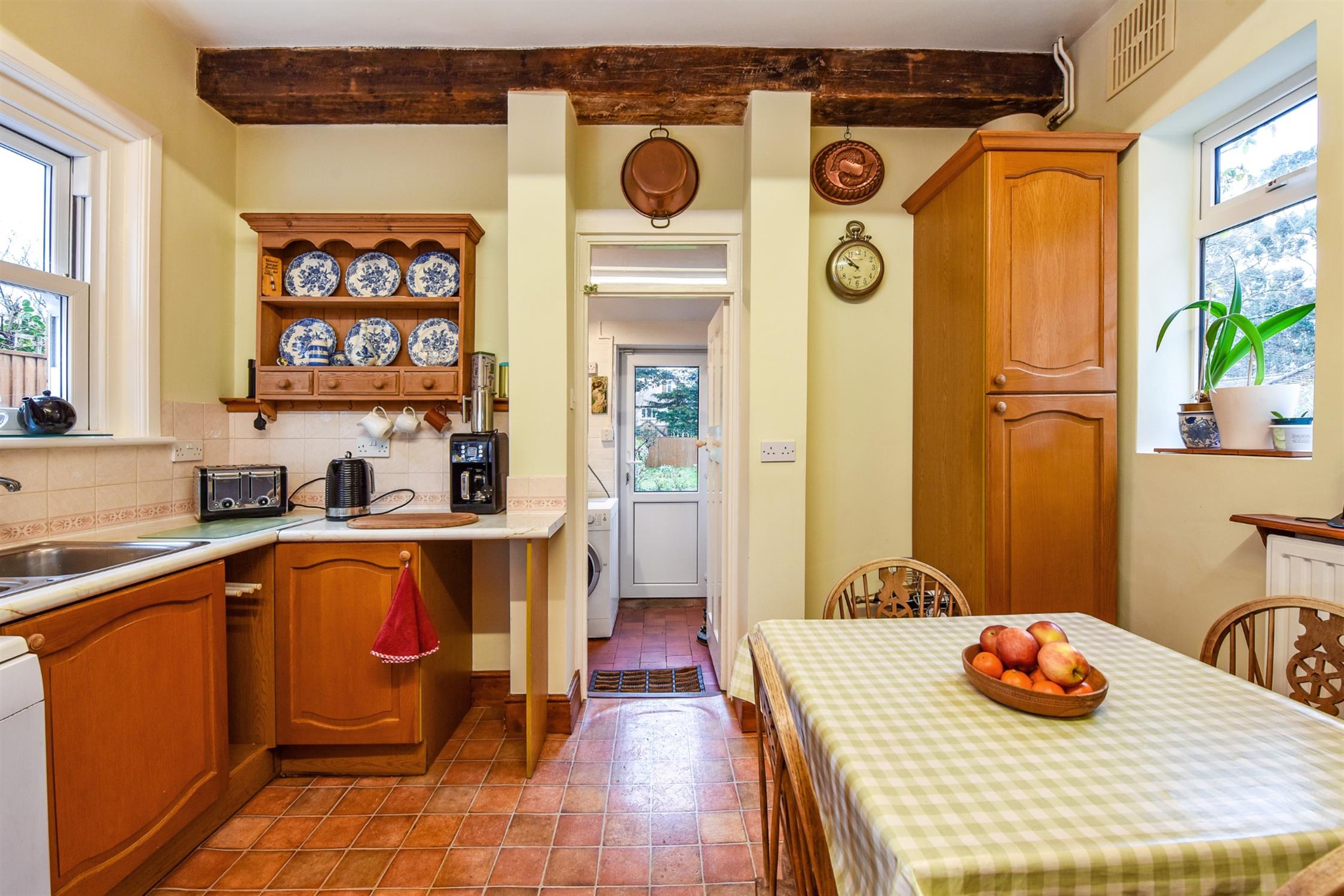 Single drainer sink unit and cupboards under. Space for appliances. Double glazed door to rear garden and door to:-