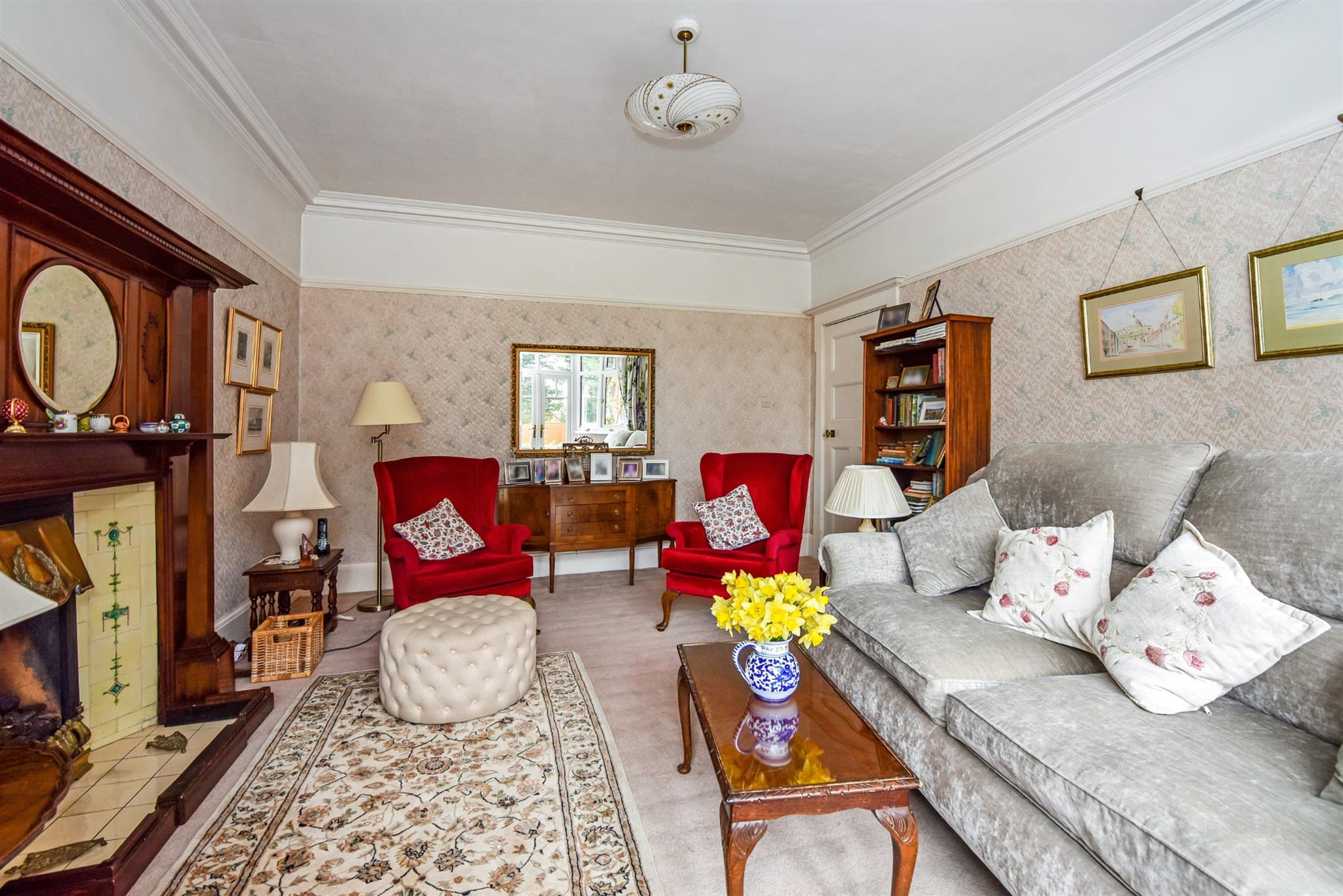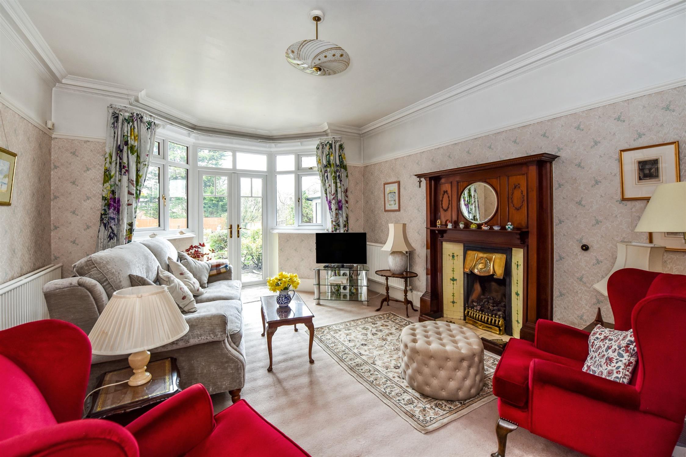 Double radiator. Picture rail. Original coving. Feature fireplace. Double glazed bay window to rear with French doors leading to gardens.