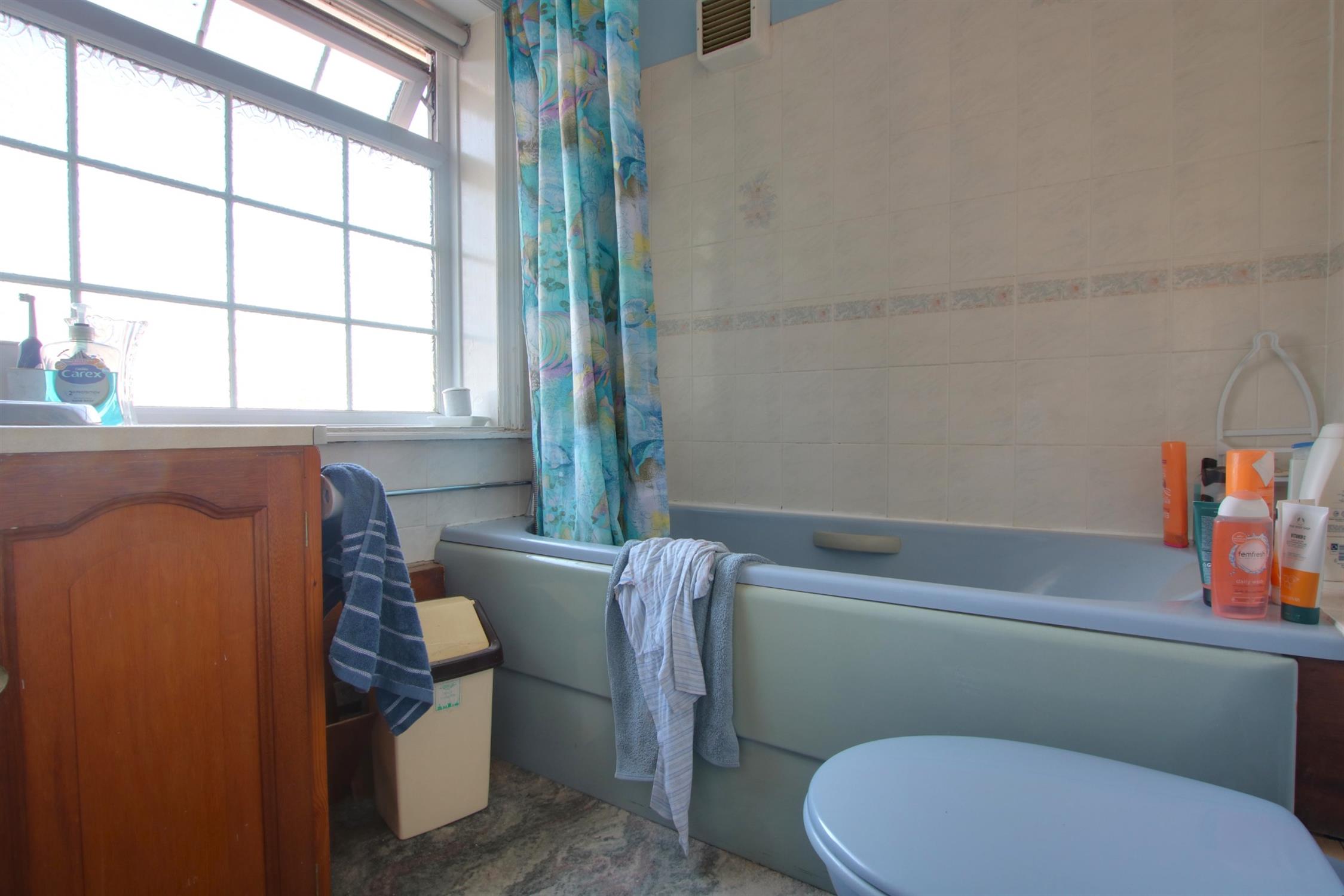 Double glazed obscure glass window to front aspect, panel enclosed bath, pedestal wash basin, low level flush wc, part tiled walls