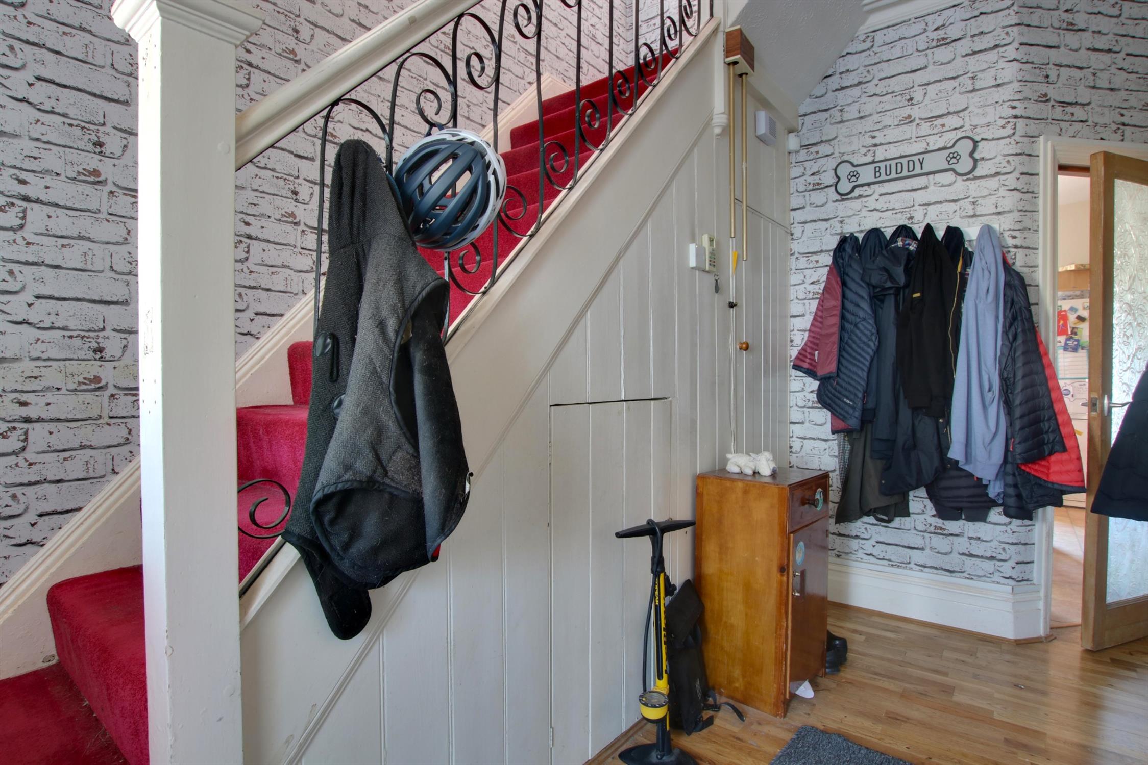 Period plaster coving to textured ceiling. Obscure glass window to front aspect. Radiator. Stairs to first floor. Under stairs storage cupboard.