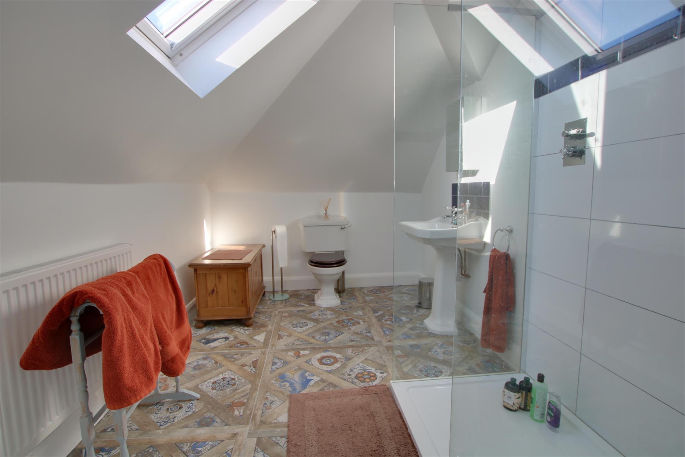 Double glazed velux window to side aspect. Smooth ceiling. Extractor. Tiled walk-in shower cubicle with rainfall shower head, pedestal wash basin and low level flush w.c. Radiator. Tiled flooring.