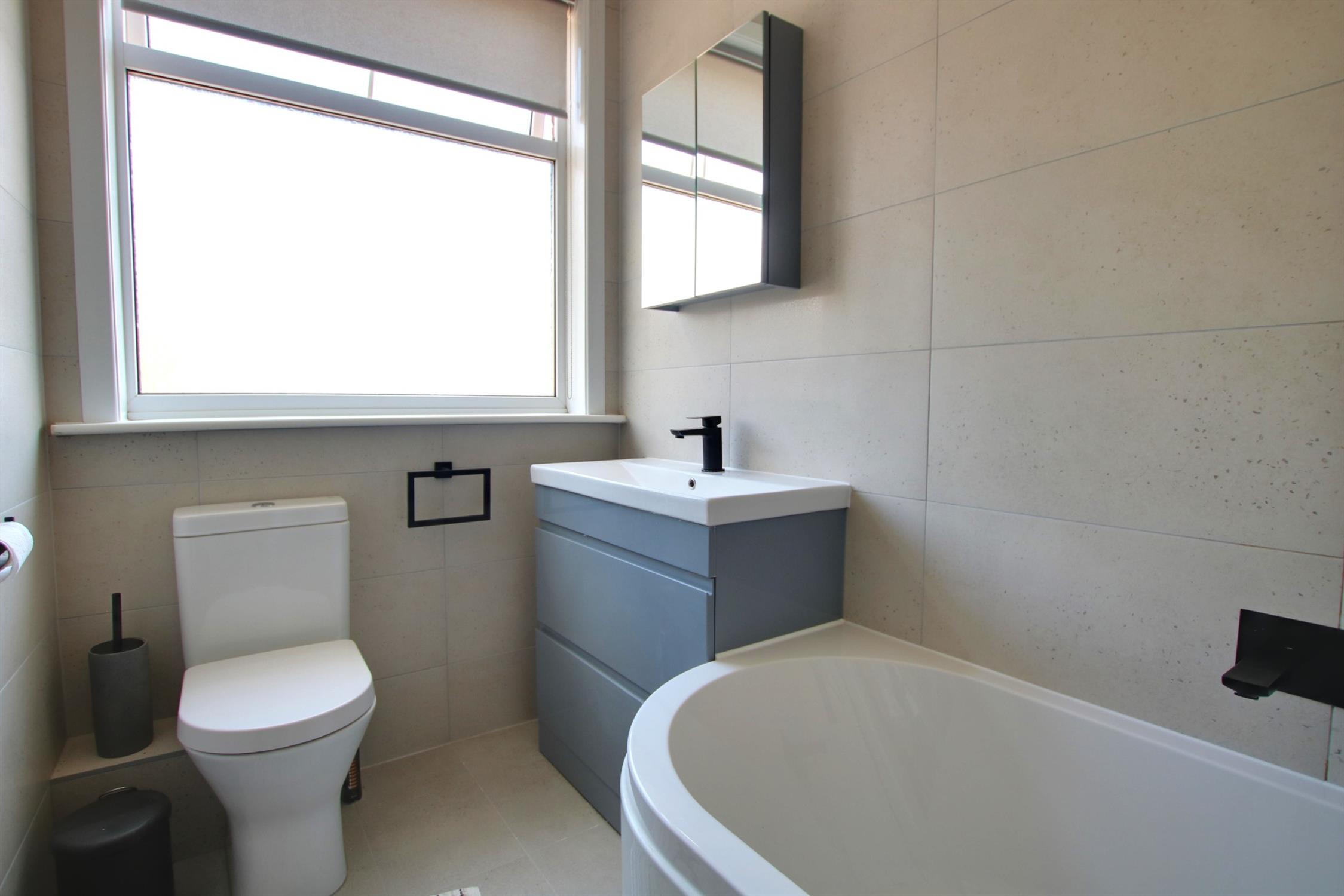 Double glazed obscure glass window to front aspect. Smooth ceiling with recessed lighting. Loft hatch. Shower bath with central mixer tap, rainfall shower head and shower attachment over, vanity wash basin with mixer tap and drawers under and low level flush w.c. Tiled walls and flooring. Heated towel rail.