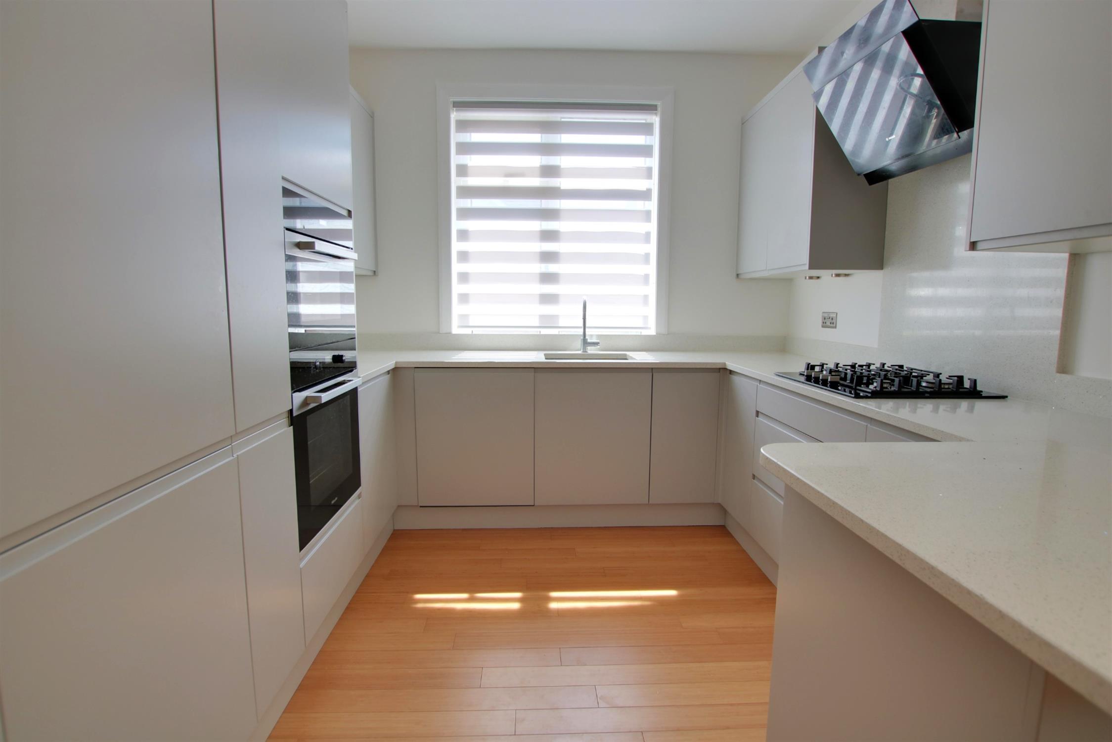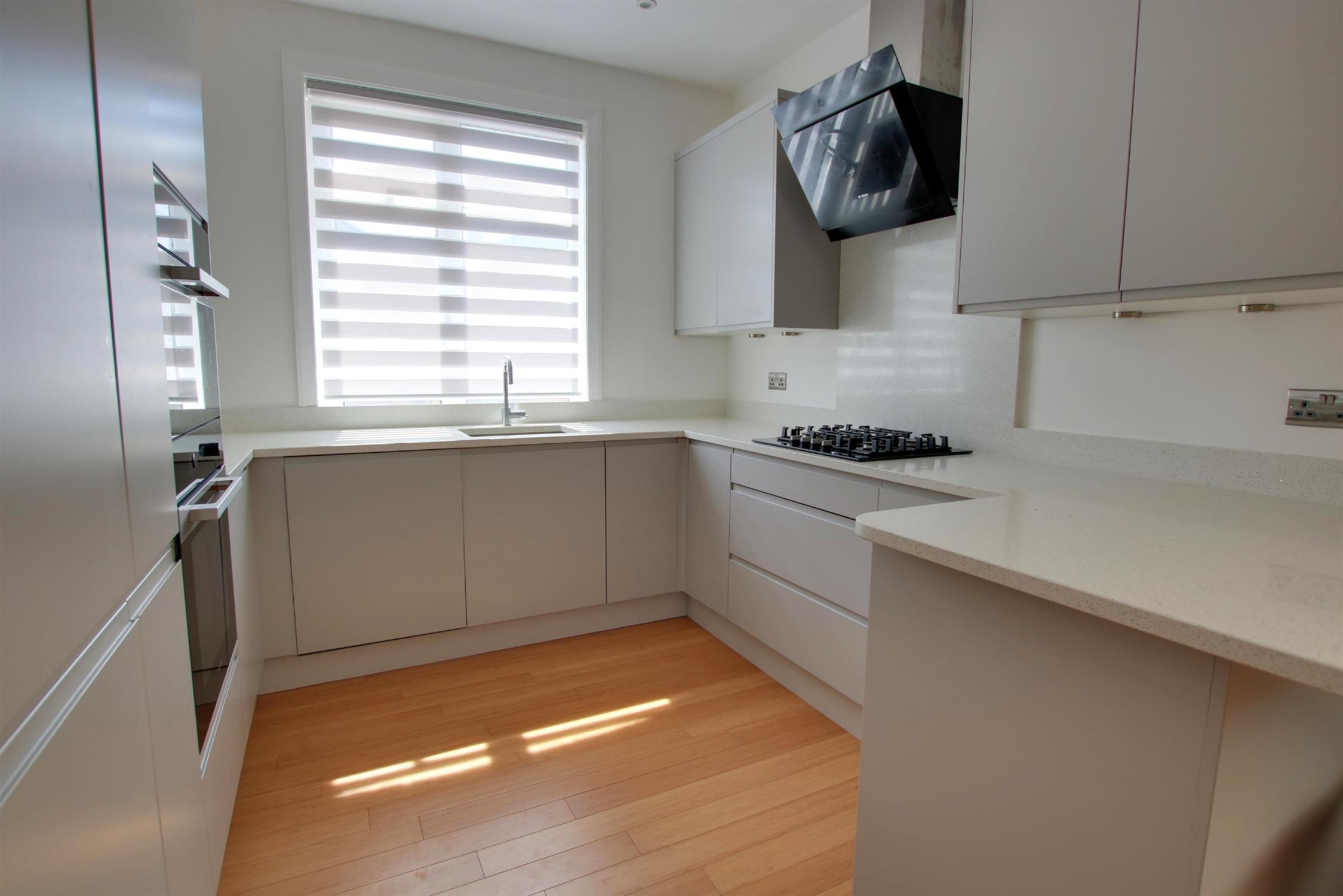 KITCHEN AREA: Double glazed window to side aspect. Smooth ceiling with recessed lighting. Sink unit with mixer tap and cupboard under. A range of matching eye level and base mounted units with quartz worktop over. Integrated dishwasher and fridge/freezer. Built-in double oven. Fitted four ring gas hob with extractor over. Bamboo flooring.