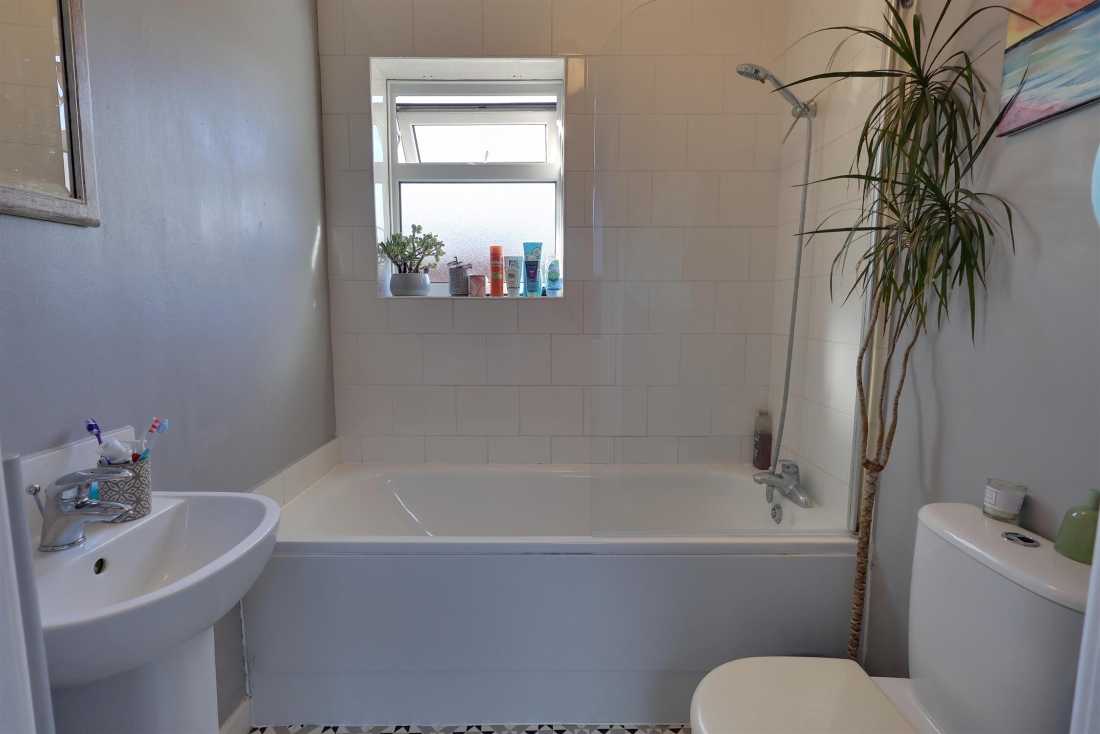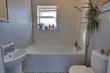 Double glazed obscure glass window to side aspect. Coving. Panel enclosed bath with mixer tap and shower attachment, pedestal wash hand basin and low level flush w.c. Heated towel rail.