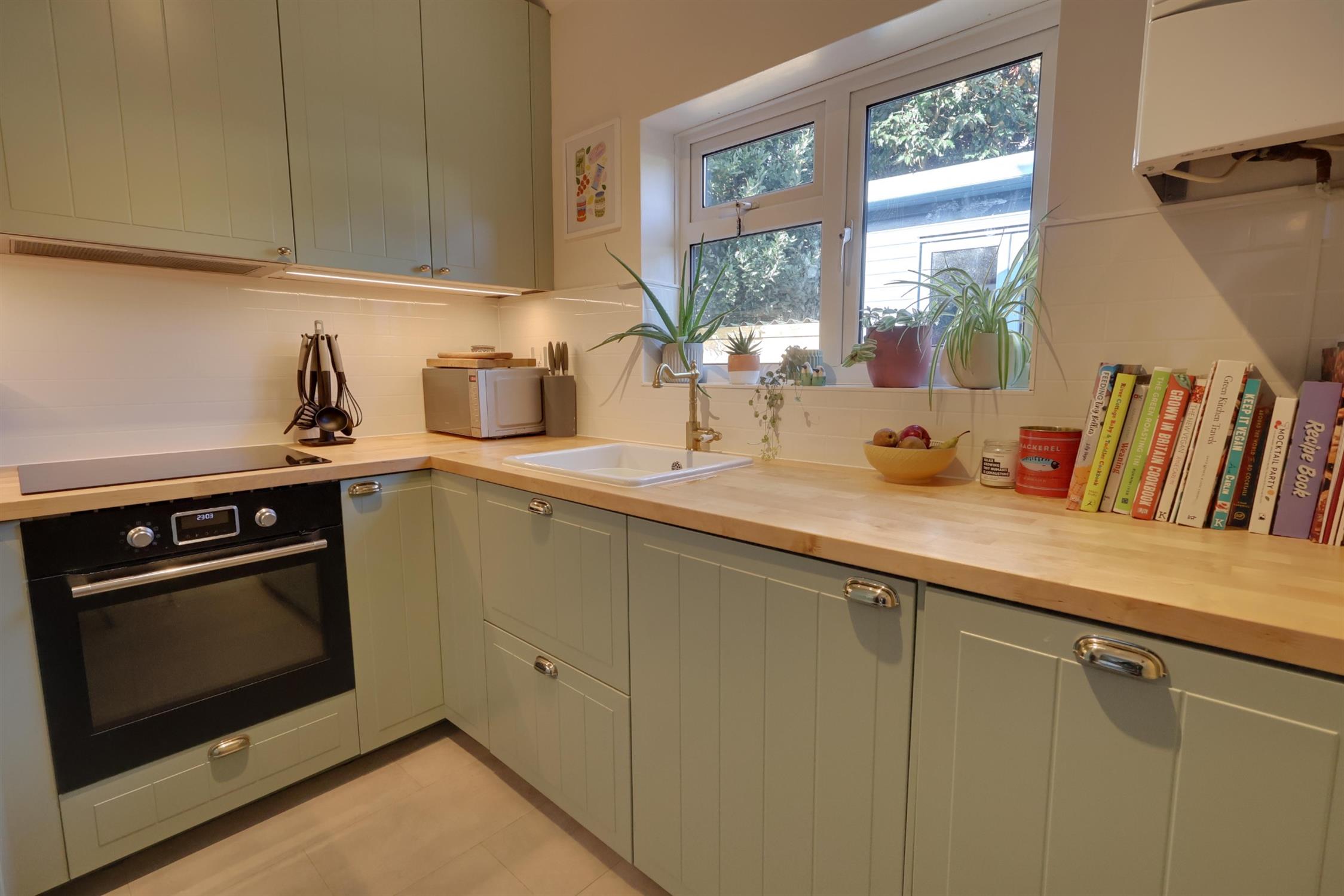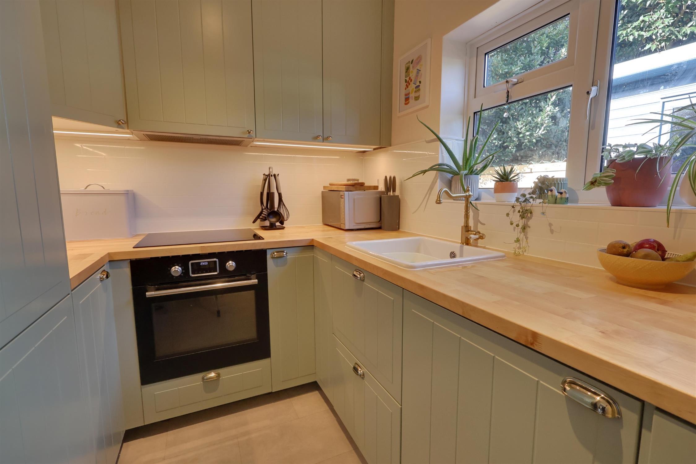 Double glazed window to rear aspect. Coving. Wall mounted boiler. Sink with mixer tap and cupboard under. A range of matching eye level and base mounted units with wood block work surface over. Built-in oven and fitted four ring induction hob with extractor over. Integrated slimline dishwasher. Integrated fridge/freezer. Space for Washing machine. Radiator. Laminate flooring.