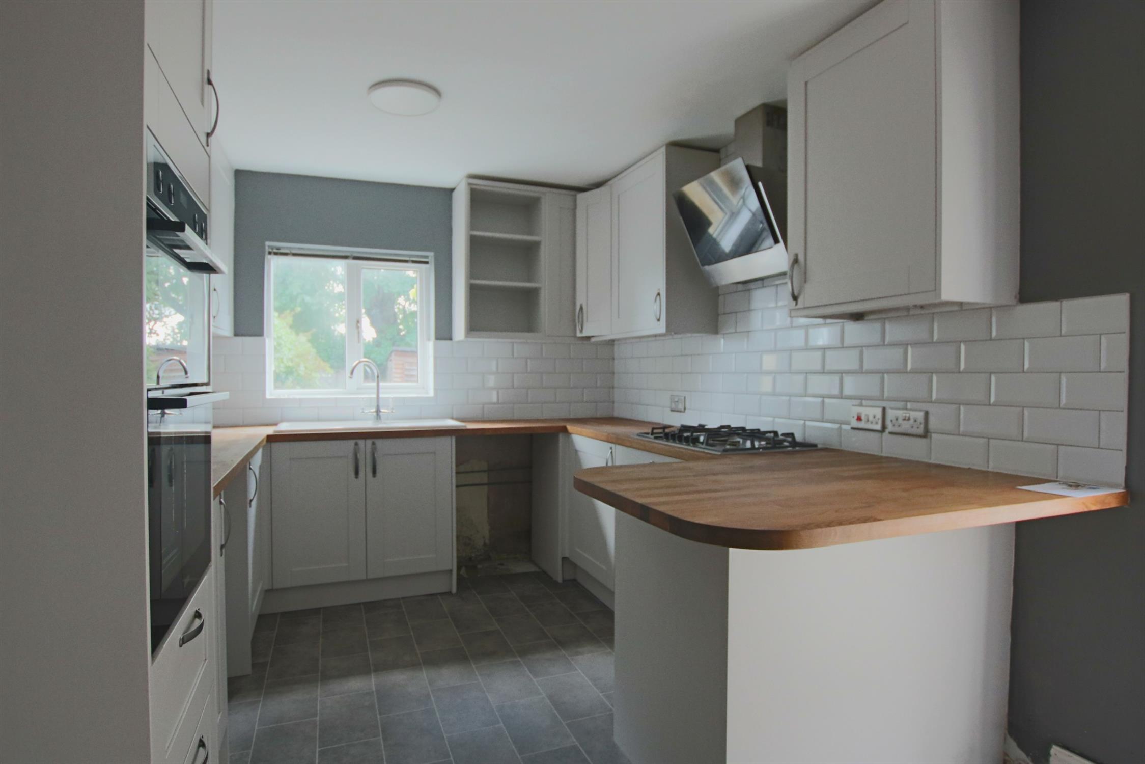 A range of wall and base cupboards with work surfaces over and breakfast bar. Built in oven with gas hob extractor hood over. Single drainer sink unit. Space and plumbing for washing machine. Radiator. Double glazed window and double glazed door opening to the garden.