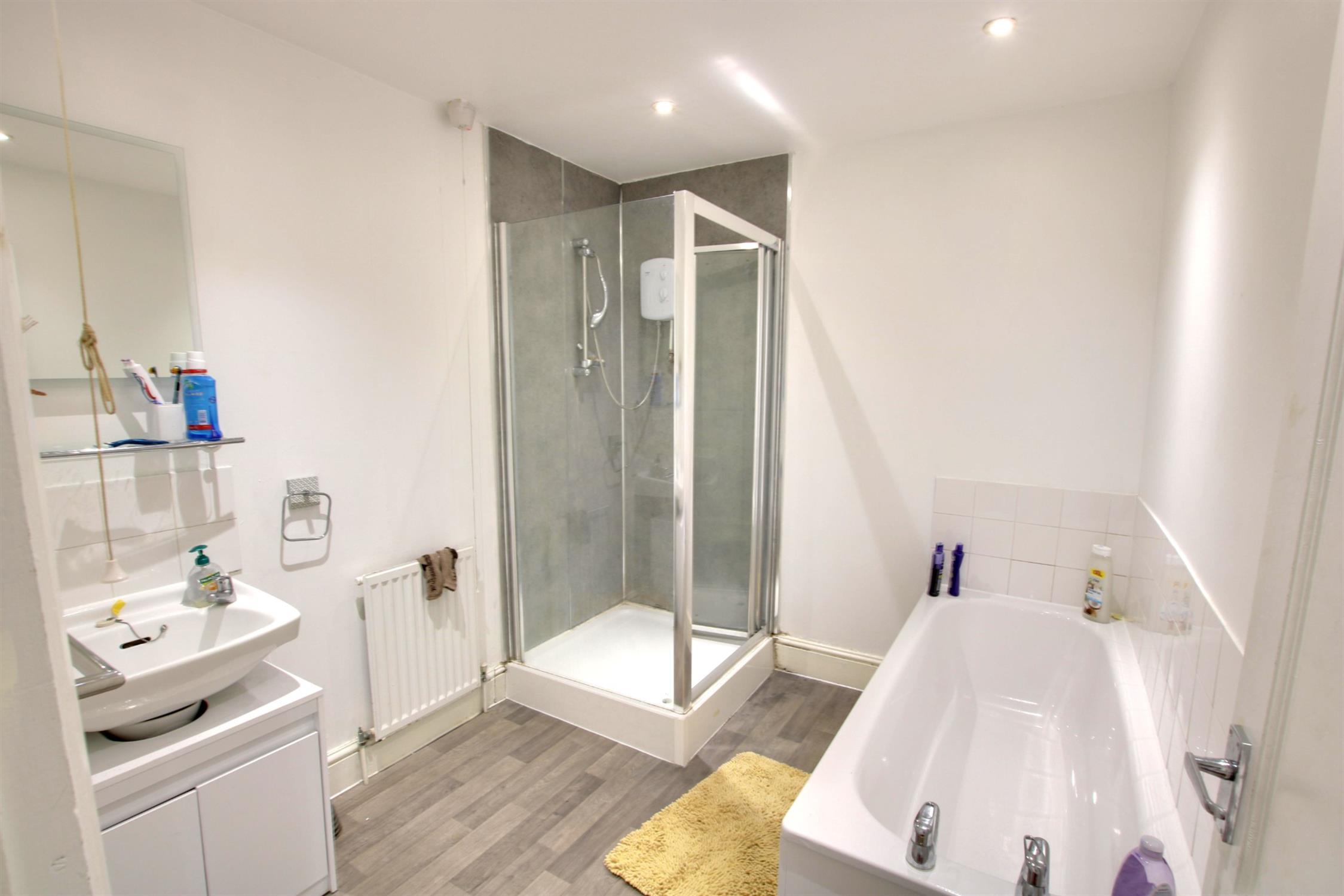 Smooth ceiling with recessed lighting. Extractor. Radiator. Panel enclosed bath, separate shower cubicle and pedestal wash basin with tiled splash back and cupboard under.