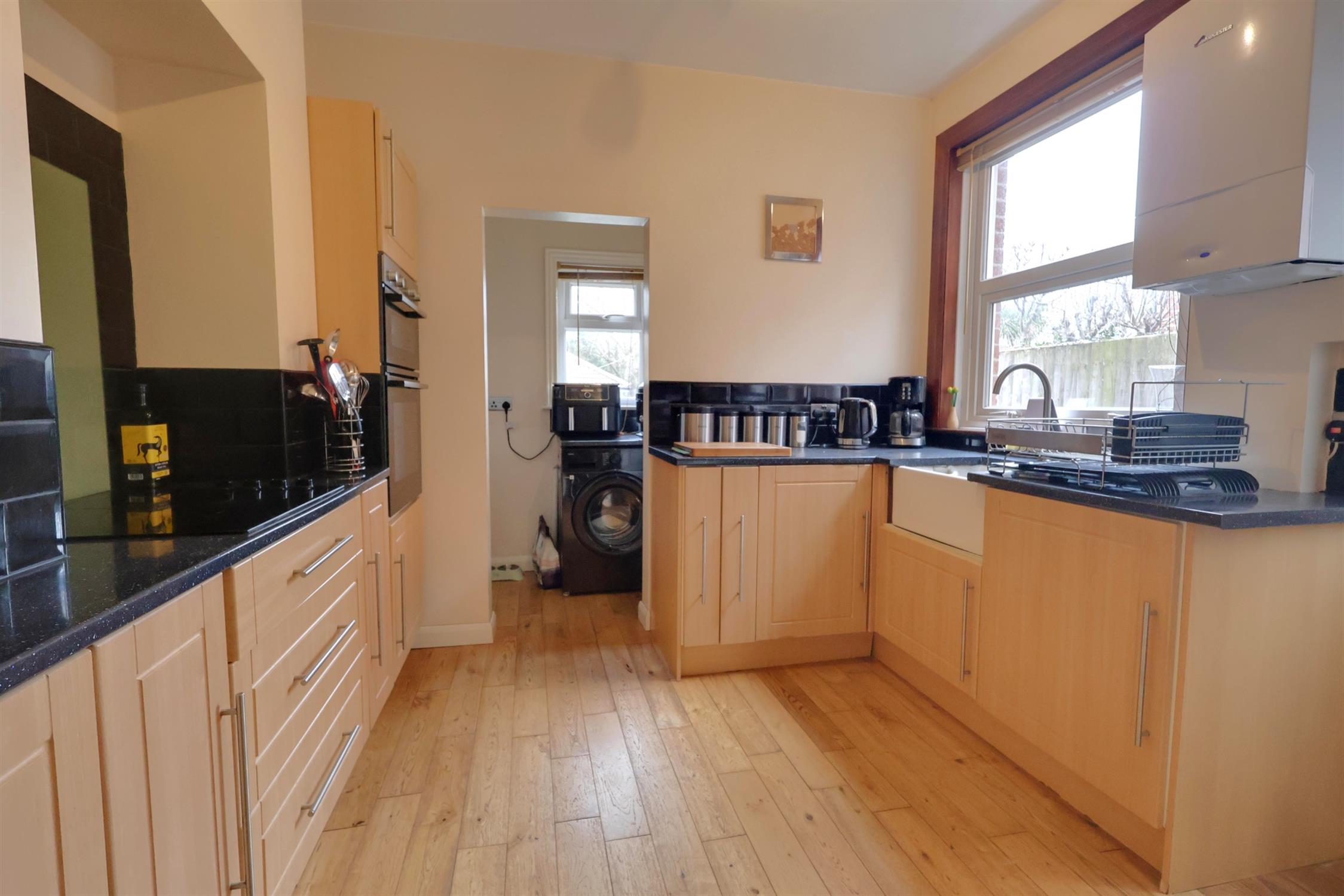 Double glazed window to side aspect and window to rear aspect. Double glazed door opening onto rear garden. Smooth ceiling. Belfast sink with mixer tap and cupboard under. A range of matching eye level and base mounted units with roll top work surface over. Built-in double oven. Fitted four ring electric hob. Space and plumbing for washing machine. Space for fridge/freezer. Breakfast bar. Radiator. Oak flooring.