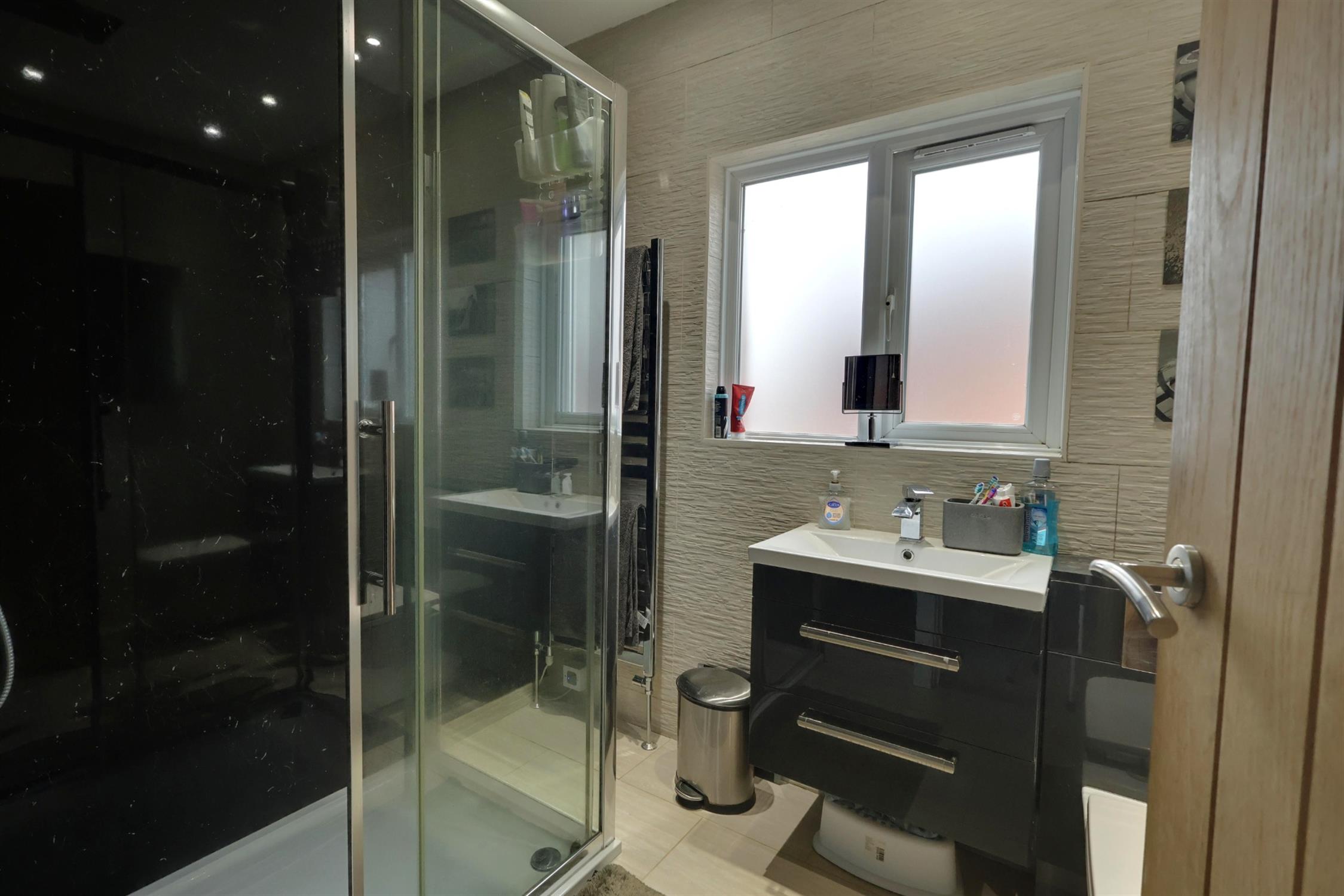 Double glazed obscure glass window to side aspect. Smooth ceiling with recessed lighting. Extractor. Double shower cubicle with rainfall shower head and separate shower attachment, vanity wash basin with mixer tap and drawers under and concealed cistern w.c. Heated towel rail. Tiled flooring.
