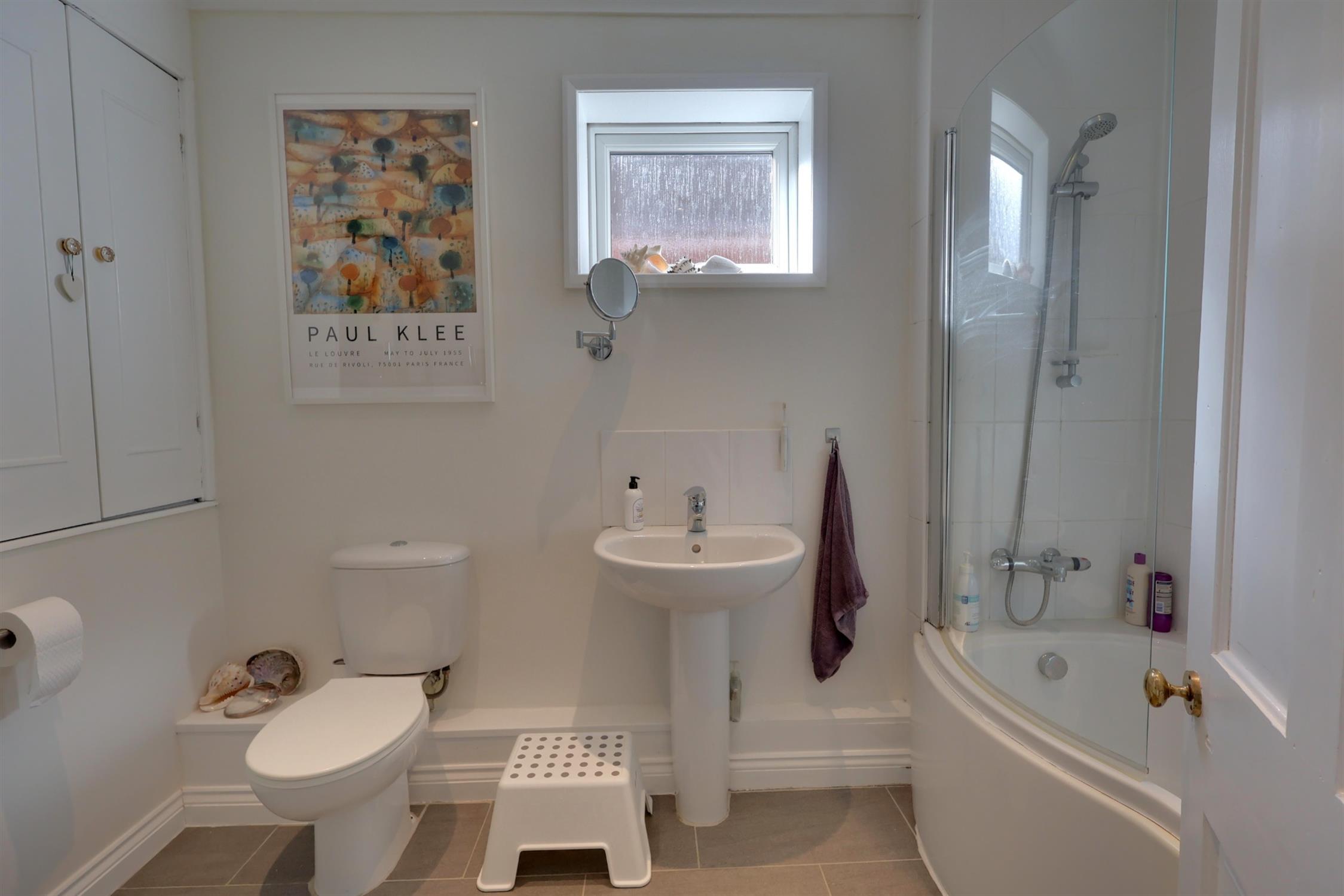 Double glazed obscure glass window to side aspect. Smooth ceiling with recessed lighting. Panel enclosed bath with mixer tap and shower over, wash basin with mixer tap and low level flush w.c. Heated towel rail. Tiled flooring. Cupboard housing wall mounted combination boiler.