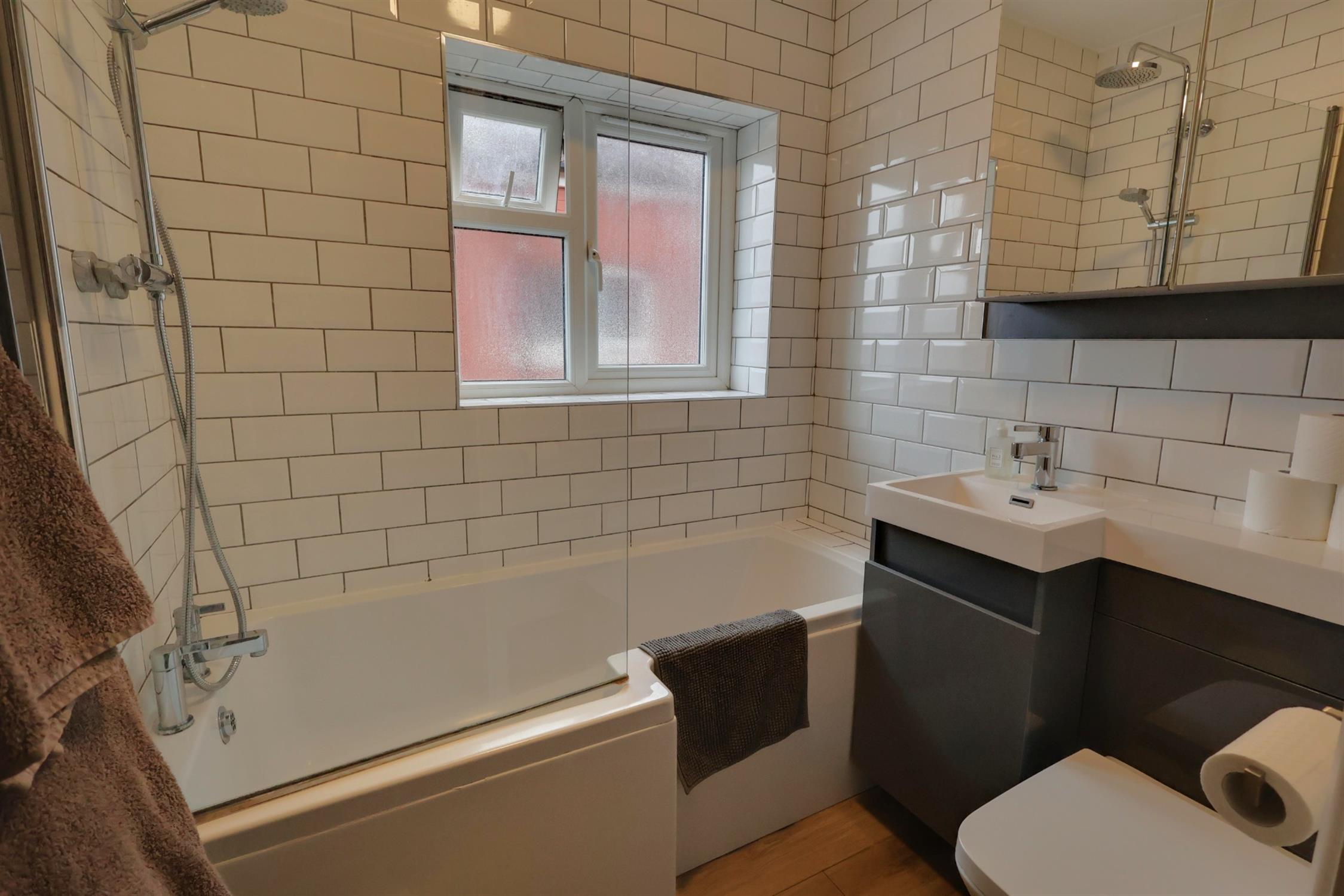 Double glazed obscure glass window to side aspect. Smooth ceiling. P-shaped bath with mixer tap and shower over, vanity wash basin with mixer tap and cupboard under and concealed cistern w.c. Extractor. Heated towel rail. Part tiled walls. Tiled flooring.