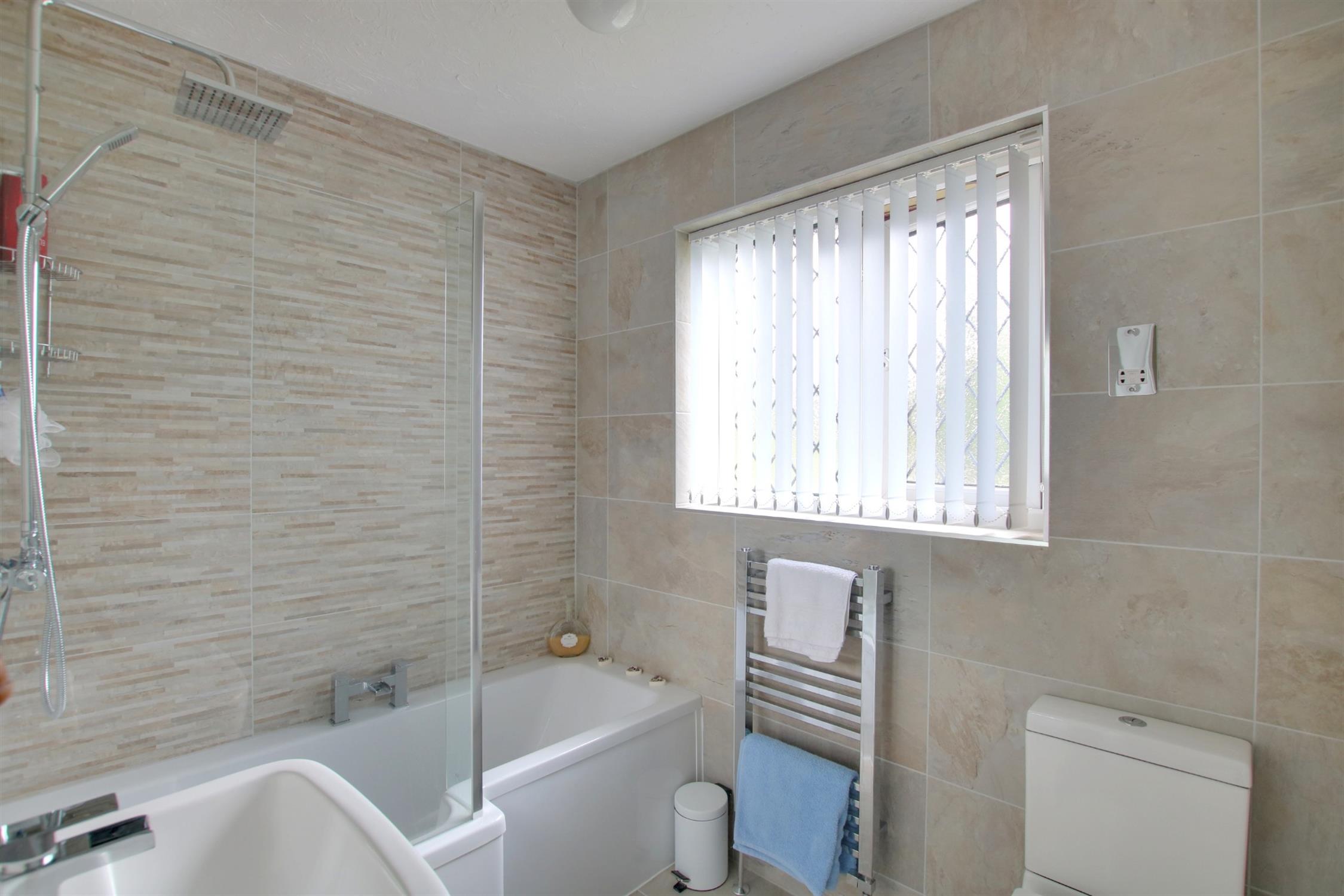 Recently fitted with a white suite comprising ‘L’ shaped panelled bath with waterfall tap and shower over, low level WC and pedestal wash hand basin with waterfall tap over. Window to the front aspect. Heated towel rail. Tiled walls. Tiled floor.