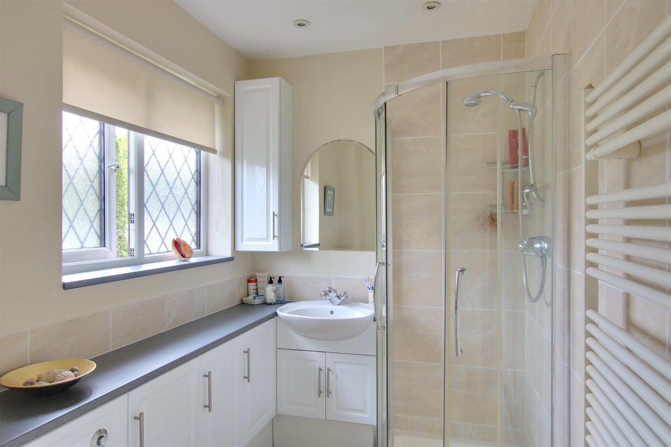 Fitted with a white suite comprising glazed shower unit, enclosed cistern WC and wash hand basin with vanity unit under. Part tiling. Heated towel rail. Window to the front aspect.