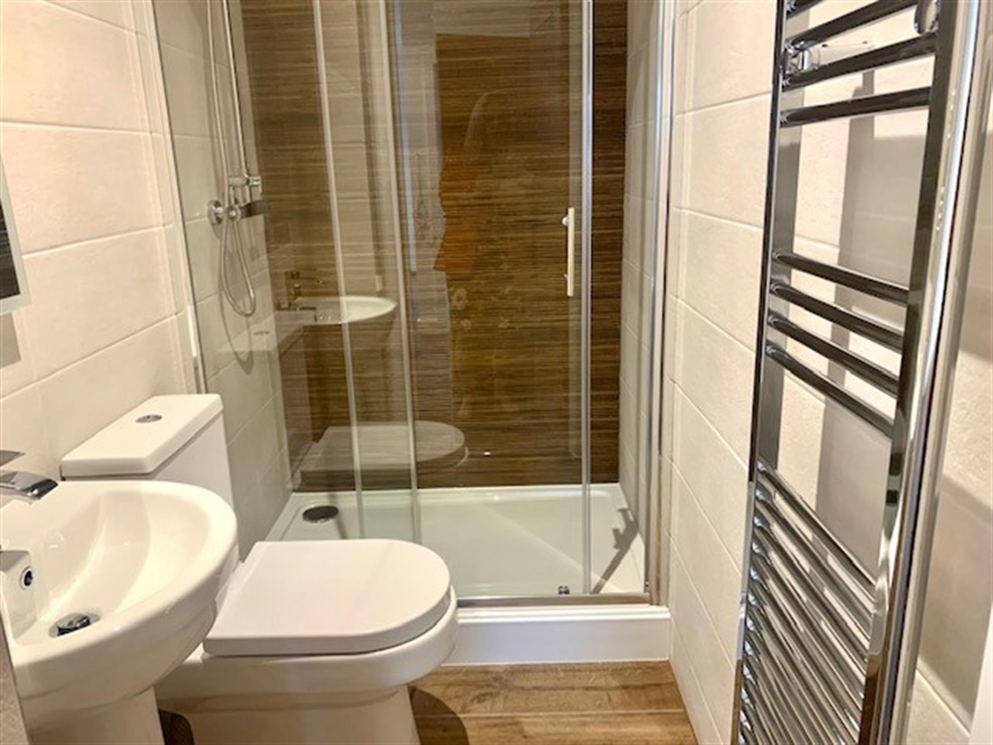 SHOWER ROOM - White suite with shower cubicle, sink and toilet.