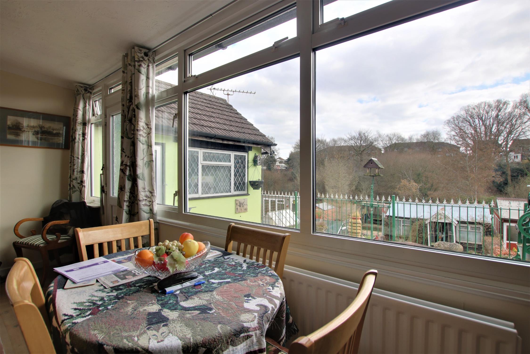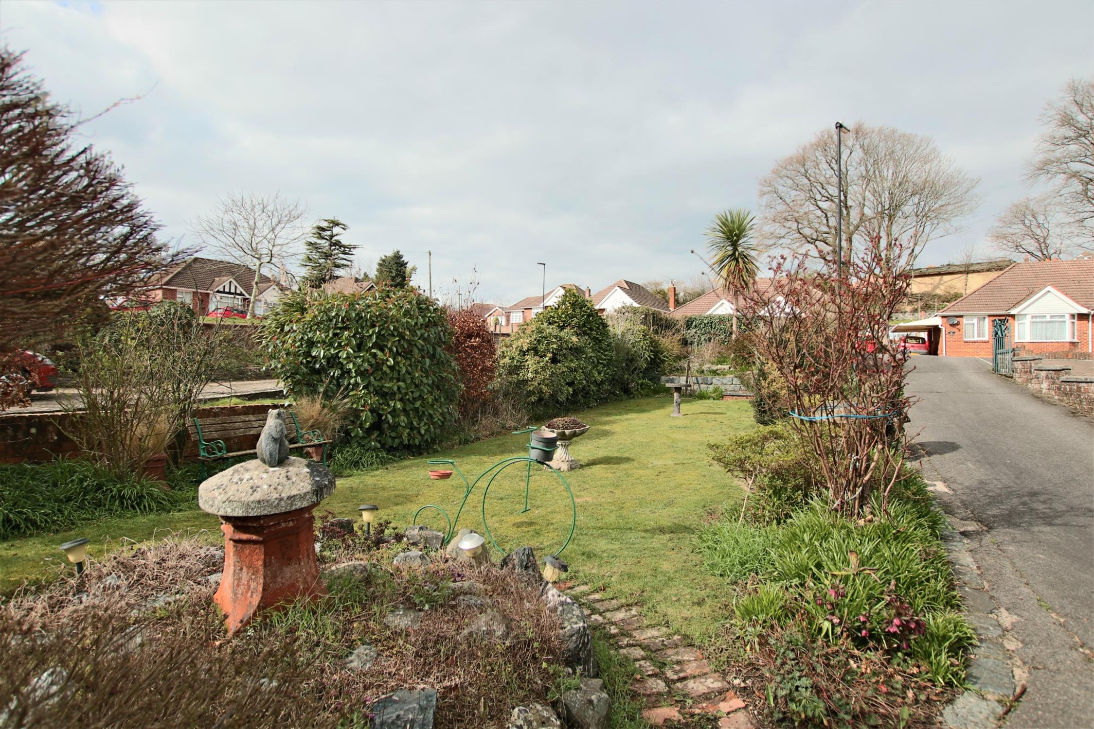 Patio area. Southerly facing garden. Set over three tiers. Top tier - mainly laid to patio, steps leading down to the lower tier which is mainly laid to lawn. Shed with power connected. Greenhouse. Unencumbered views over the allotments and greenery beyond.