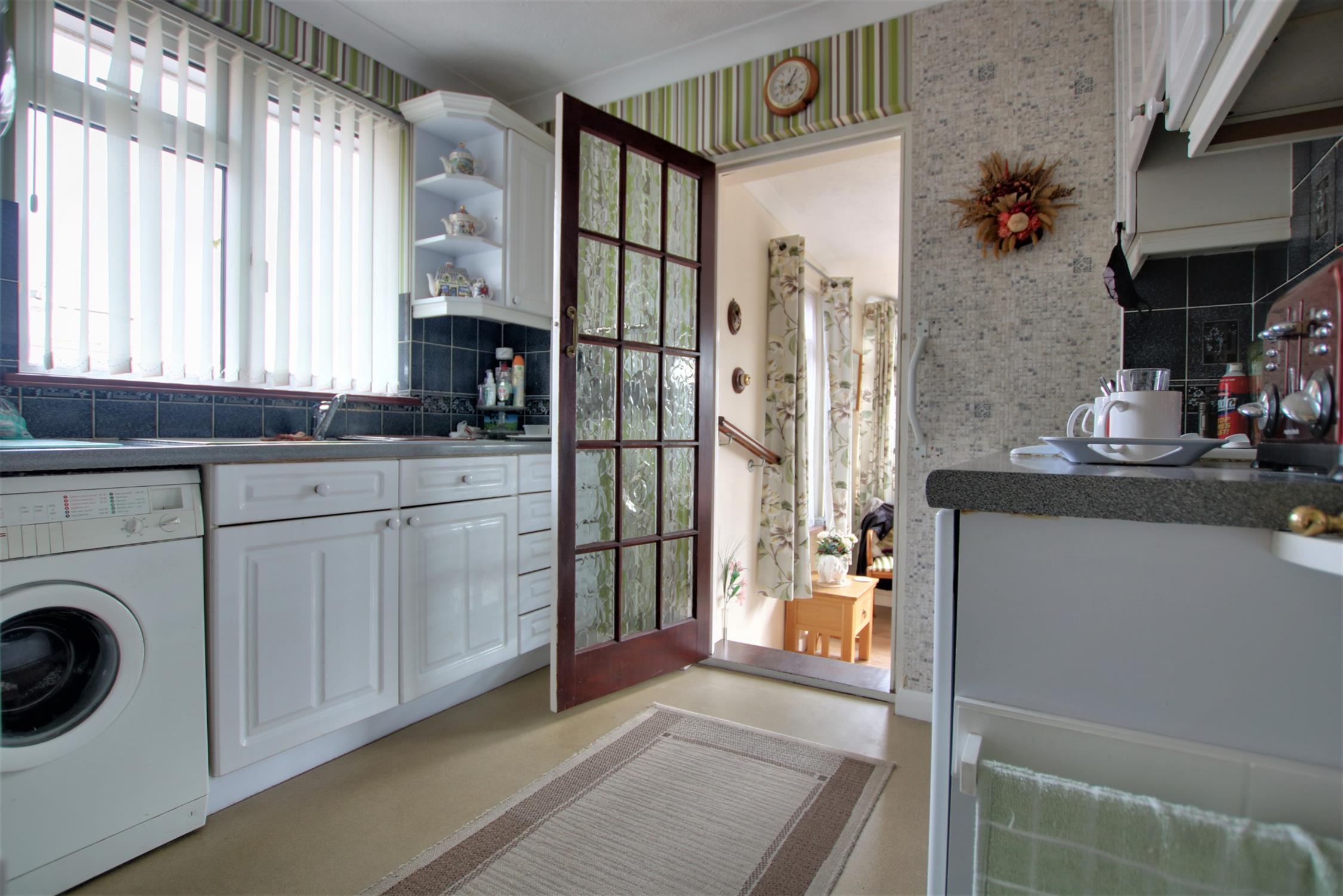 Gloss wooden effect wall and base units with contrasting worktop over. Electric oven and grill and electric hob. Sink and drainer. Double glazed window to side aspect. Vinyl flooring. Tiled splashbacks. Textured ceiling. Radiator. Door leading to dining area.