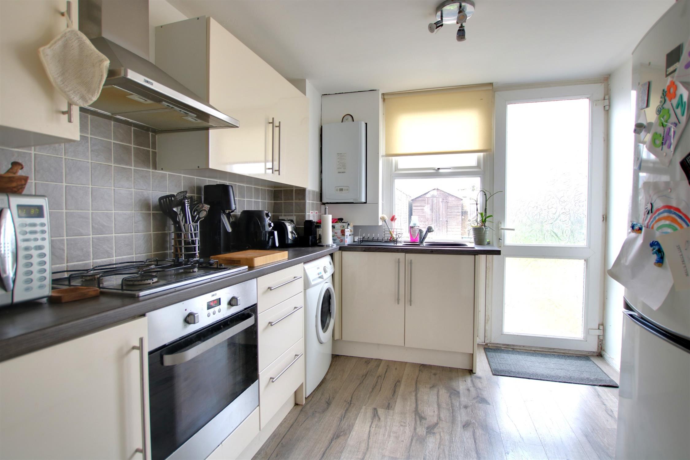 Fitted range of units to include built-in oven with gas hob and extractor hood. Space and plumbing for automatic washing machine. Wall mounted central heating boiler. One and a half bowl single drainer sink unit with mixer tap fitting. Double glazed door to rear elevation. Smooth plastered ceiling.