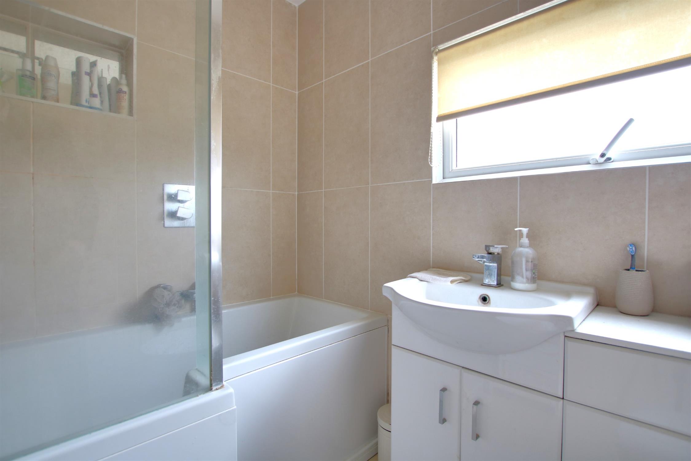 Contemporary three piece suite comprising; space saver bath with separate shower over and central tap, vanity hand basin and concealed cistern w.c. Obscure double glazed window. Smooth plastered ceiling with inset spotlights.