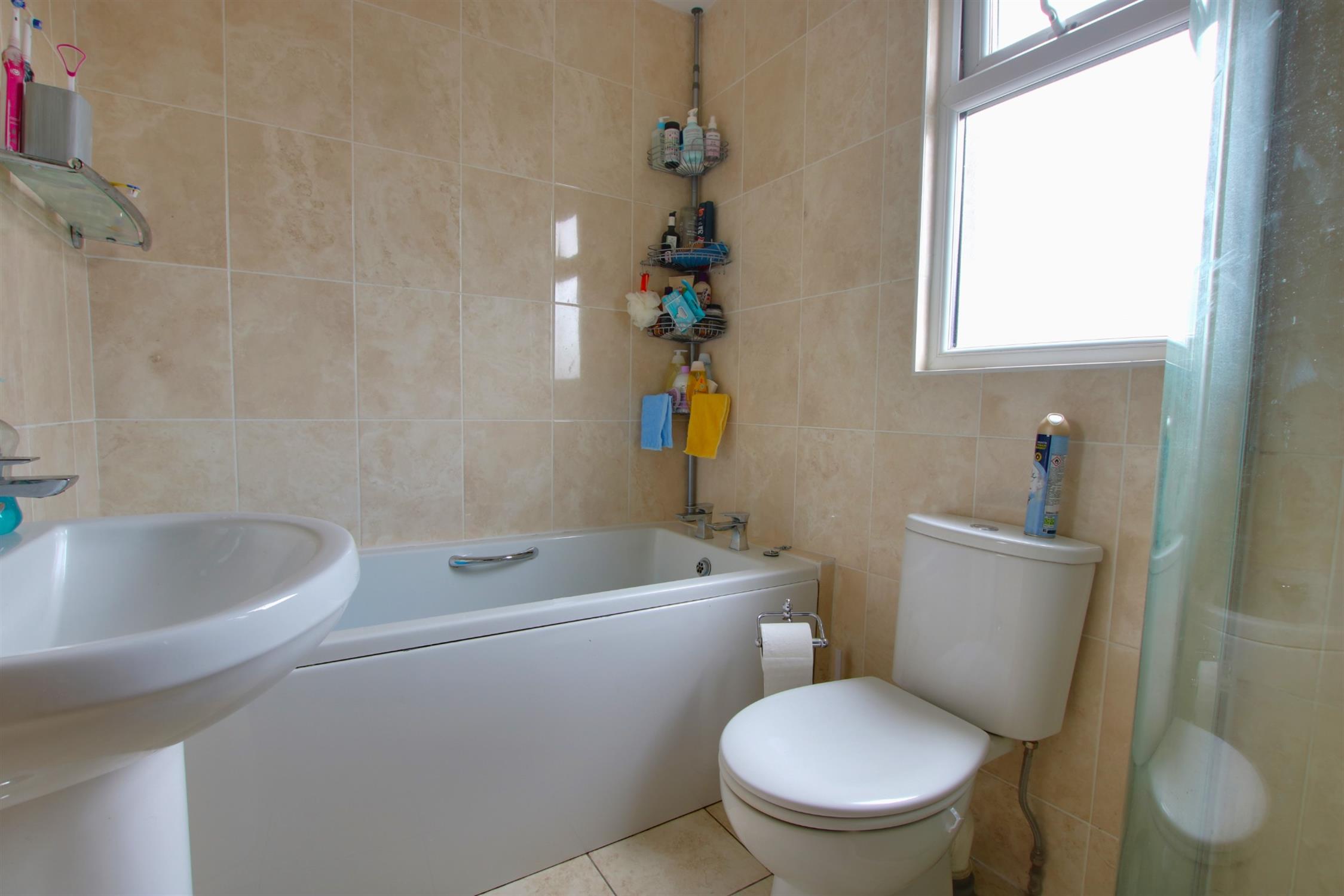 Contemporary four piece suite comprising; panel bath with separate quadrant style shower shower, wash hand basin and Low level w.c. Obscure double glazed window. Smooth plastered ceiling. Chrome finish towel rail/radiator combination. Extractor fan. Tiled wall surfaces and tiled flooring. Oak veneer internal door.