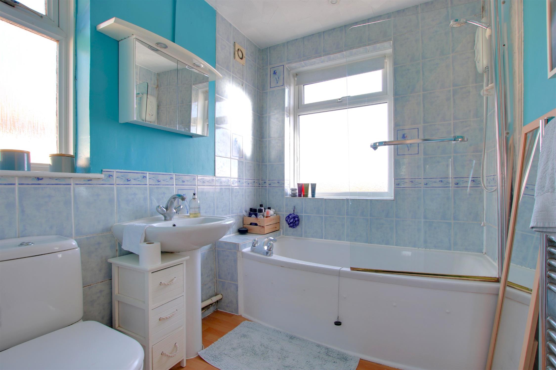 Laminate flooring. Partially tiled walls. Panel enclosed bath with electric shower. Low level W.C and wash basin. Extractor fan. Obscure double-glazed windows to side and rear aspect. Heated towel rail.