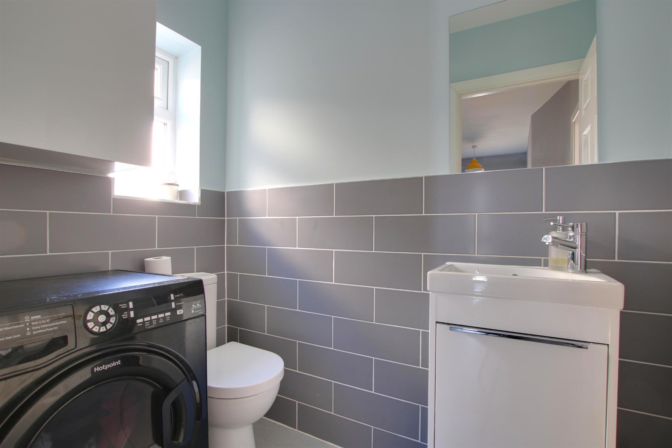 Tiled flooring. Low level W.C and wash basin. Space and plumbing for washing machine. Obscure double-glazed window to side aspect. Underfloor heating.