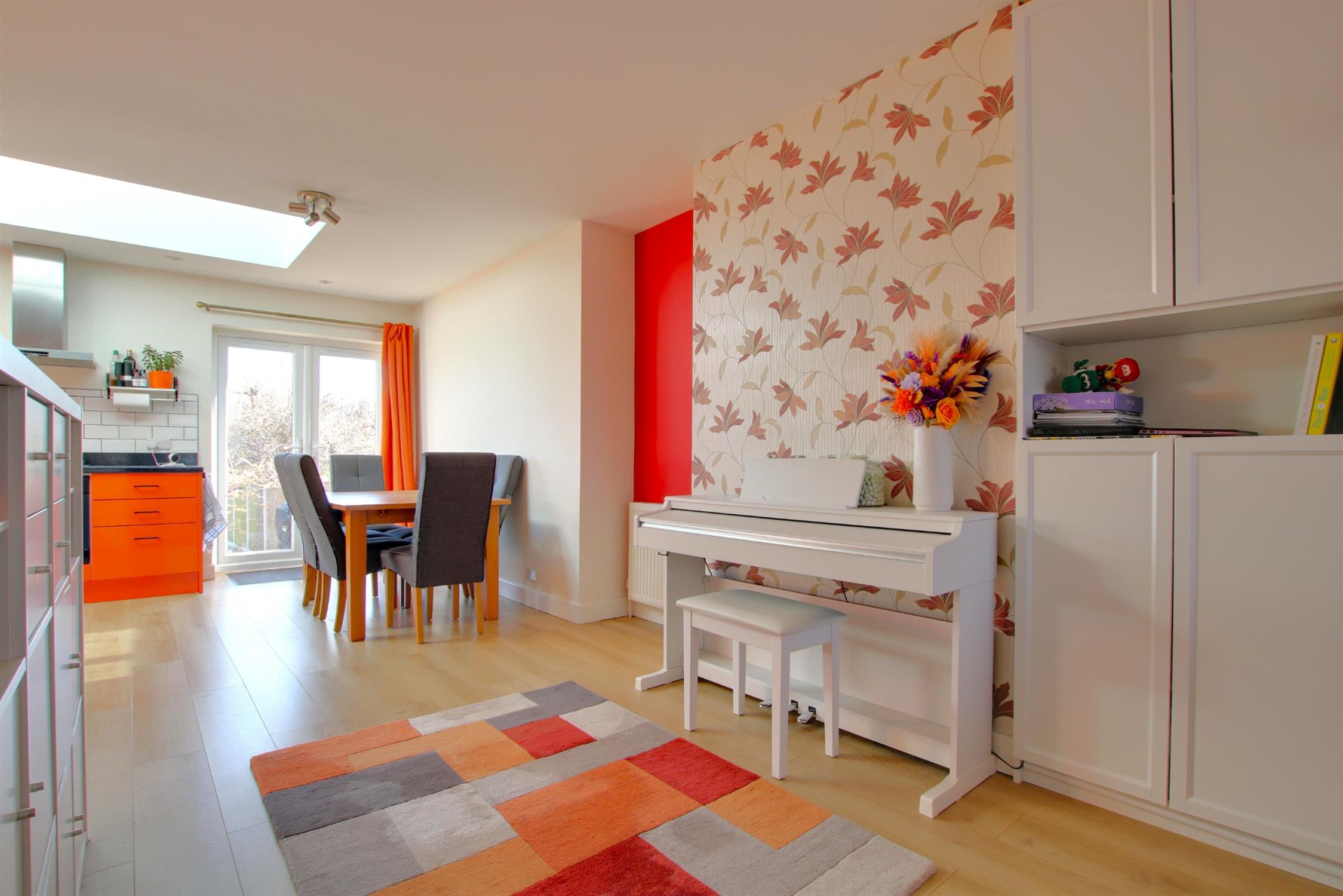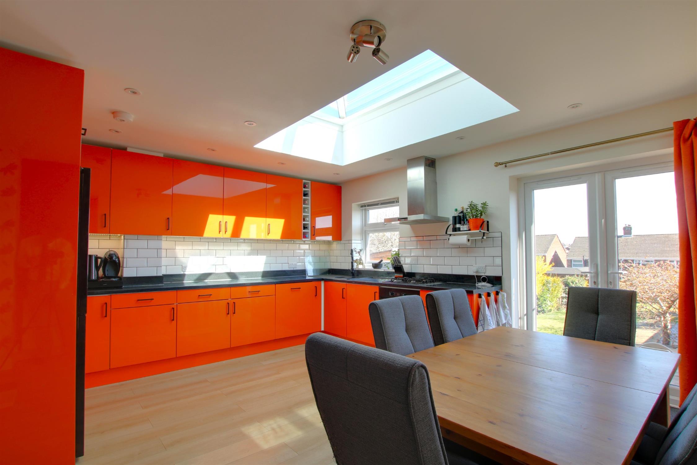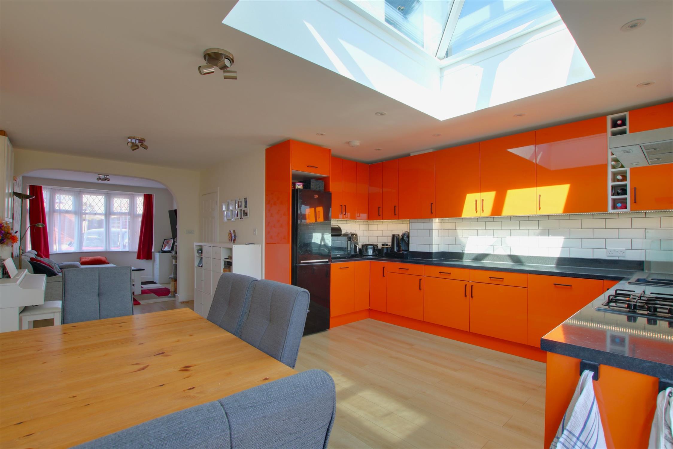 Laminate flooring. Kitchen comprises matching wall and base units with under counter LED lighting and tiled splashback. Inset sink with drainer. Integrated dishwasher. Integrated electric fan oven, gas hob and extractor fan. Space for fridge-freezer. Patio doors leading to garden. Double-glazed lantern roof light. Double-glazed window to rear aspect. Radiator.