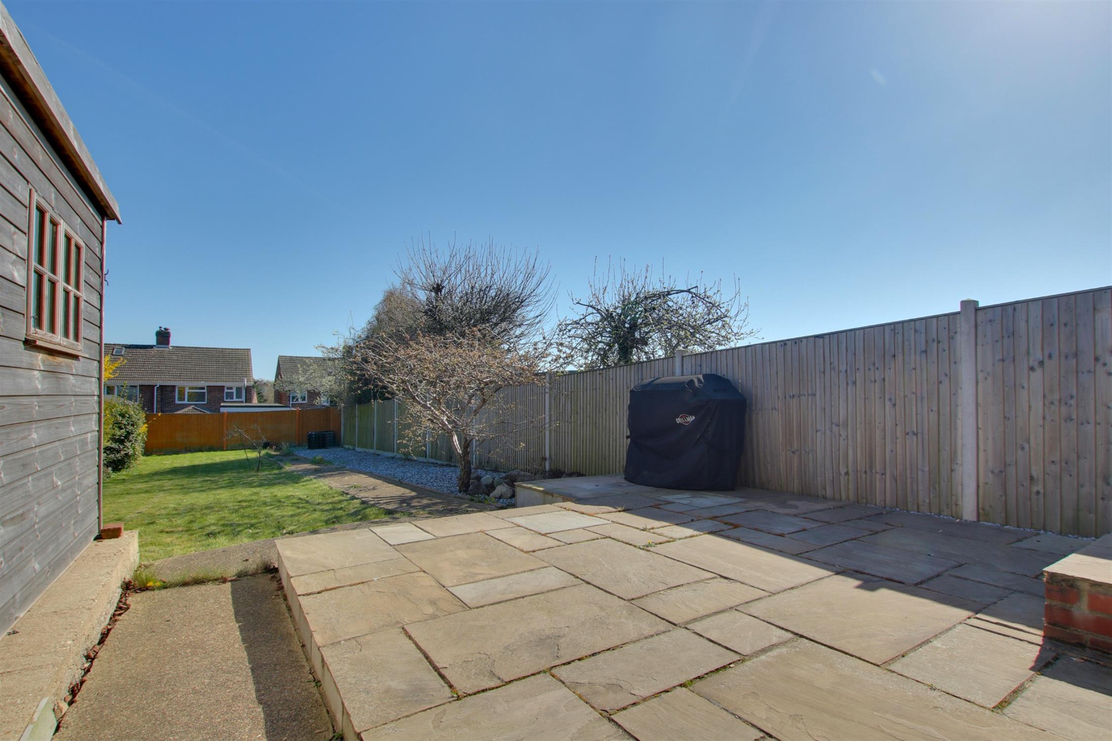 The rear garden is fully enclosed with paved patio area. Paved path leading to rear of the garden. Area laid with lawn with shrub borders and a separate area laid with shingle. Timber framed workshop. Outside sockets. Outside tap. Gate providing side access.