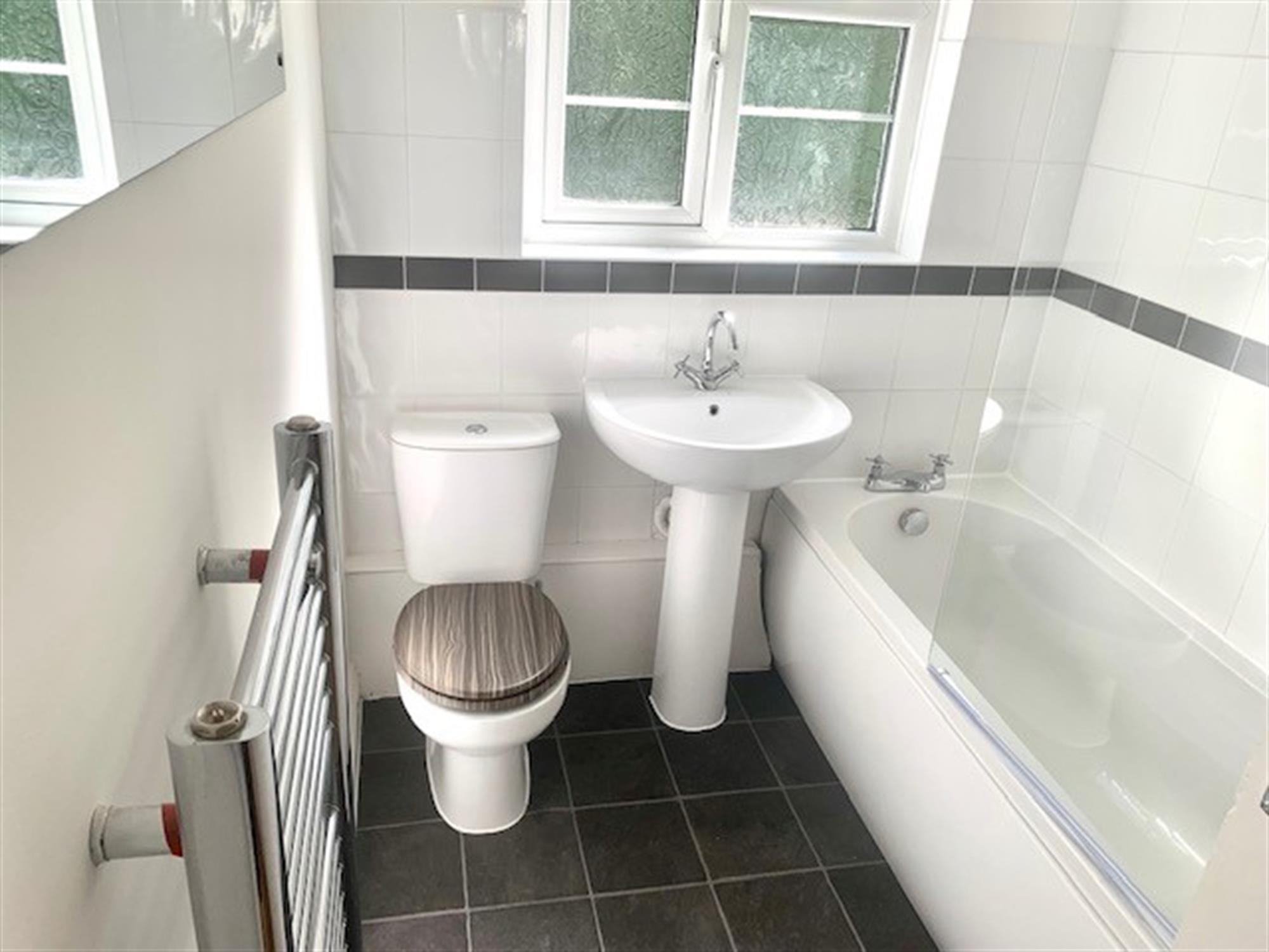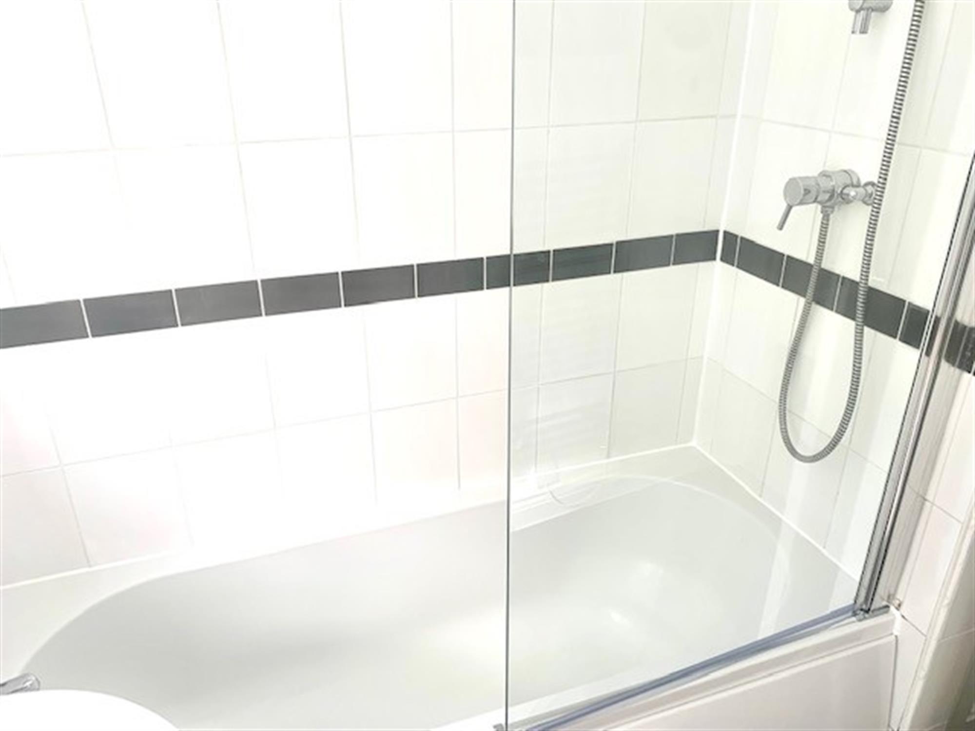 BATHROOM - White bathroom suite with bath with shower over, toilet and basin. Storage cupboard.