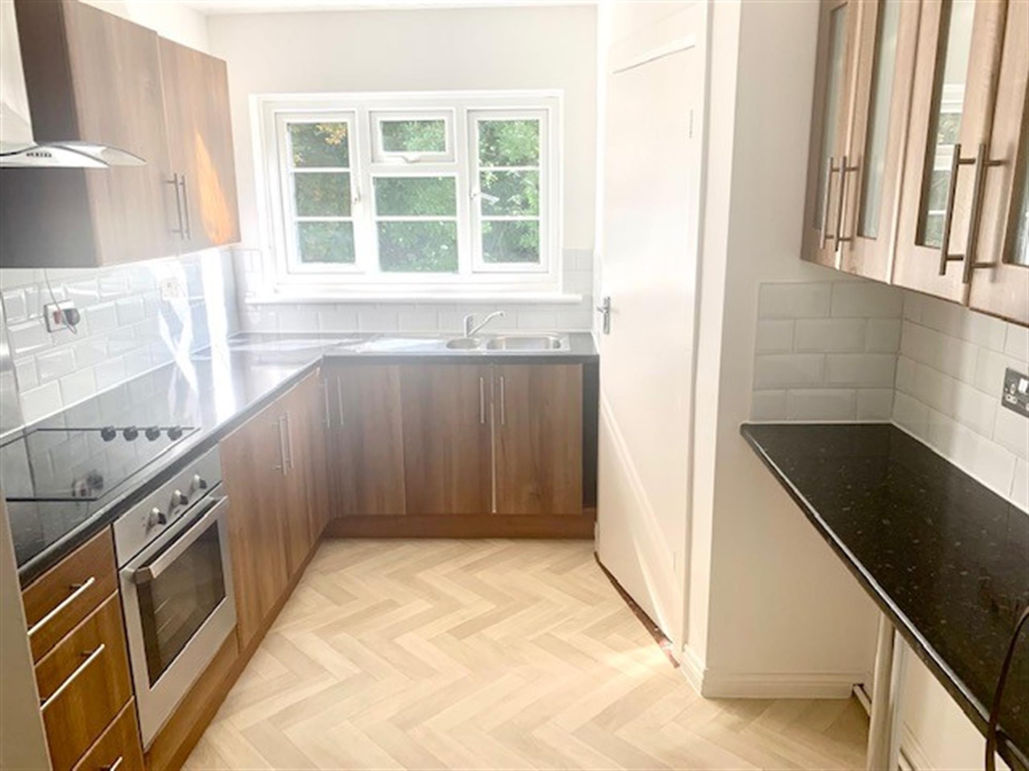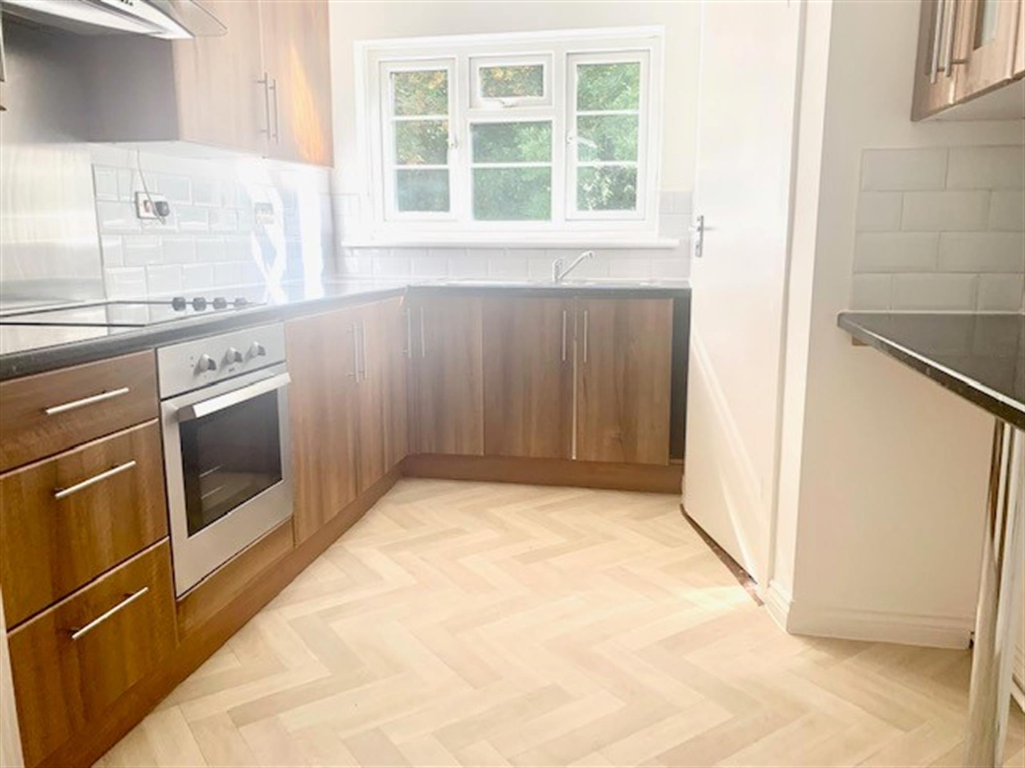 KITCHEN - Spacious fitted kitchen with various wall and base units. Window to rear. Appliances consisting of: Fridge/freezer, electric hob, electric oven. Cupboard off with storage and housing washing machine.