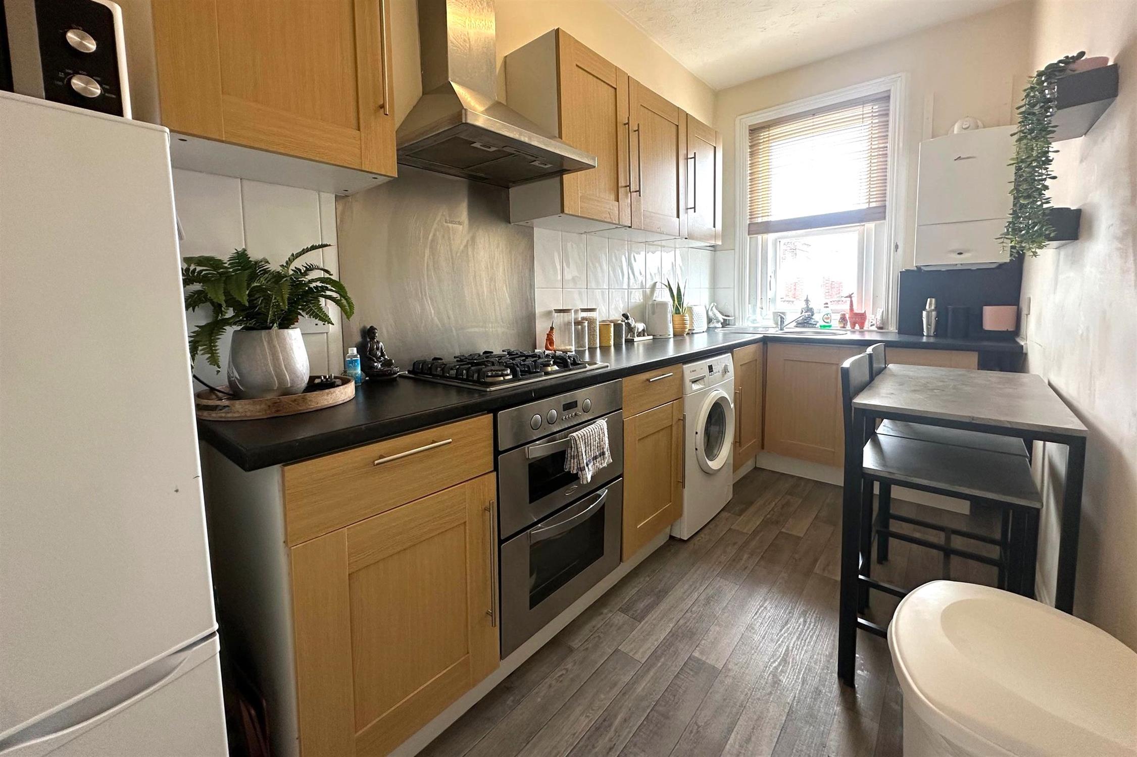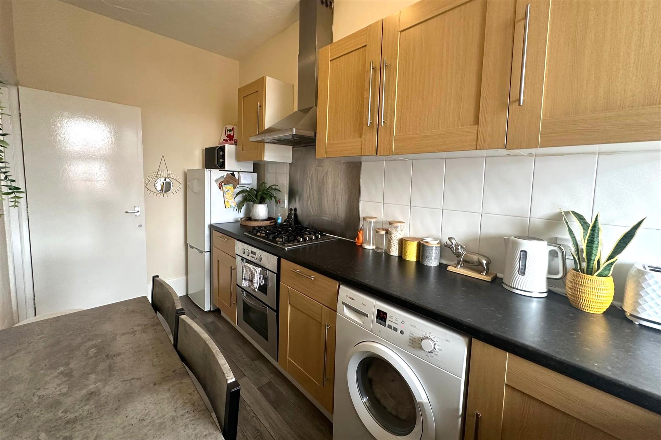 KITCHEN - Fitted kitchen with electric oven & gas hob. Space for own white goods.