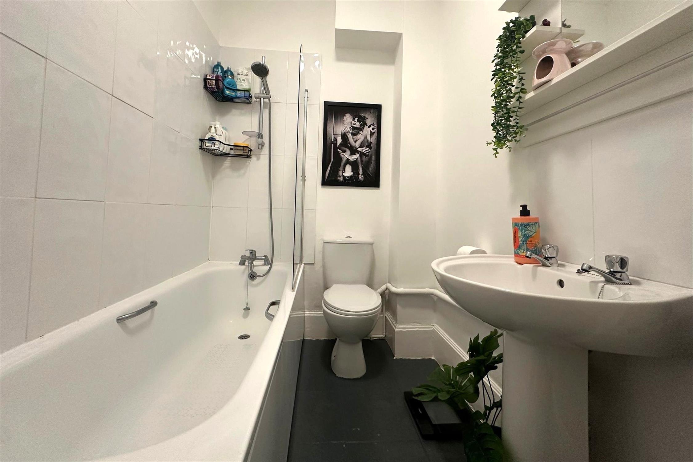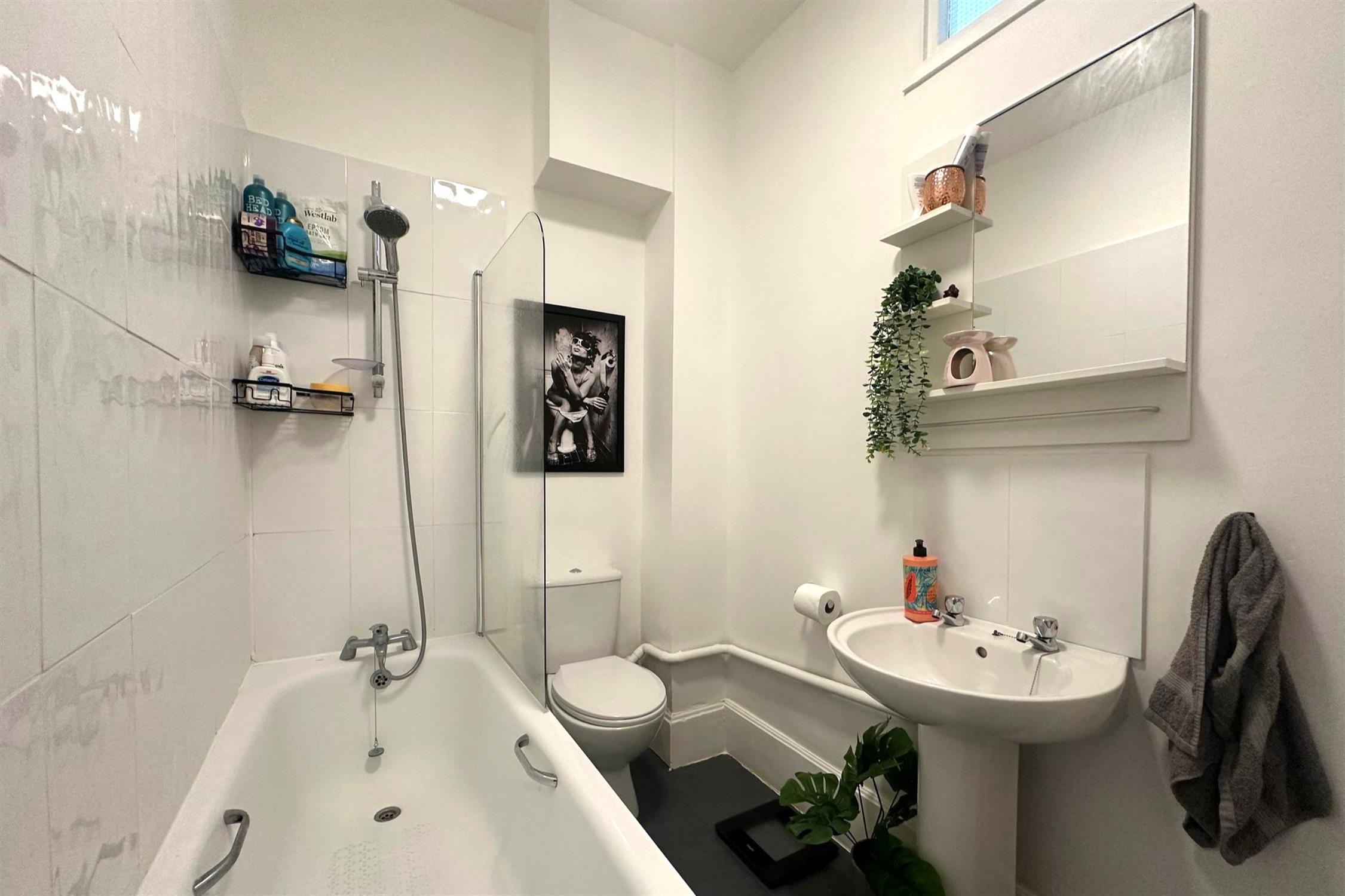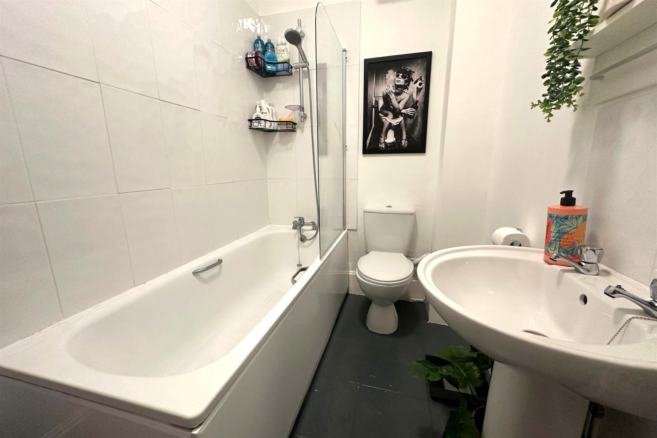 BATHROOM - Shower over bath, w/c, basin.