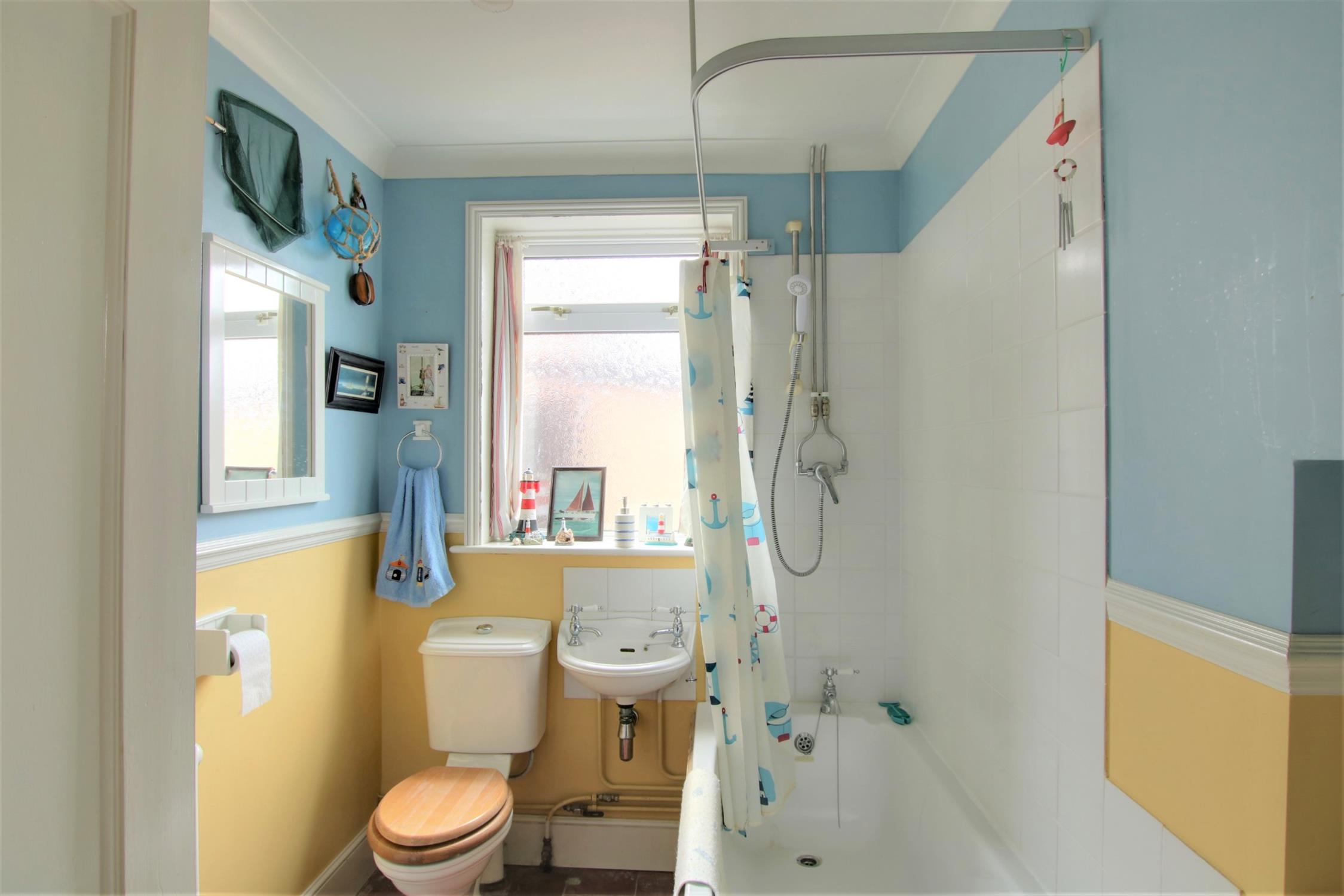 Double glazed window to the side aspect. Low level WC. Wash hand basin. Bath with thermostatic shower over. Radiator. Plumbing for washing machine. Tiling.