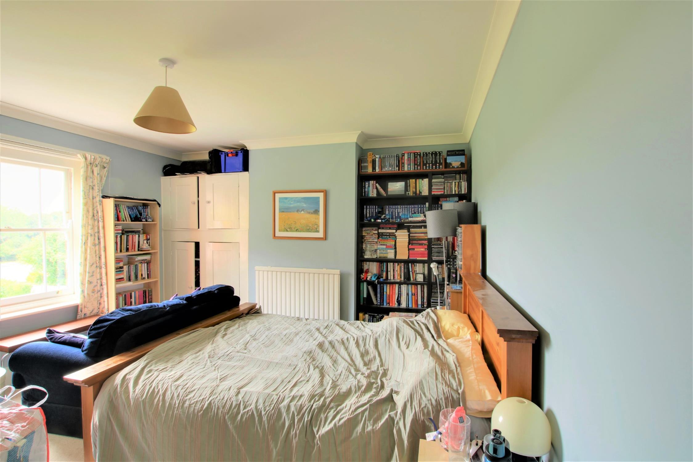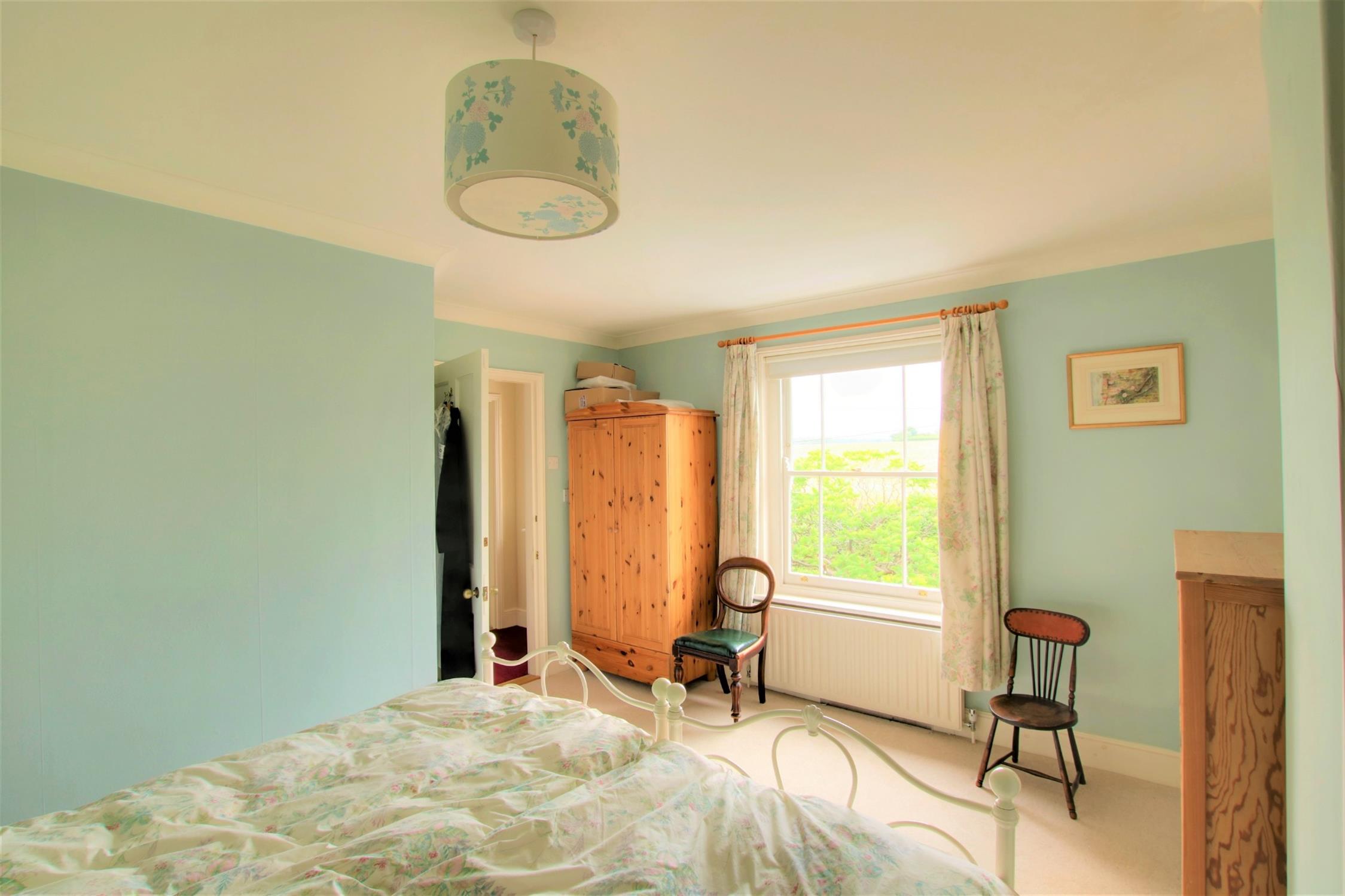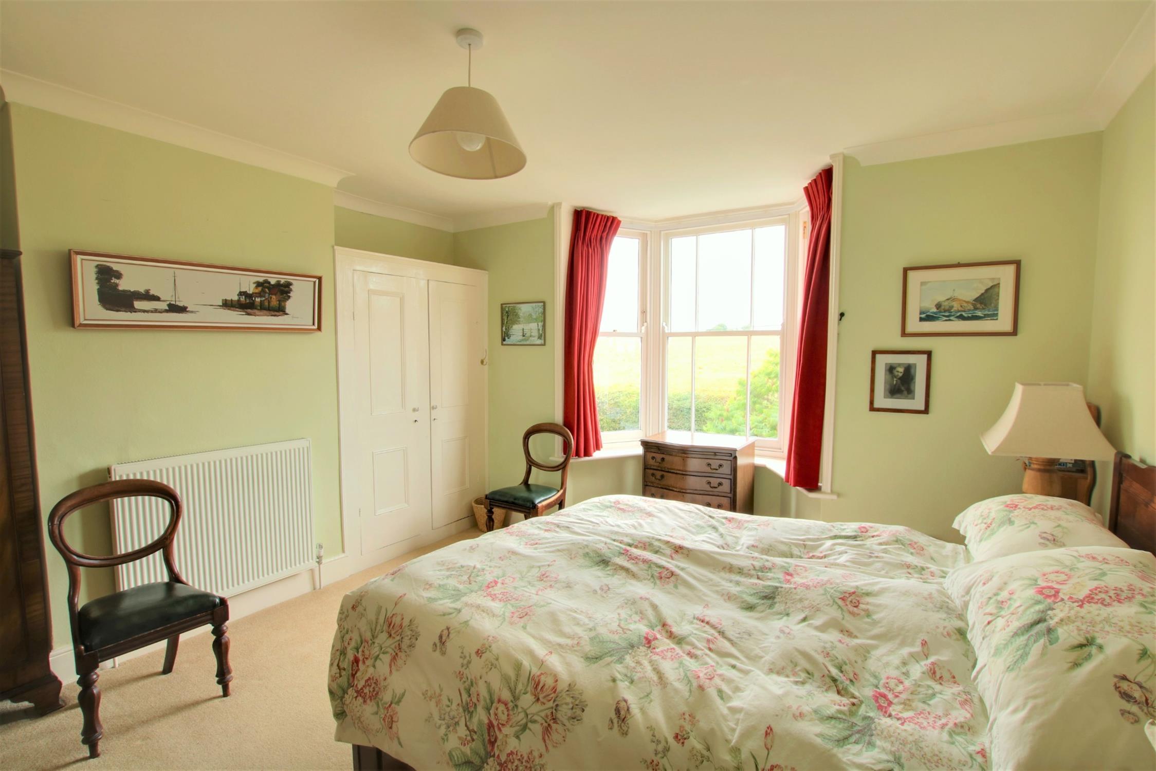 Traditional style sash bay window, with a view to the front overlooking fields. Radiator. Built-in wardrobe.