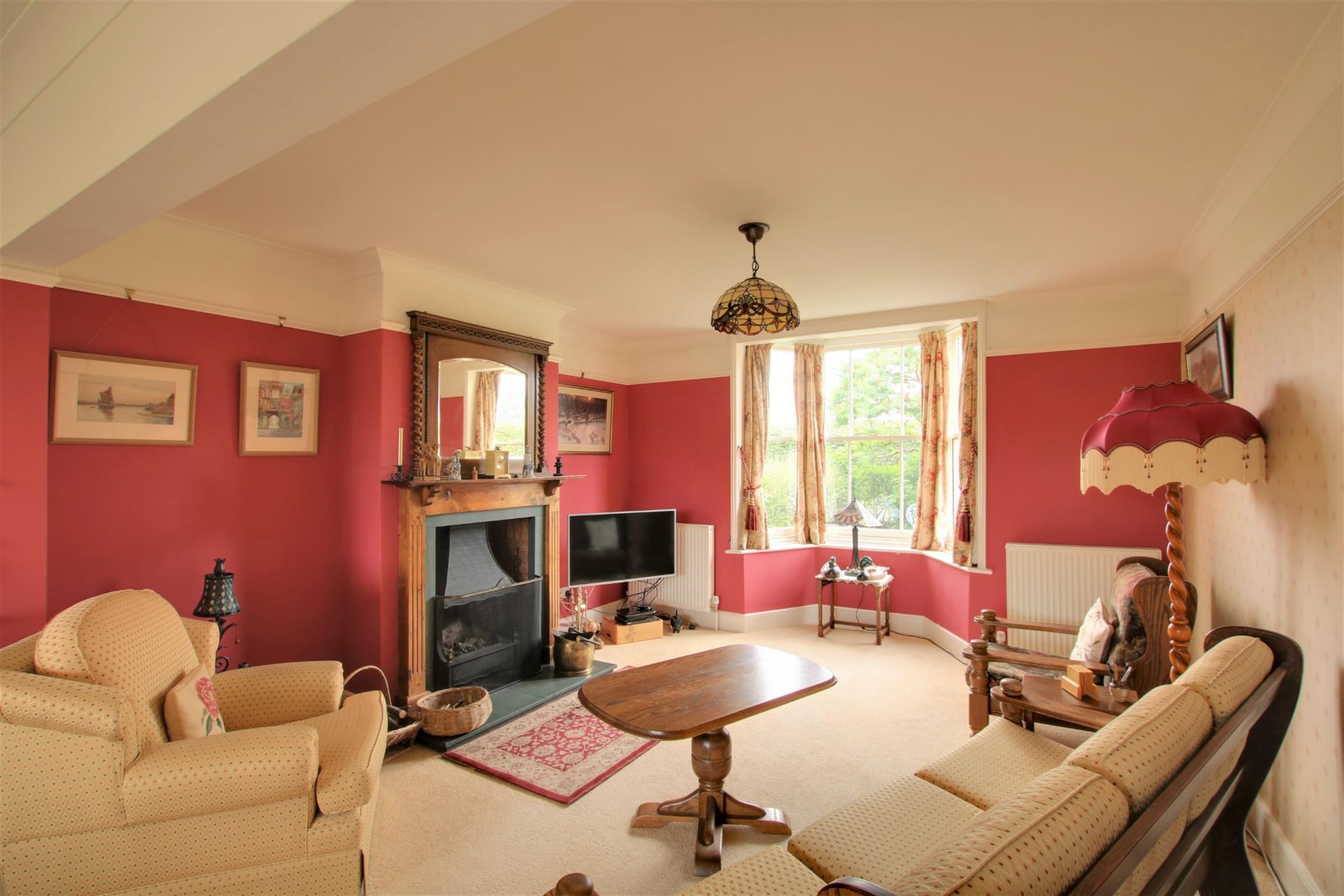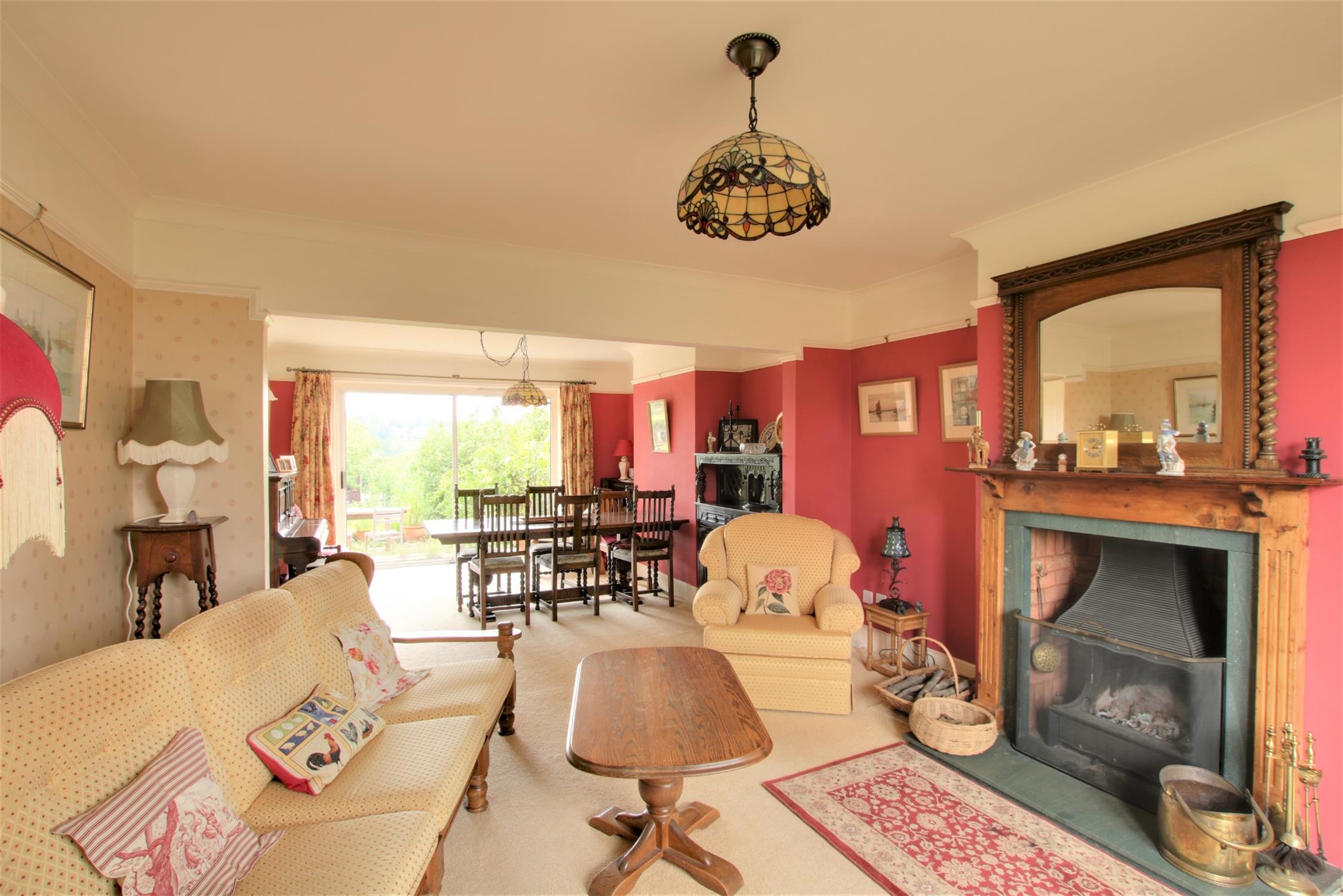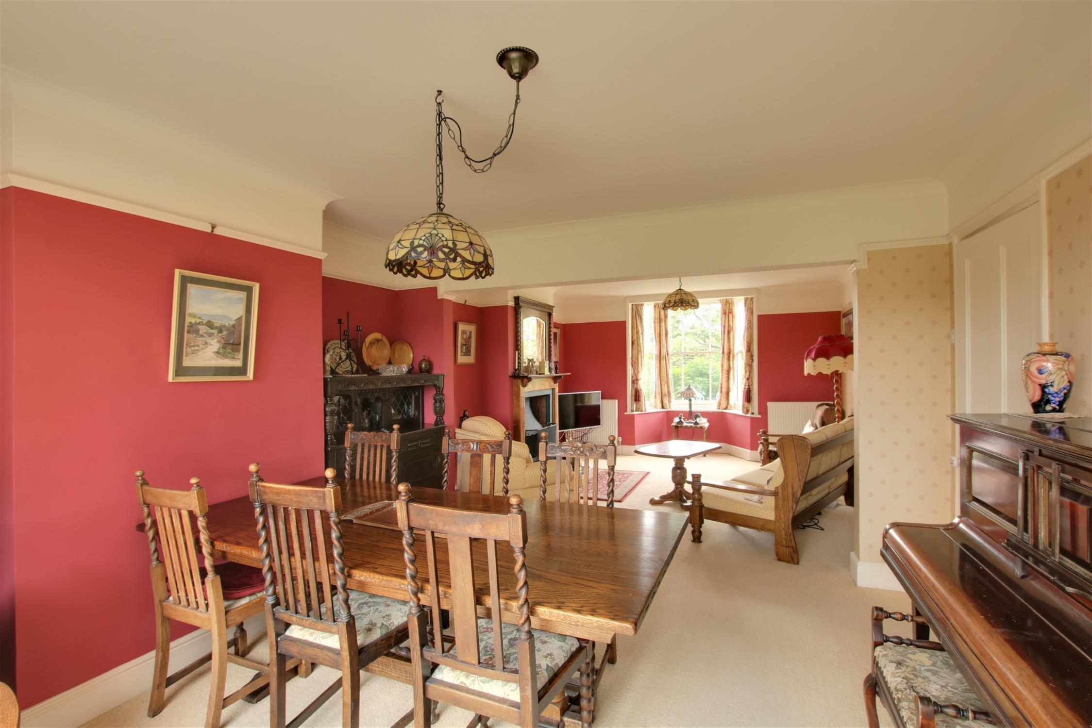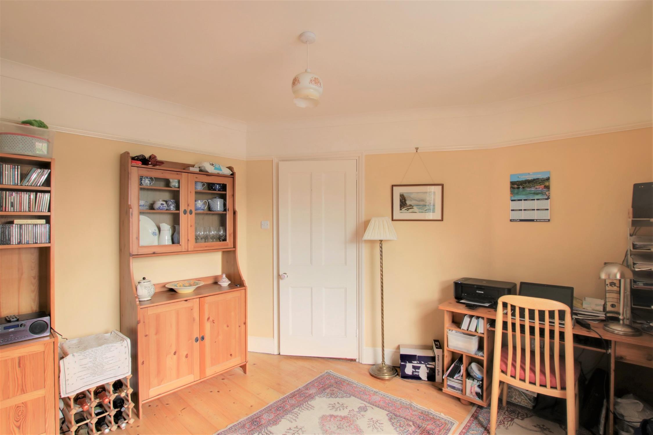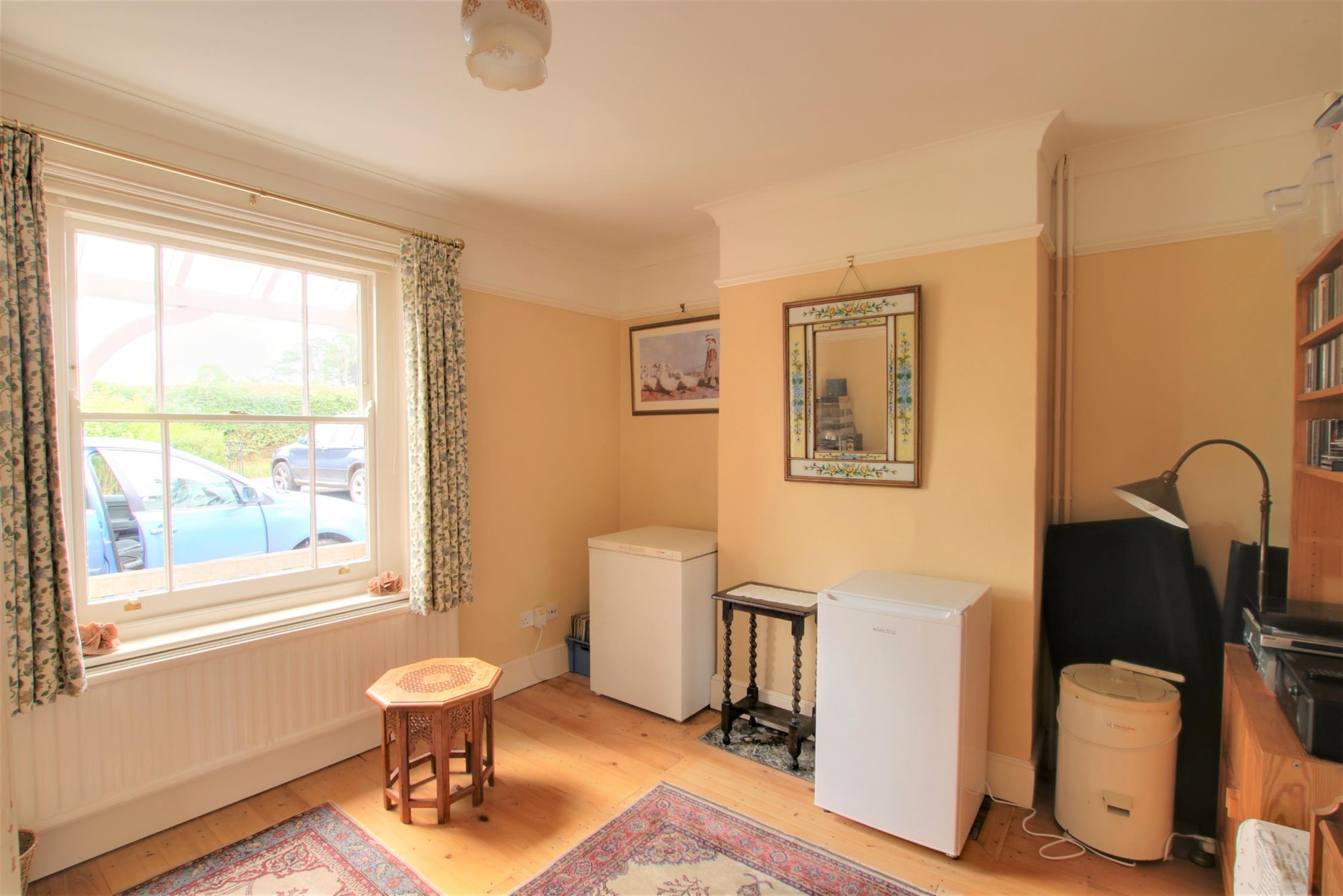 Attractive double aspect room with a traditional style sash bay window to the front aspect and double glazed sliding patio doors overlooking the rear garden and leading onto the rear terrace. Open fireplace. Three radiators. Picture rail.