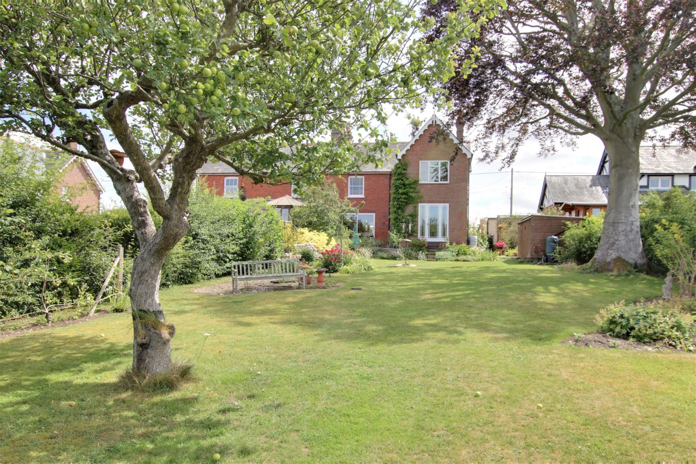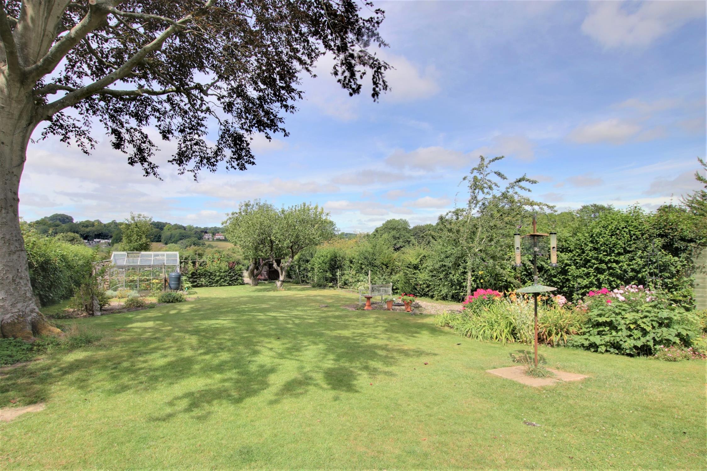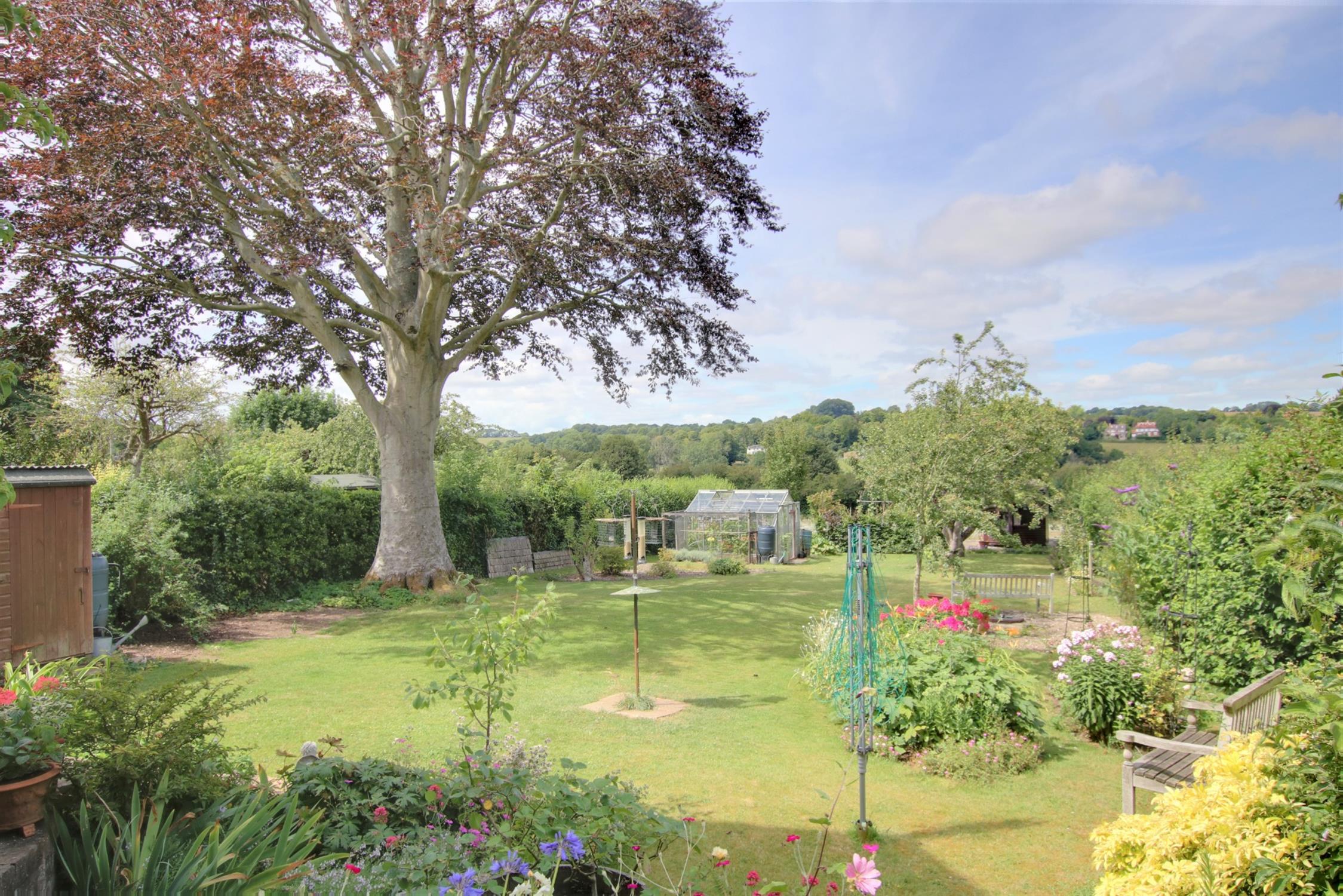 The generous sized gardens extend to the front and rear and are well stocked and planted with a variety of borders, shrubs and trees. The front garden has space for parking, and leads to the DETACHED GARAGE. There is side access to the rear garden, which enjoys a fabulous aspect with views over the beautiful surrounding countryside and when the sun allows a perfect view of the sunset. There is a sheltered terrace to the rear of the house and a further secluded paved and screened seating area. Garden store and greenhouse.