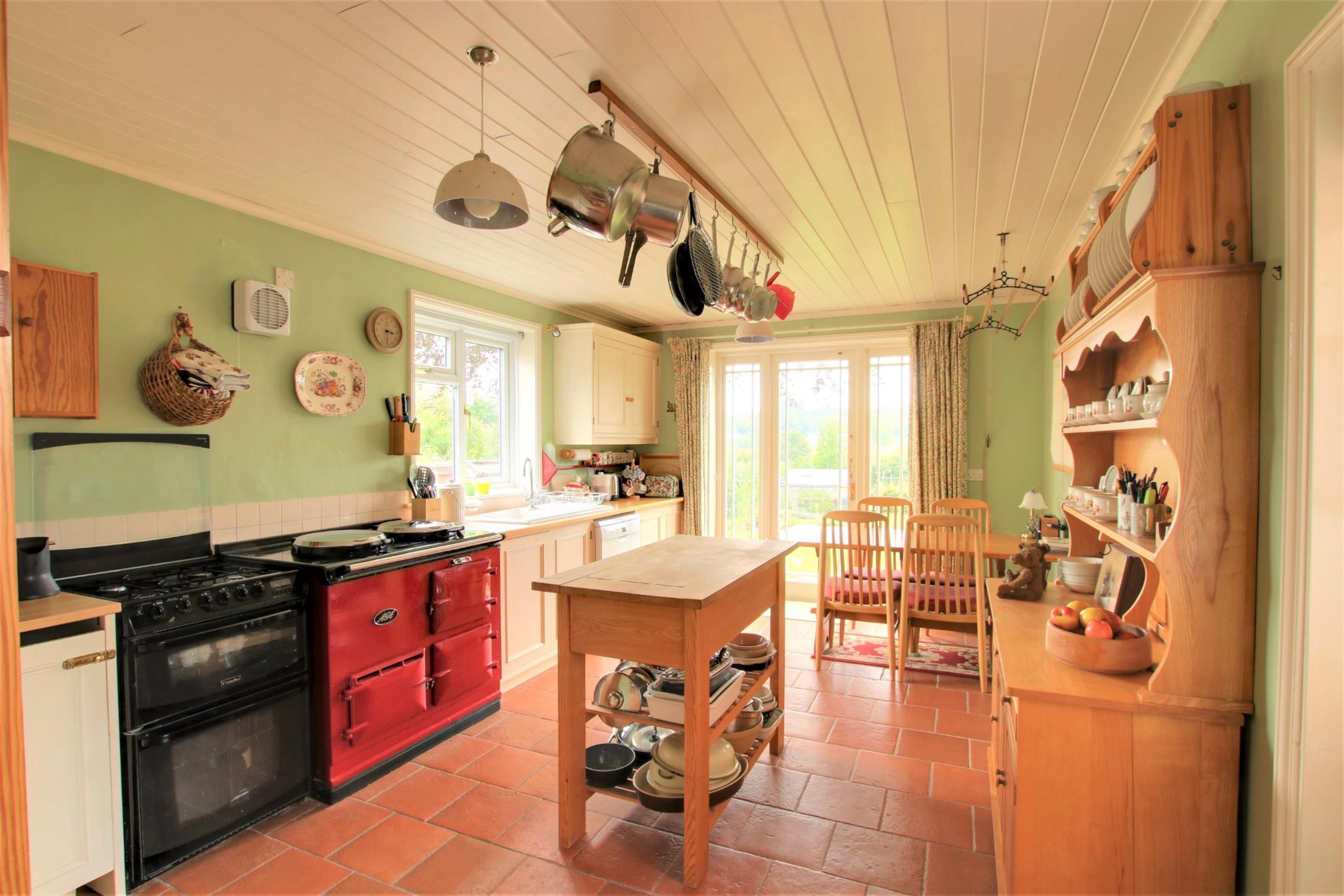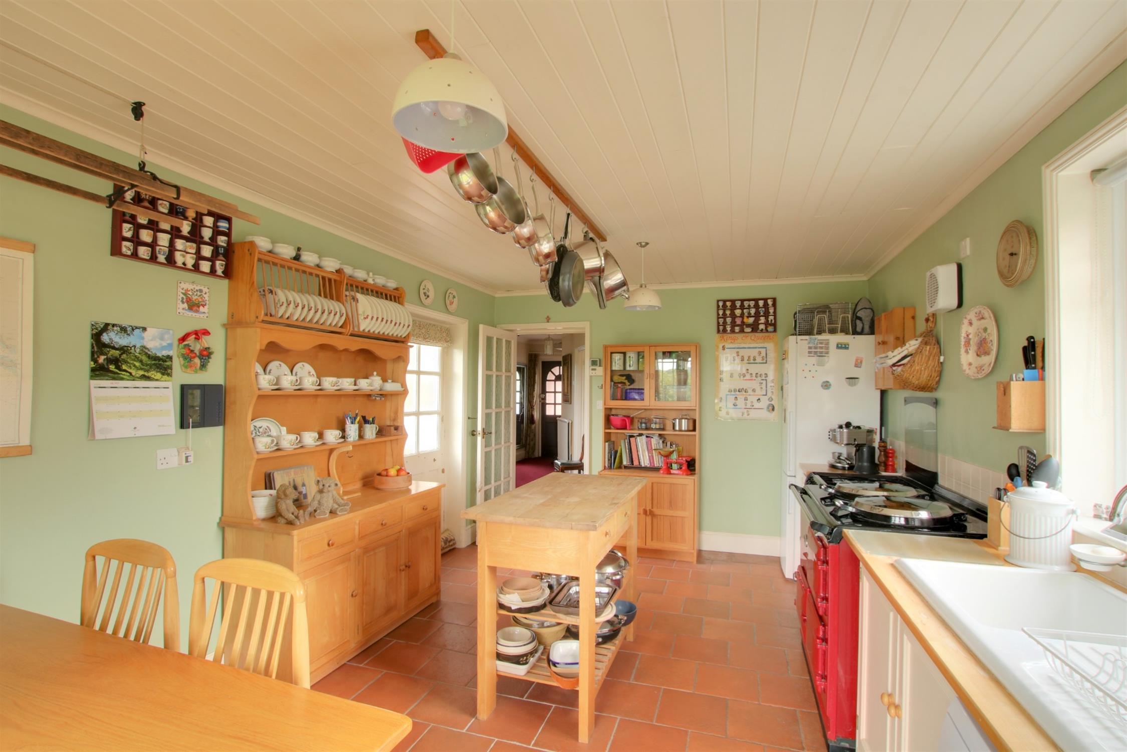 Attractive country style kitchen with space for a table and a views out over the rear garden. Fitted to one wall with shaker style units and a white sink unit, together with appliance space for fridge/freezer, 13A electric Aga and an LPG cooker. Glazed door leading to the rear garden, door to the side and window to the side aspect. Tiled floor.