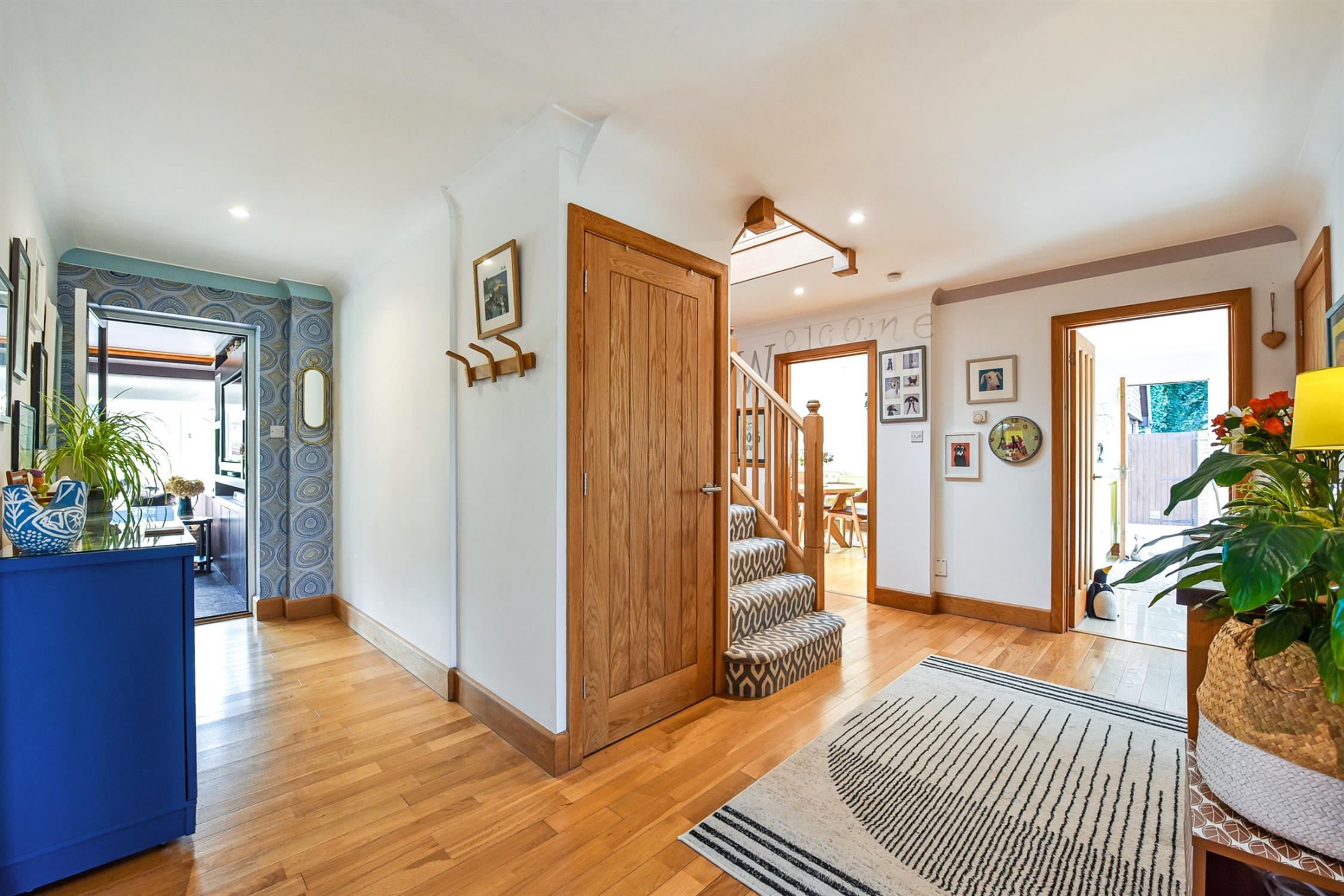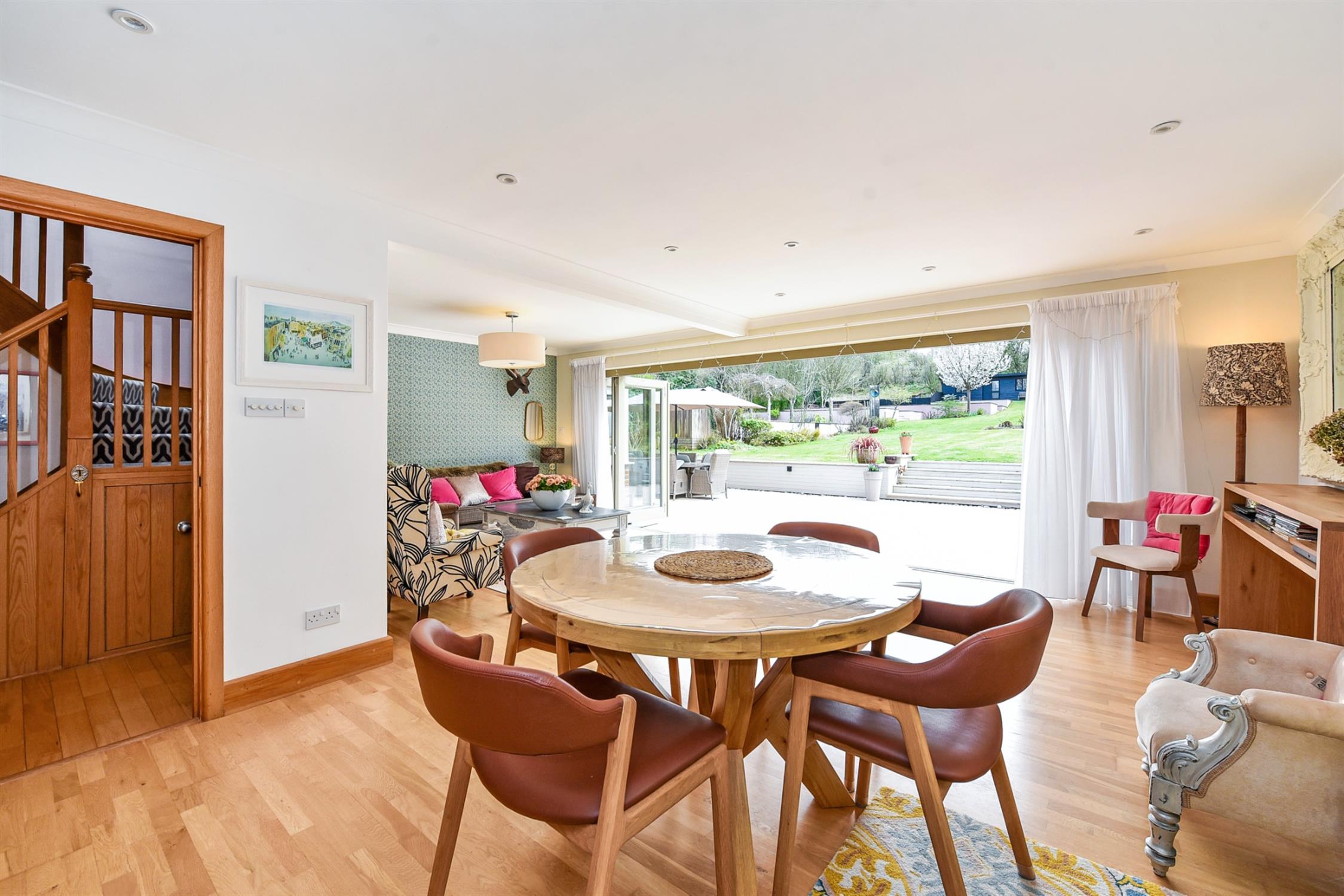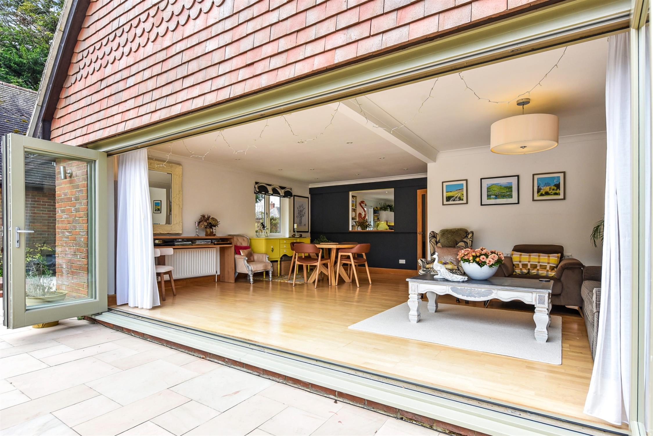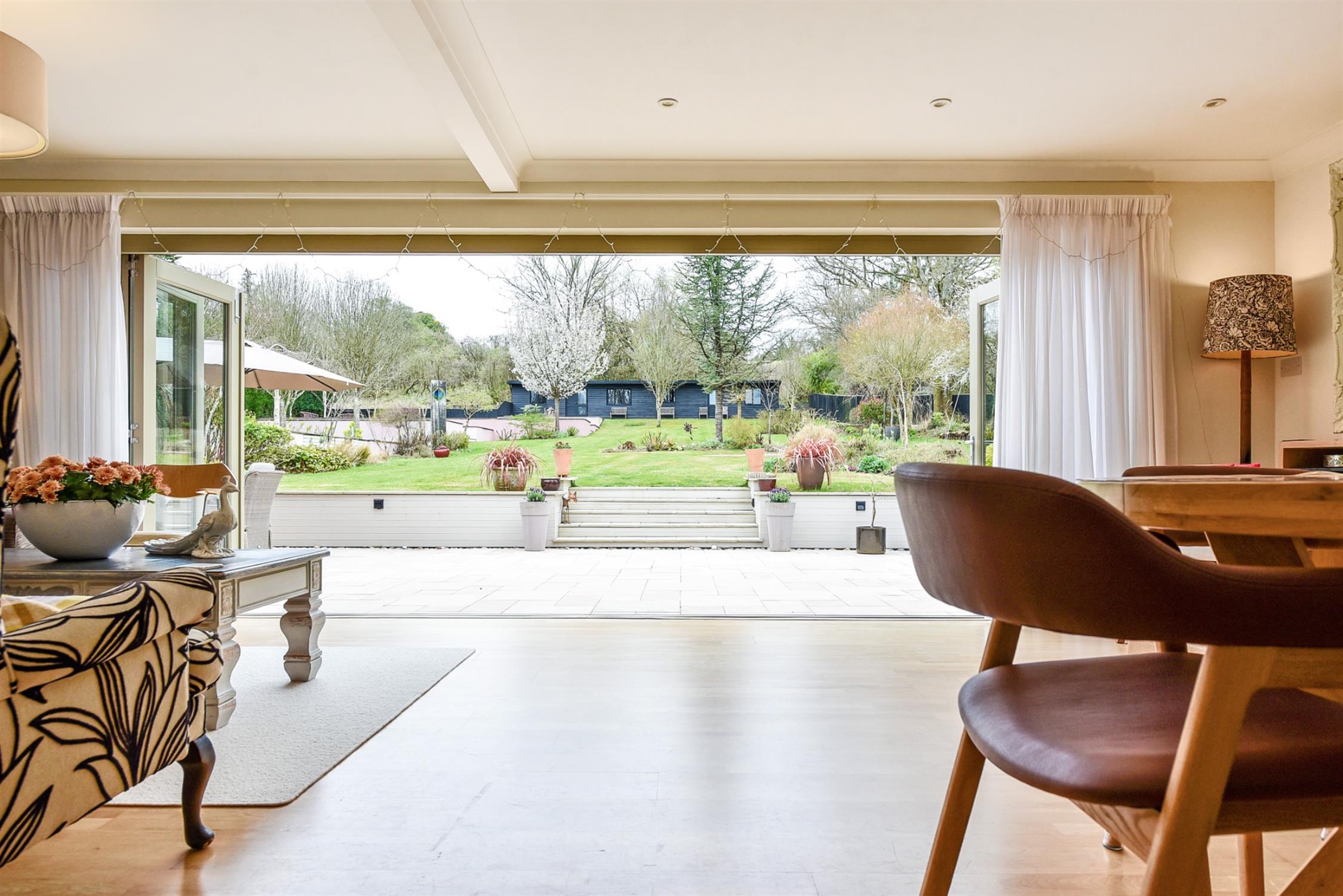 A bright and sunny double-aspect open-plan space. 6-panel bifold doors open most of the wall onto the patio, offering lovely views of the grounds. Ample space for dining and living room furniture. Aperture into the kitchen with sliding doors.