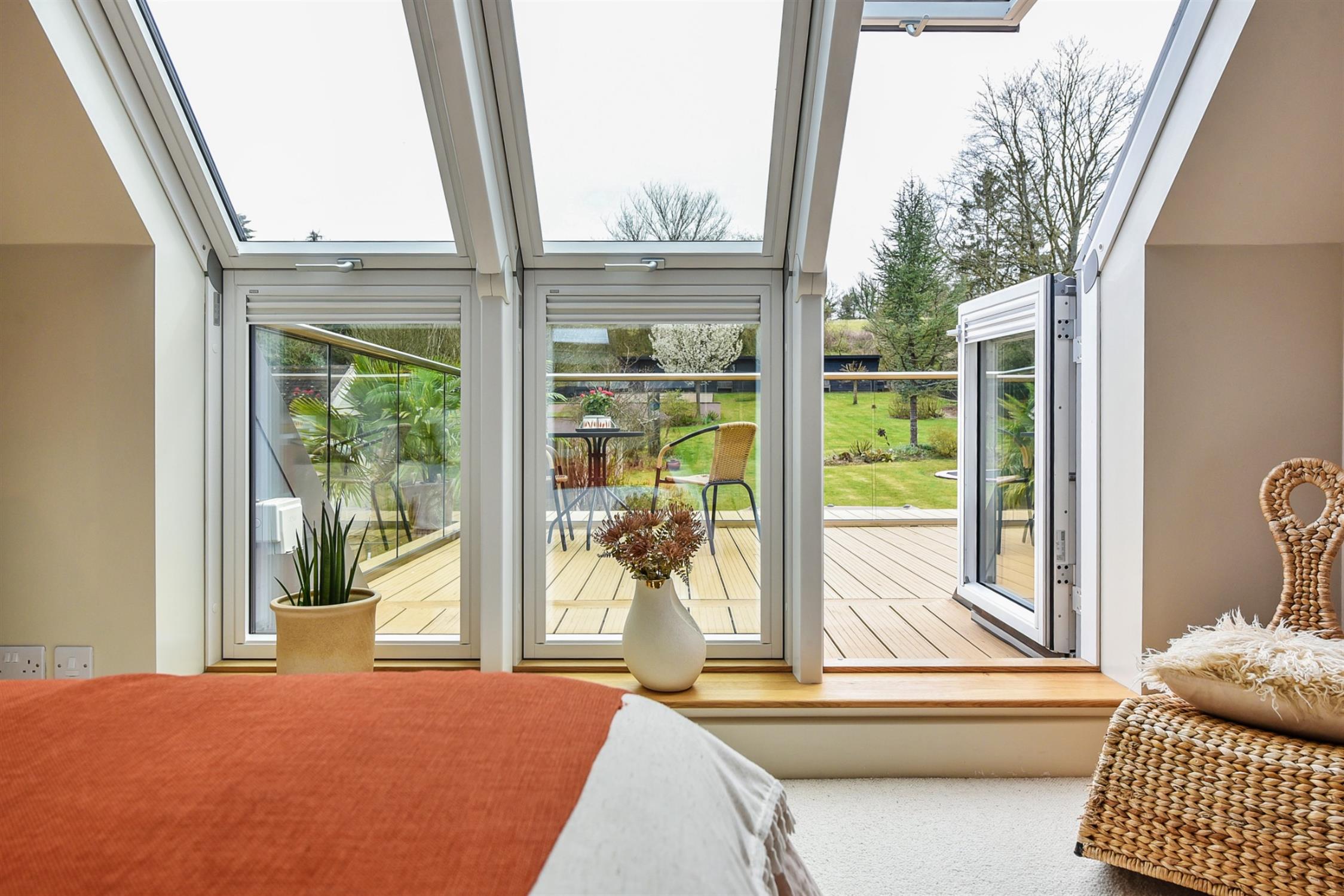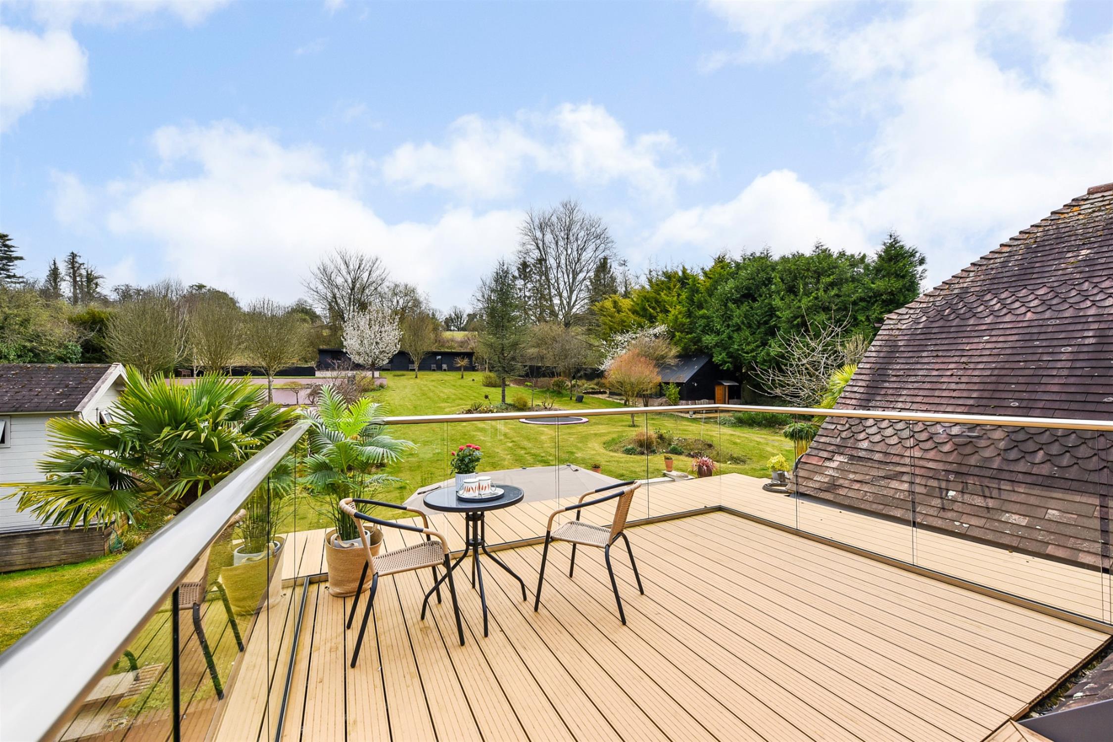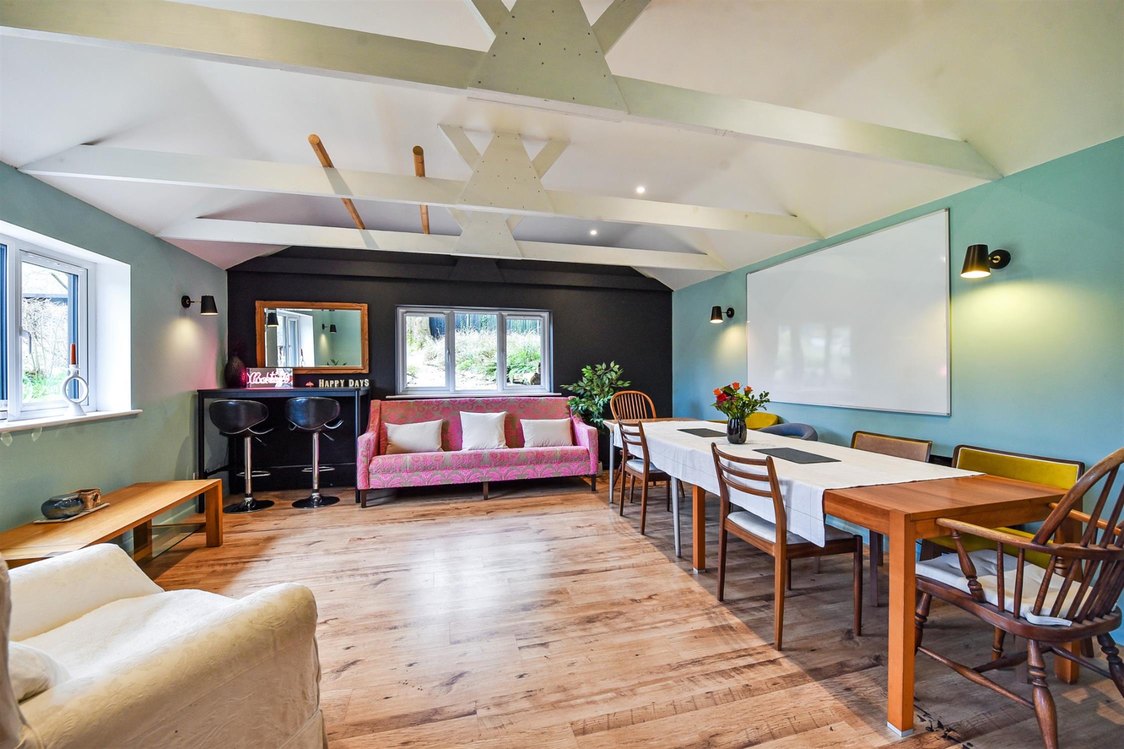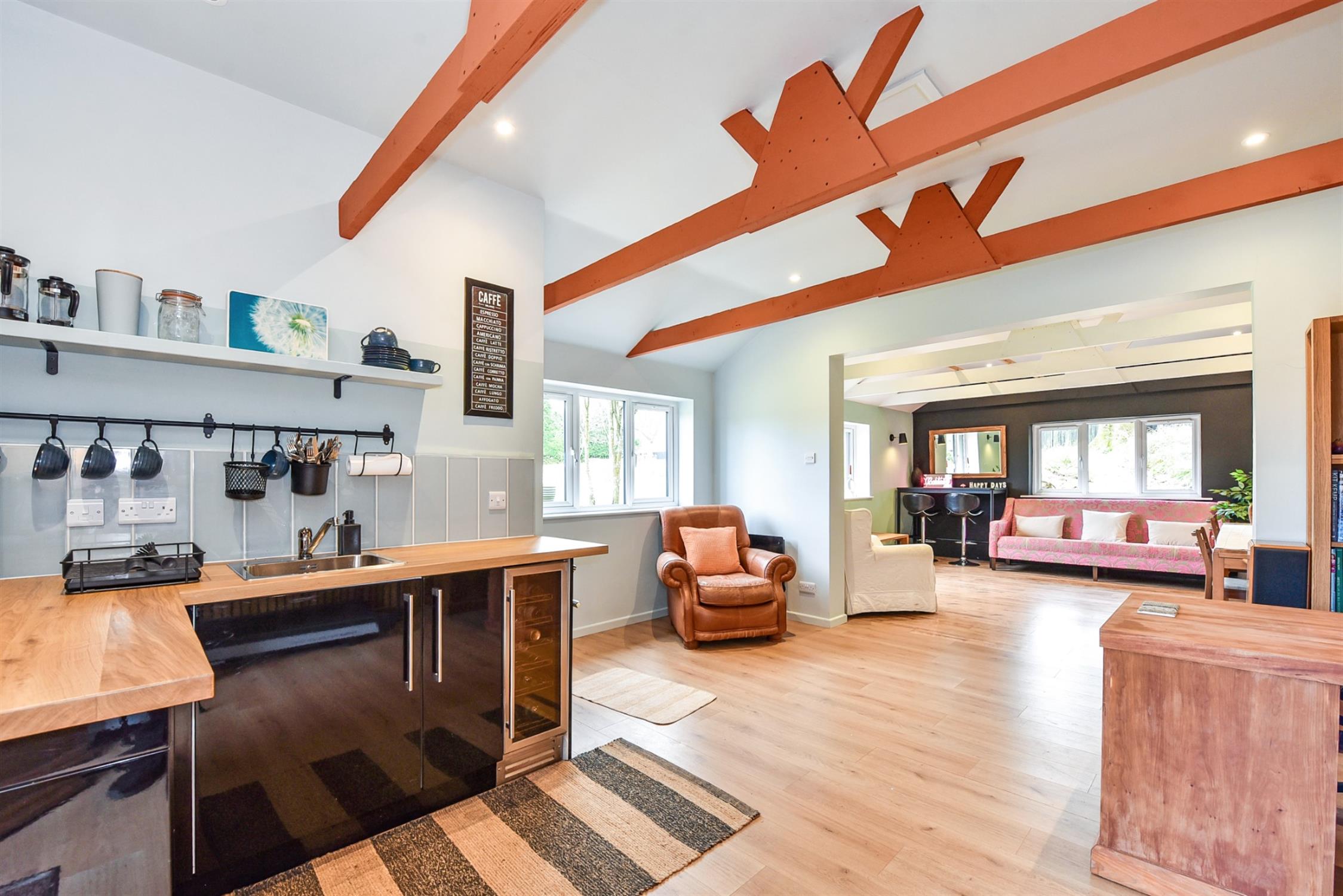 A wonderful space. Perfect for entertaining, with room for a large party. Low-level units with solid wood worktop, storage, wine fridge and dishwasher. Attractive timber panelled feature wall. Beamed ceilings with loft space. Would serve very well as a party space, large gym, den or large home office with plenty of room for large meetings. Composite deck to the side and extended gated driveway for vehicular access if necessary.