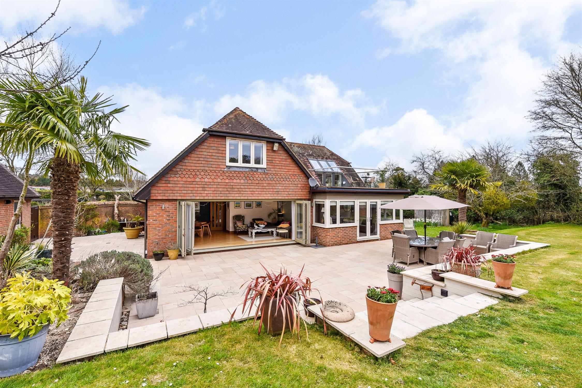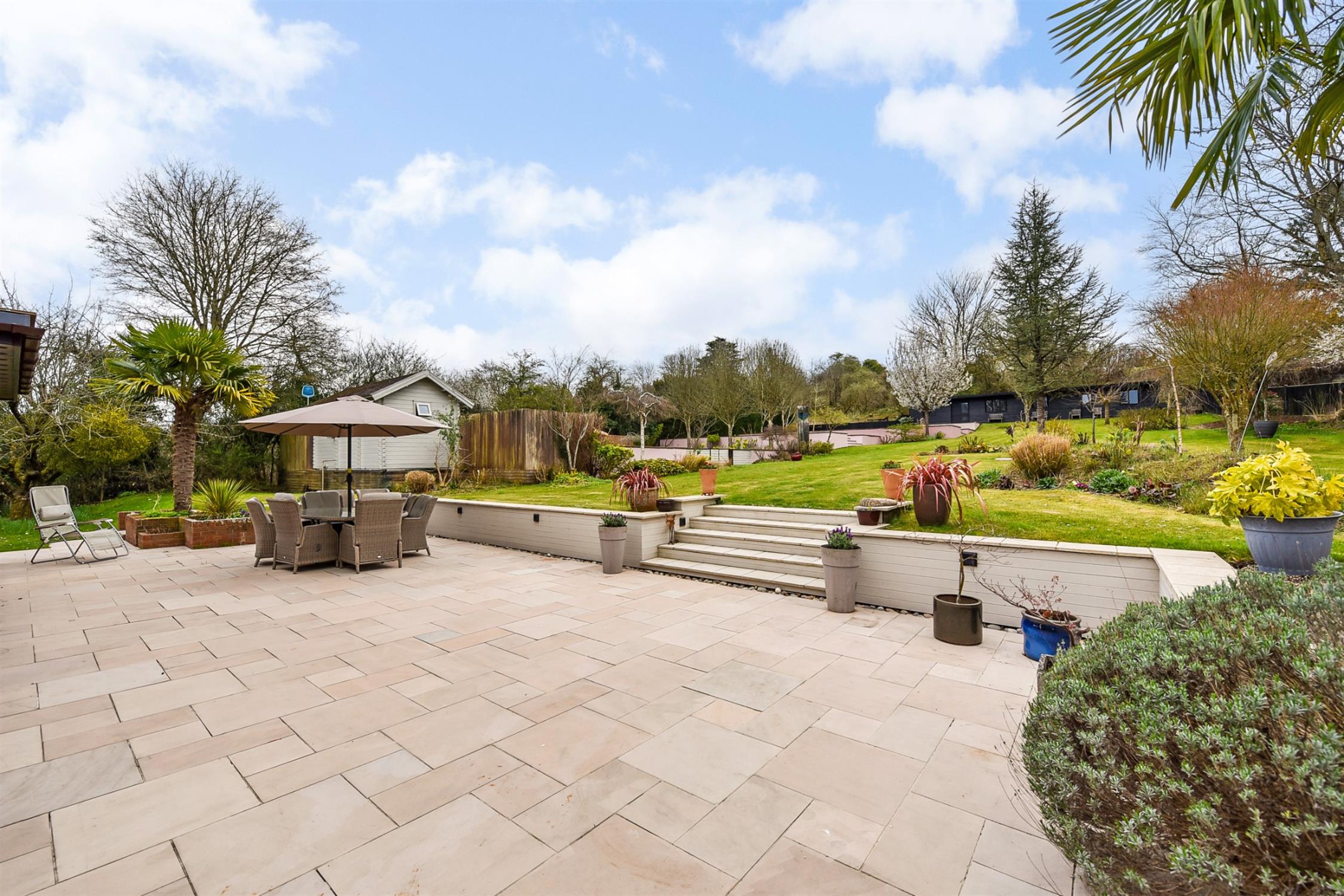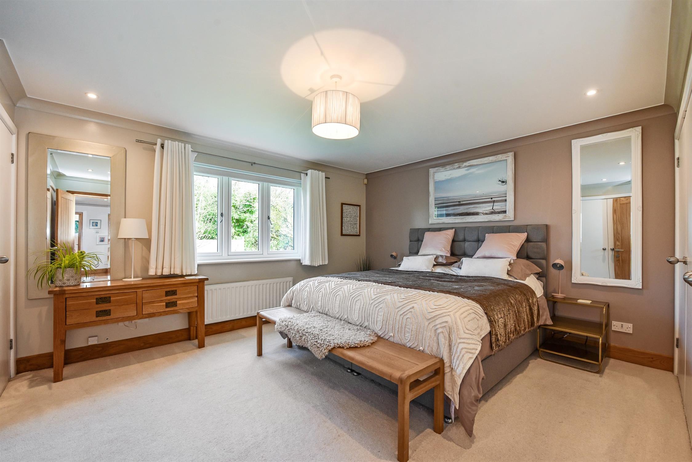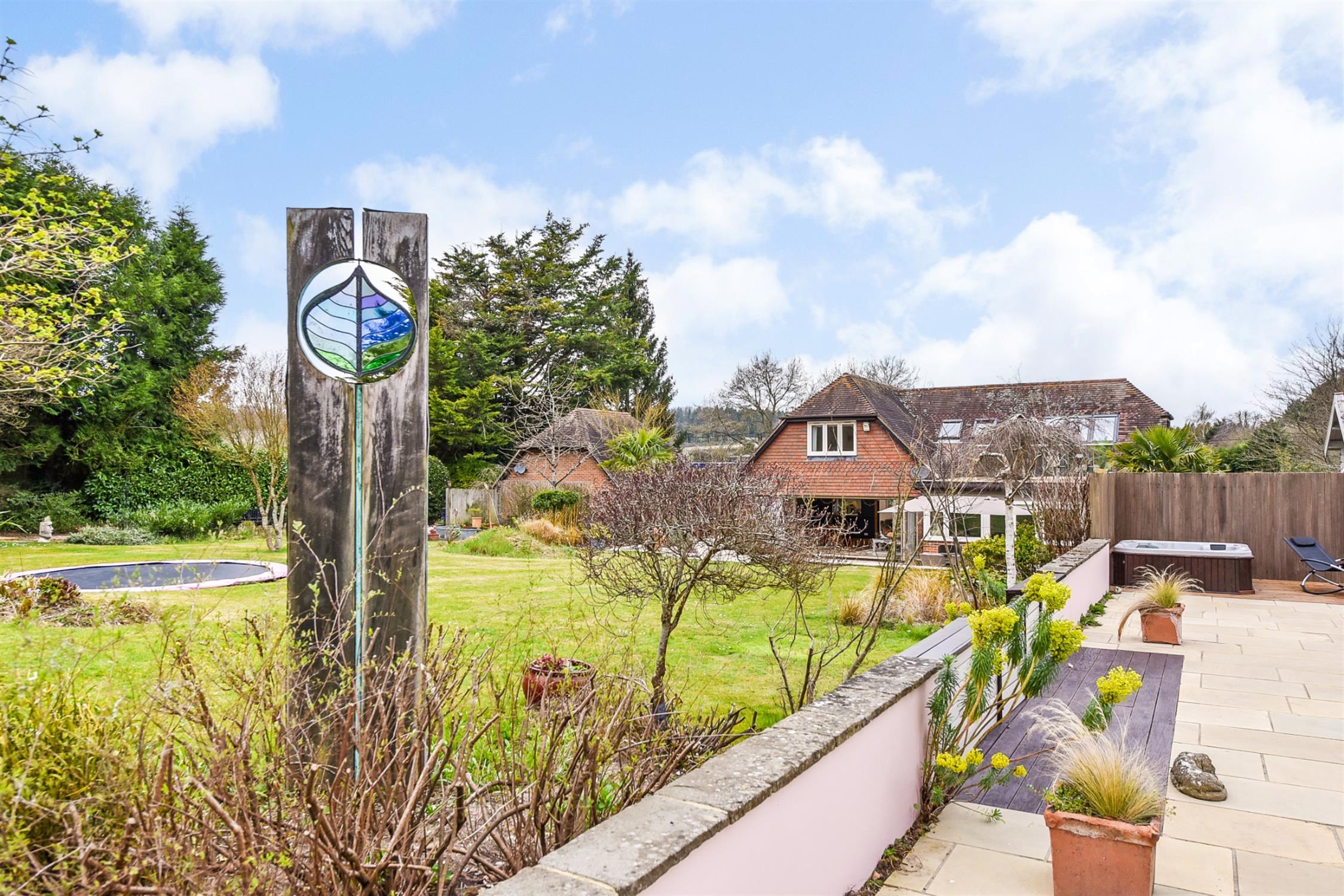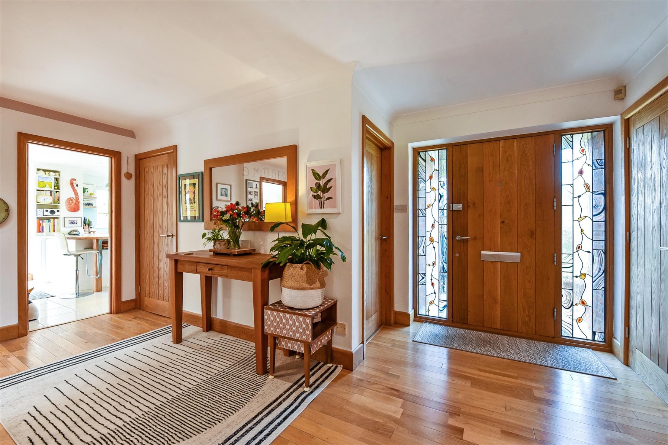 House is situated within an impressive 1.1 acre gated plot at the end of the no-through lane. With no neighbours to either side, the position is particularly private. To the front, there is a large lawn with mature border planting and equally large driveway offering generous parking, and enclosed with two five-bar gates. Stone-paved steps lead to the front door and there are gates either side of the house to the grounds, access to the double garage and double gates to the extended driveway.