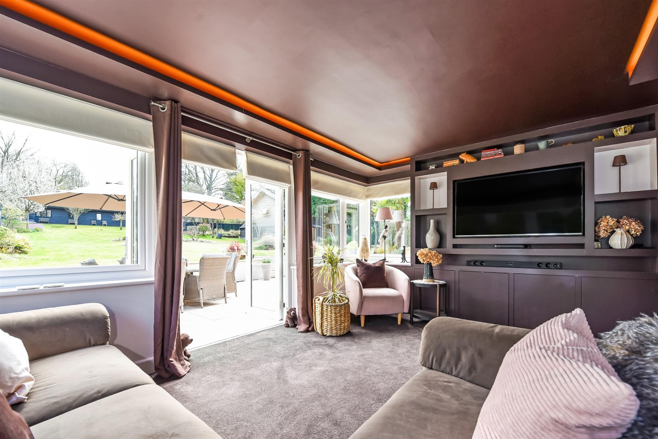 A lovely and bright triple-aspect room. Bespoke blinds. Perfect for entertaining. Double doors to the patio. Media wall with fitted TV.