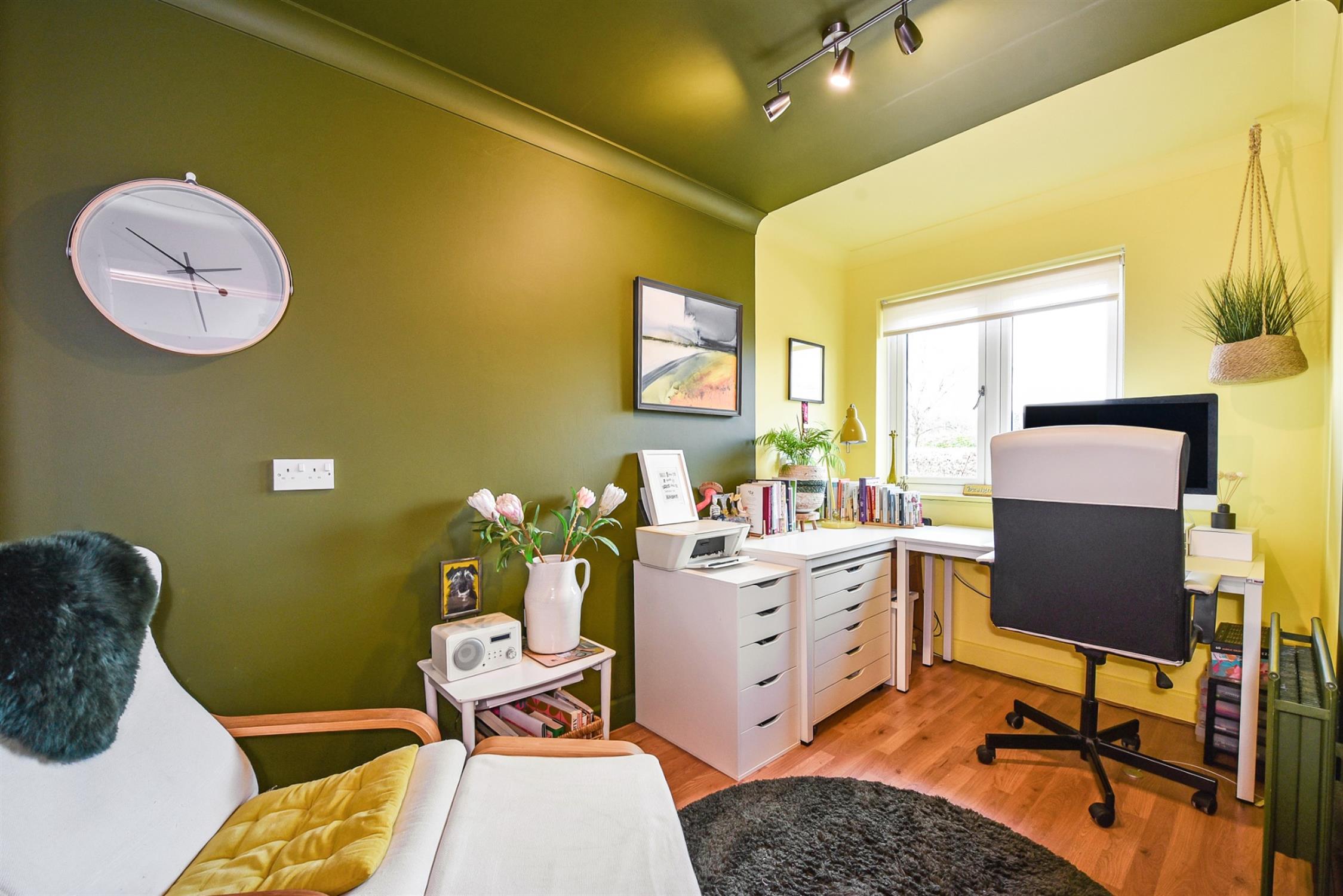 Half of the garage has been converted into a versatile studio space with ample fitted storage. It could serve as a workshop/craft room/studio etc… the other half is a very useful storage space with room for a large car. Access to the boarded and generously-sized loft above the garage is via a pull down loft ladder, allowing easy access to extensive storage options.