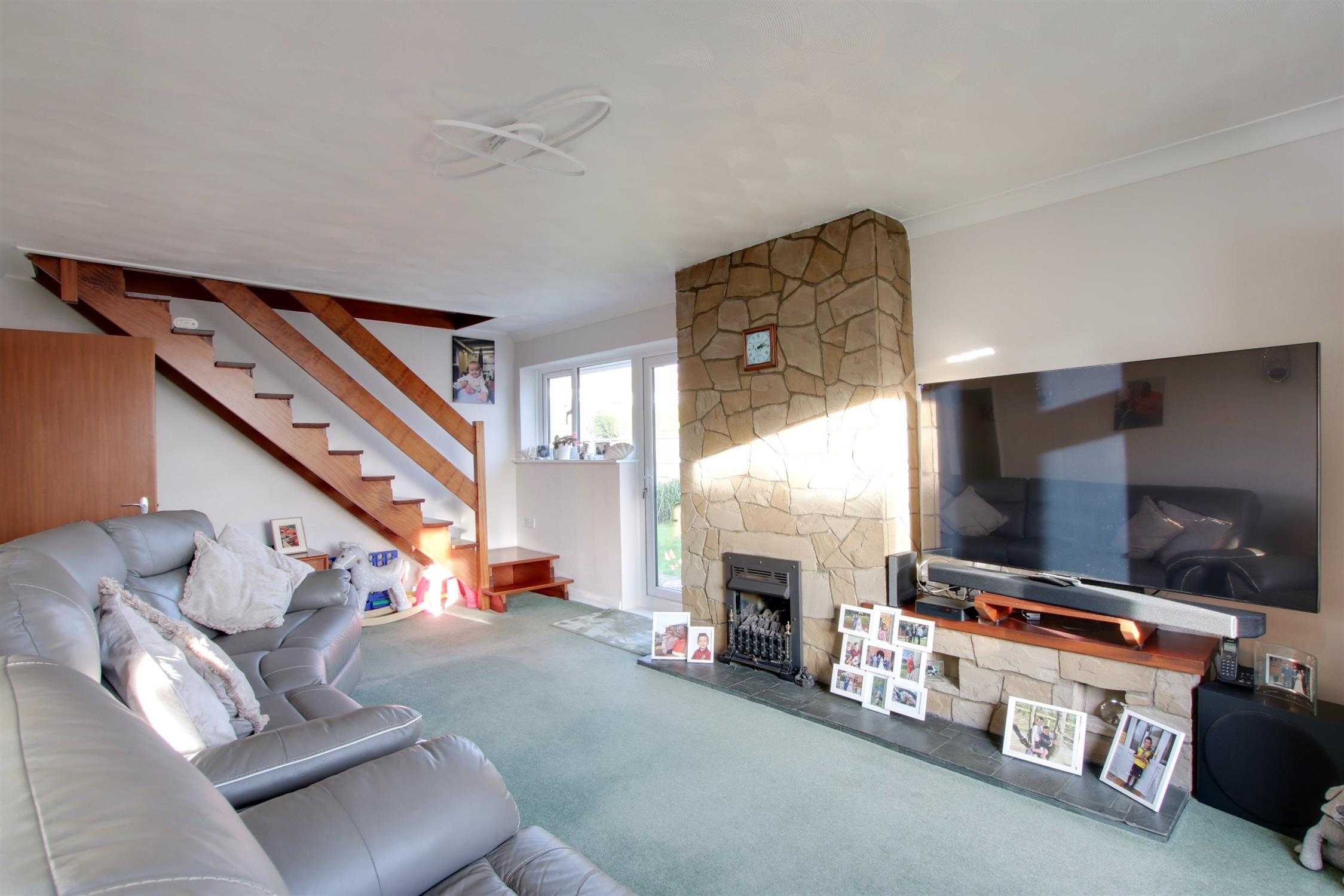 Double glazed window to front elevation and double glazed door and window to rear garden. Staircase to first floor. Chimney breast with coal effect gas fire. Coved and textured ceiling. Door to inner hallway and wide opening to: