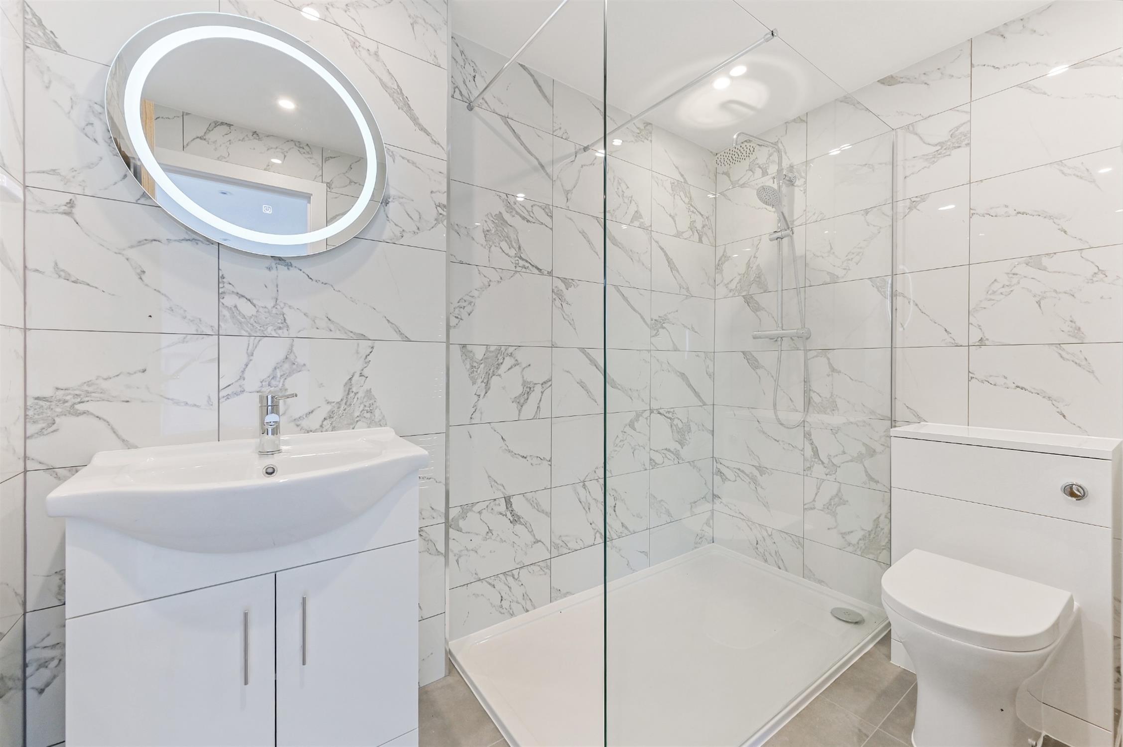 Smooth ceiling, inset spotlights, extractor fan, walk in shower cubicle, low level WC, wash hand basin with cupboards beneath, ladder radiator, LED lit mirror, marble effect porcelain tiled walls, tiled floor.