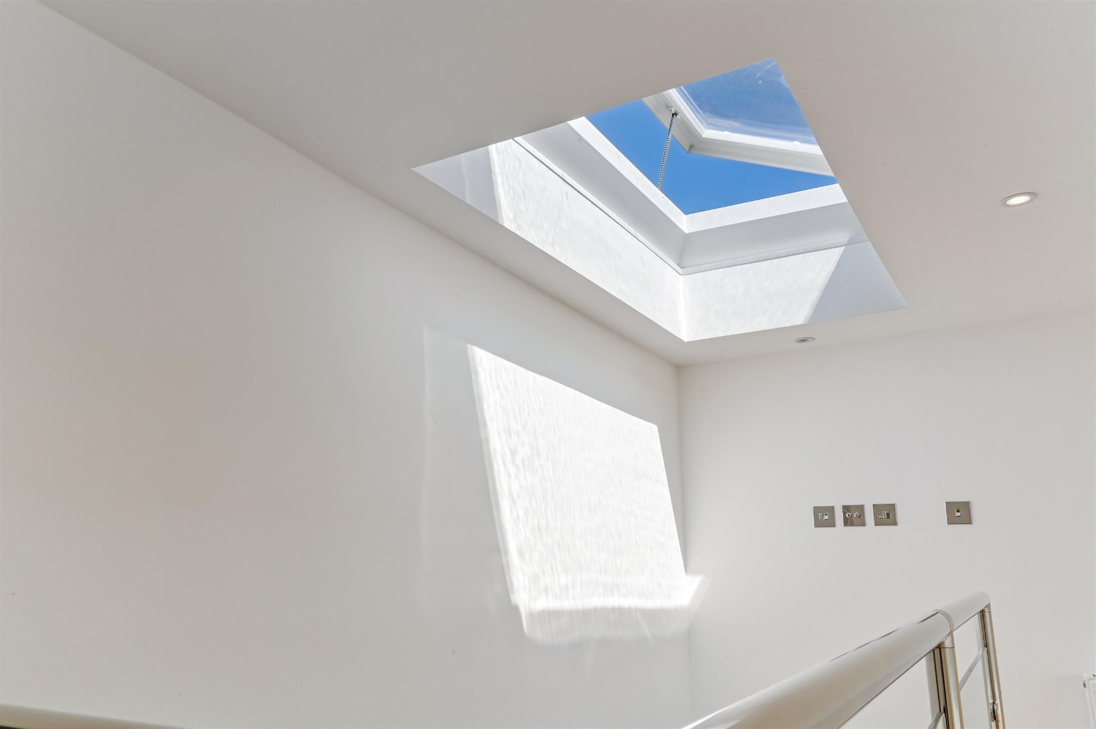 Smooth ceiling, inset spotlights, double glazed windows and double doors onto balcony, opening roof lantern window, two radiators, wood flooring, door to;